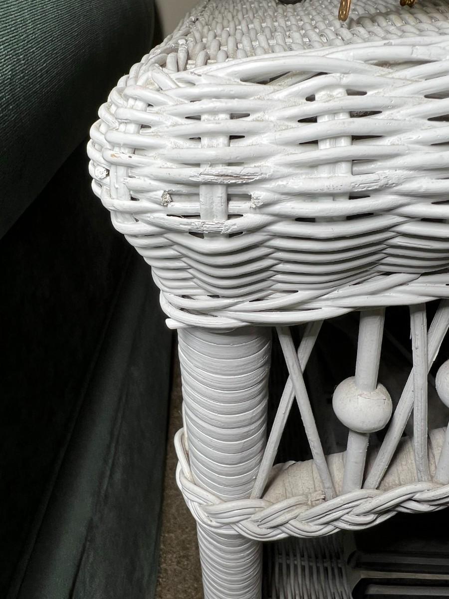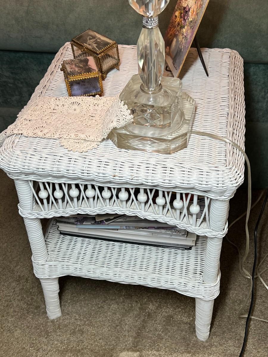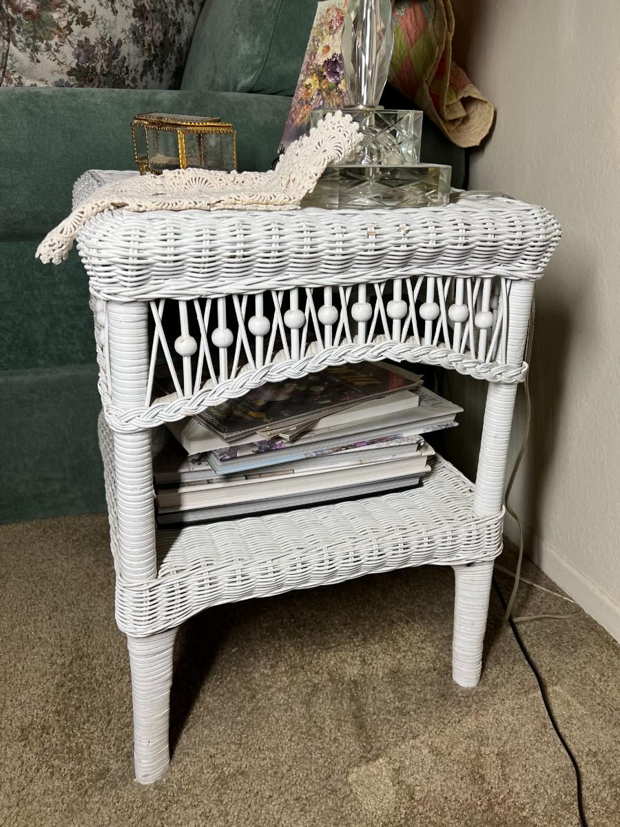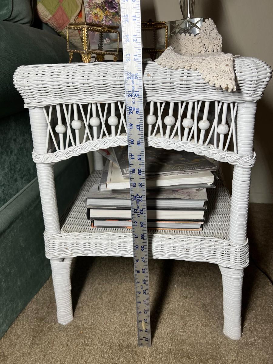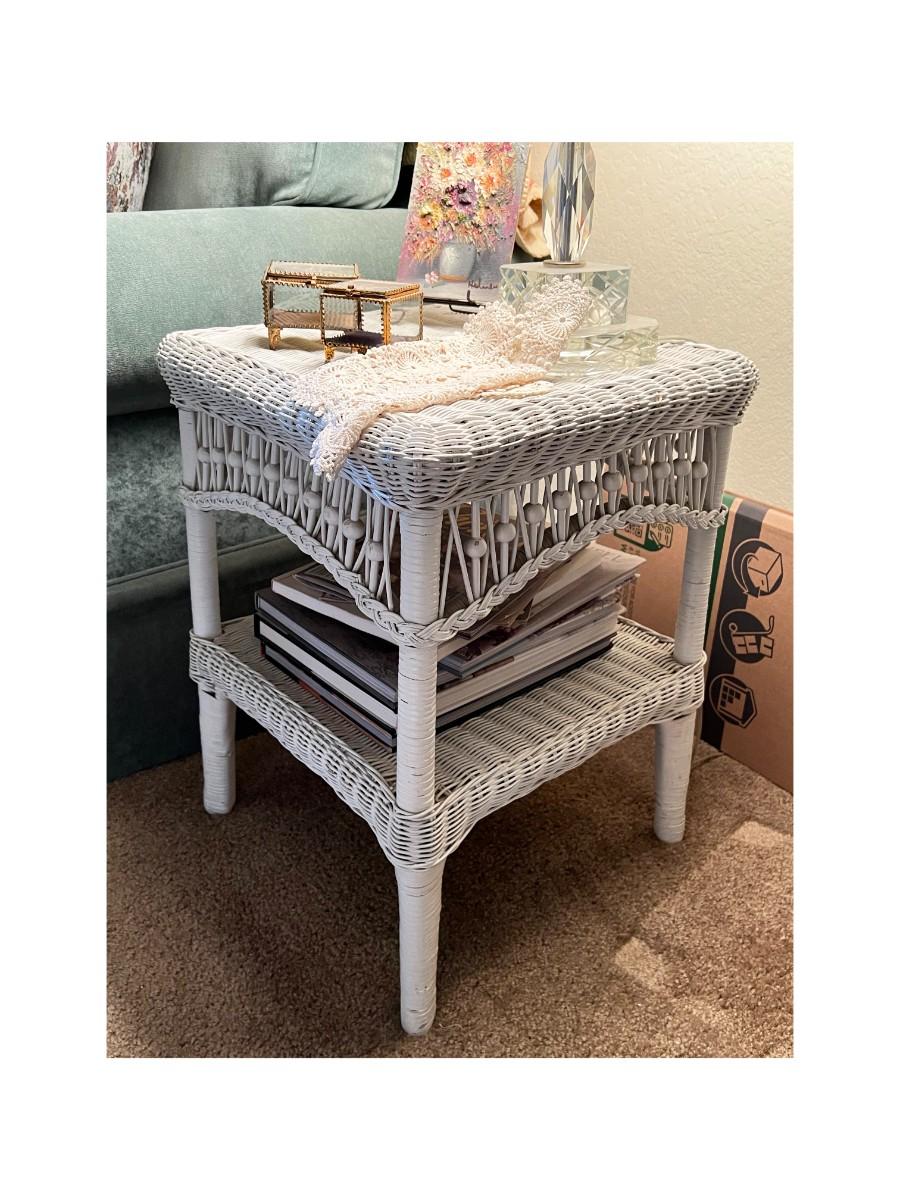 Vintage White Wicker Rattan End Side Table. In good condition, has been used inside. About 23" tall. **Currently off site in Brea, owner downsizing. Pick up will be after July 14th, we will schedule with winning bidders after that date.**