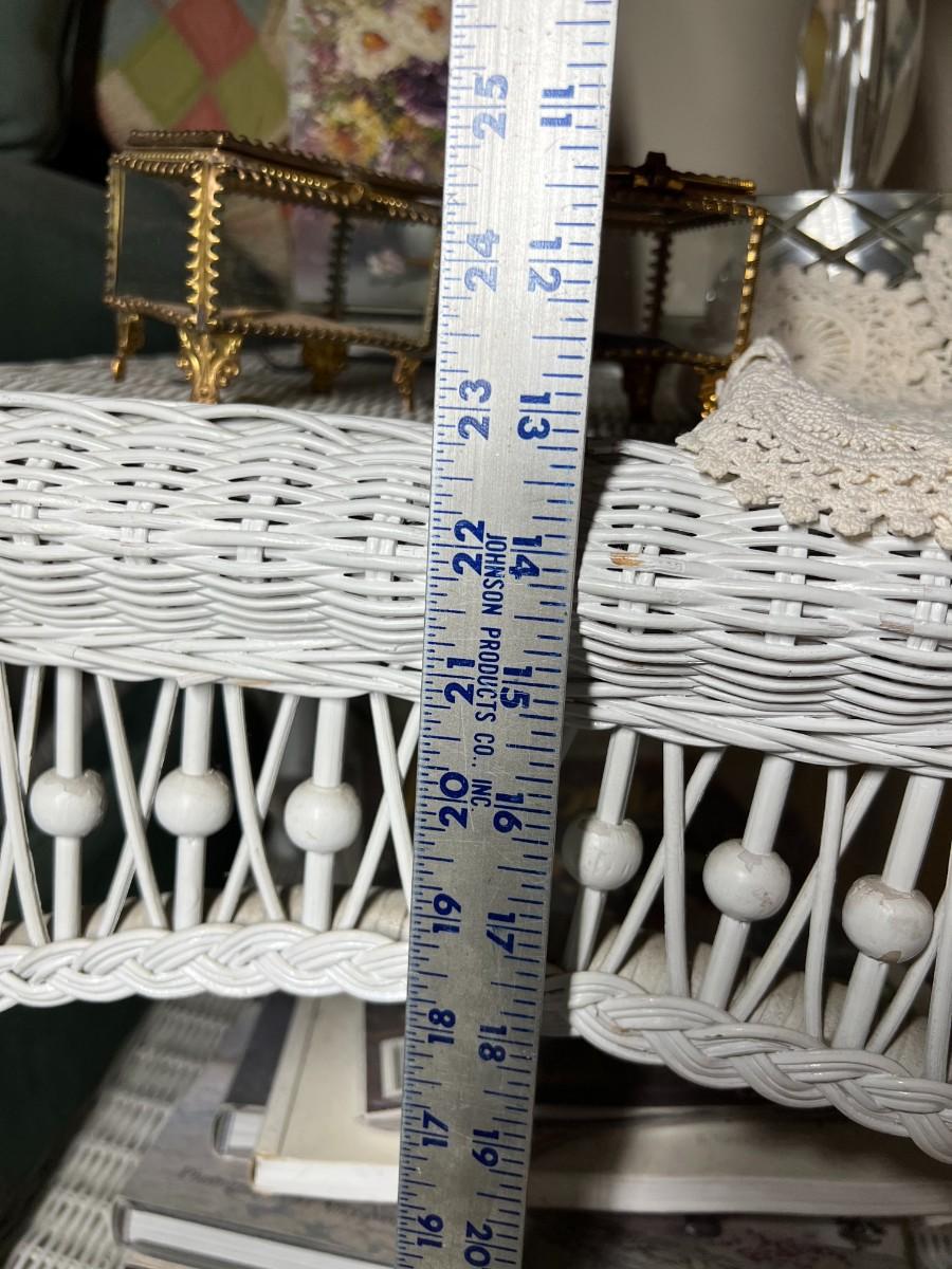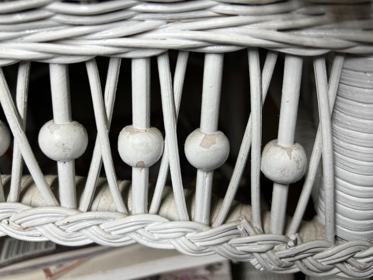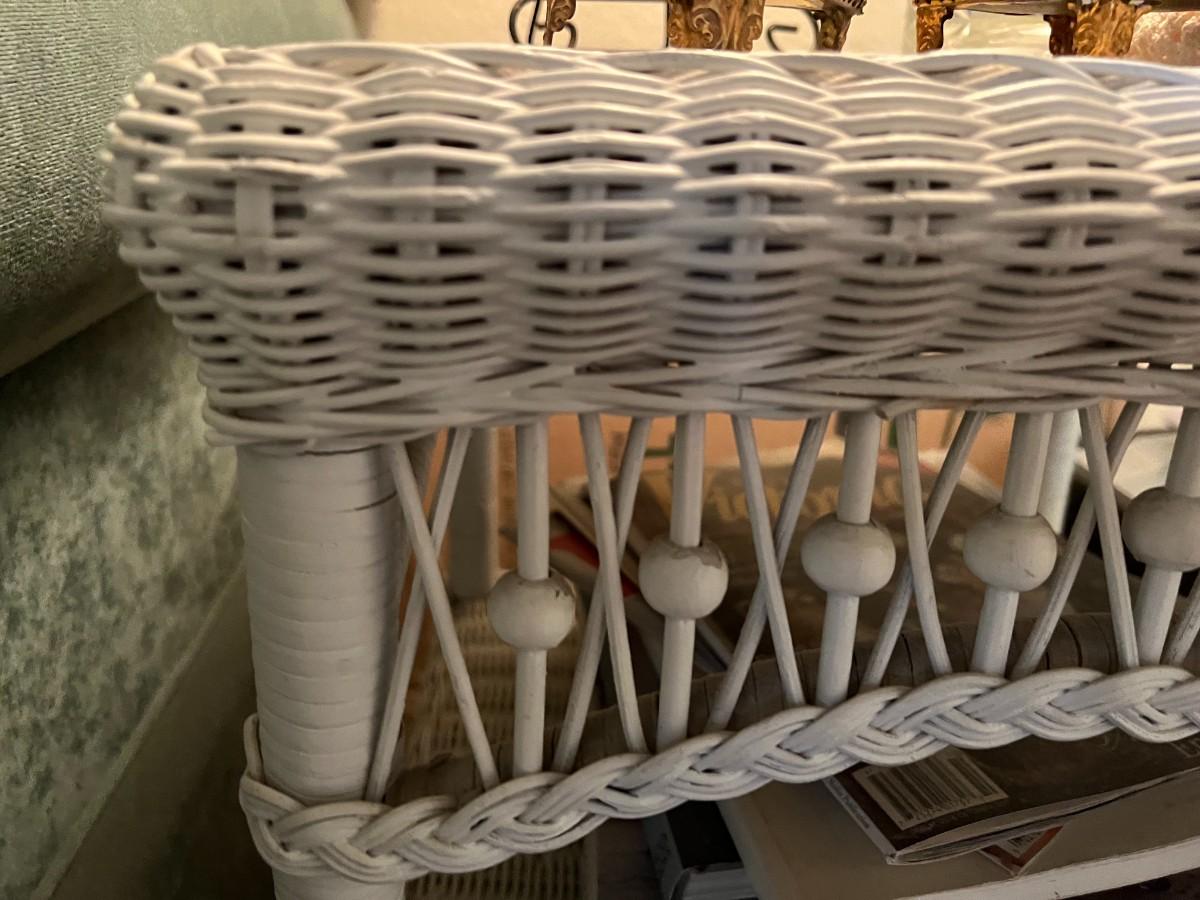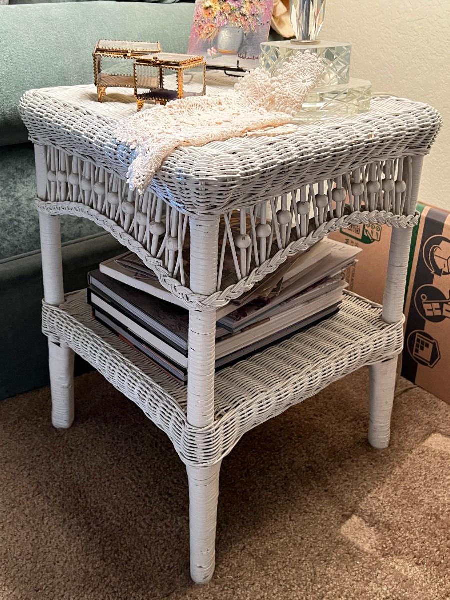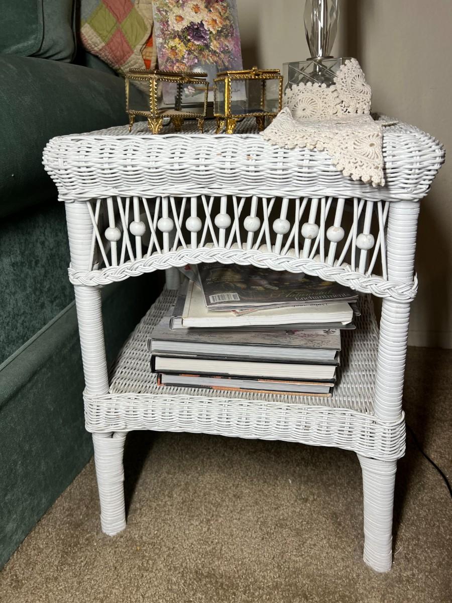 Vintage White Wicker Rattan End Side Table. In good condition, has been used inside. About 23" tall. **Currently off site in Brea, owner downsizing. Pick up will be after July 14th, we will schedule with winning bidders after that date.**