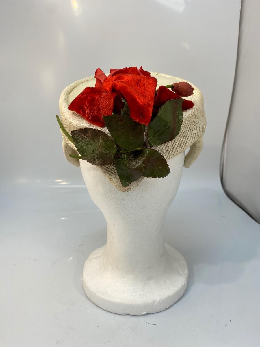 Vintage White Wool Skull Cap Fascinator Cloche Hat with Faux Red Flower Detail