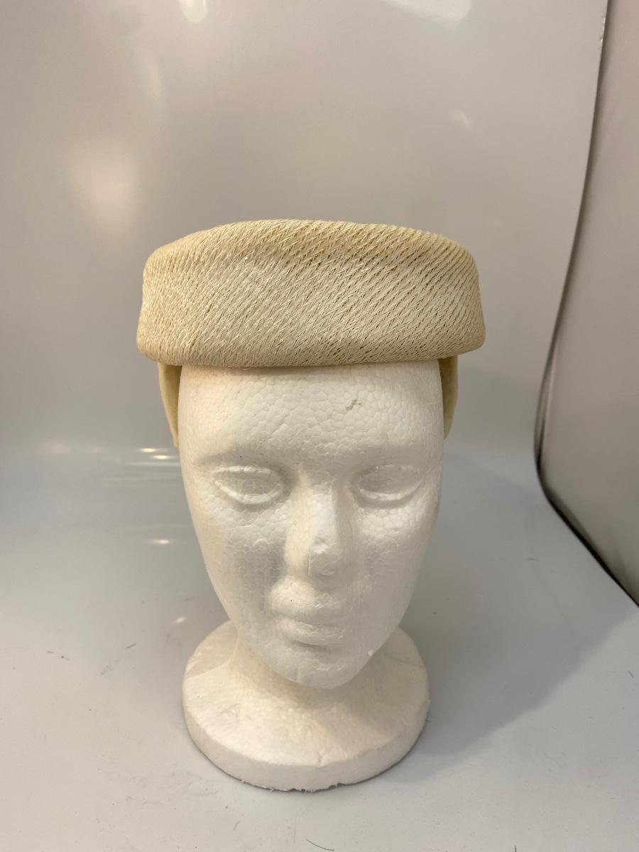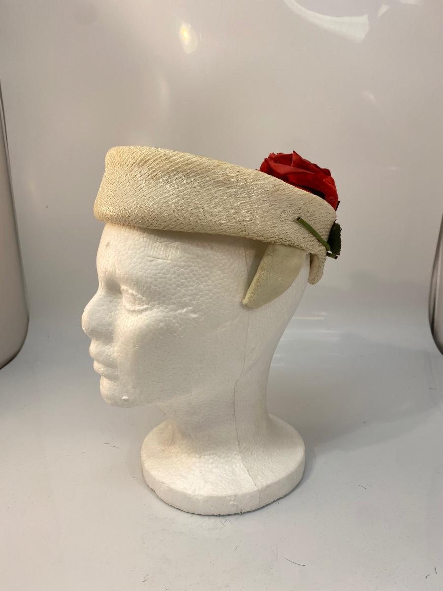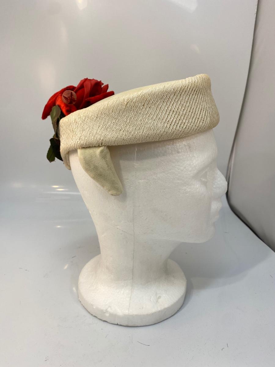 Vintage White Wool Skull Cap Fascinator Cloche Hat with Faux Red Flower Detail. In good vintage condition, there is discolor from age. No holes. May need to be reshaped a bit from storage.