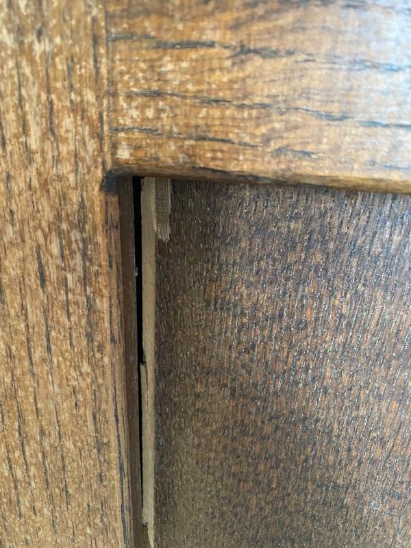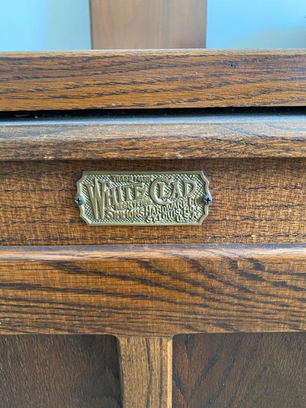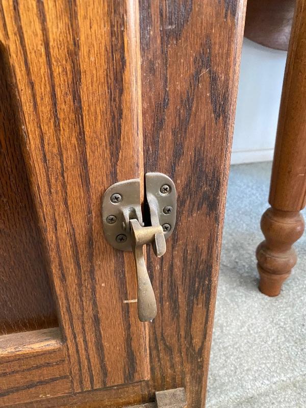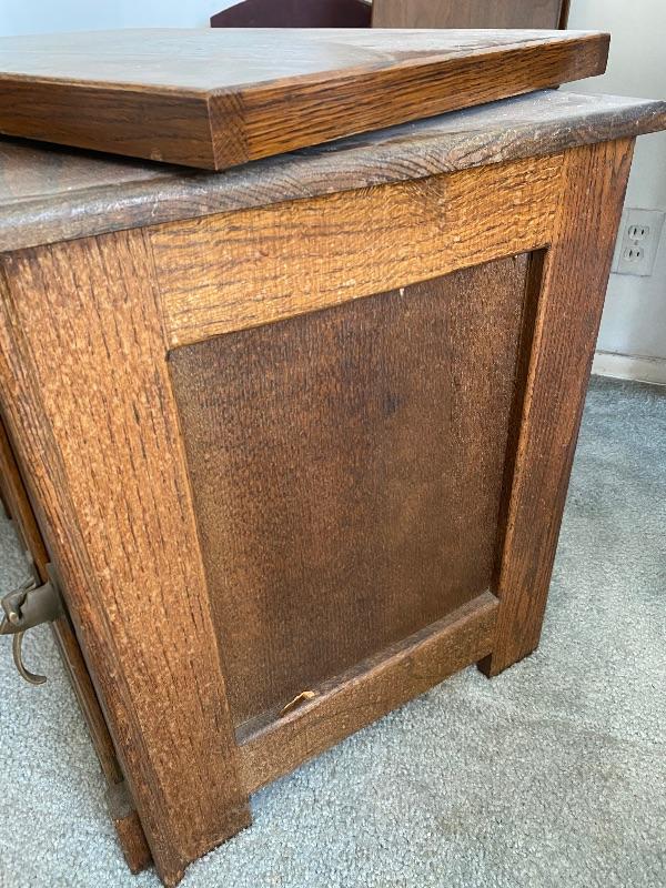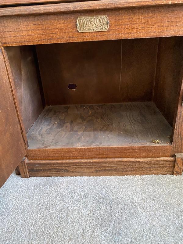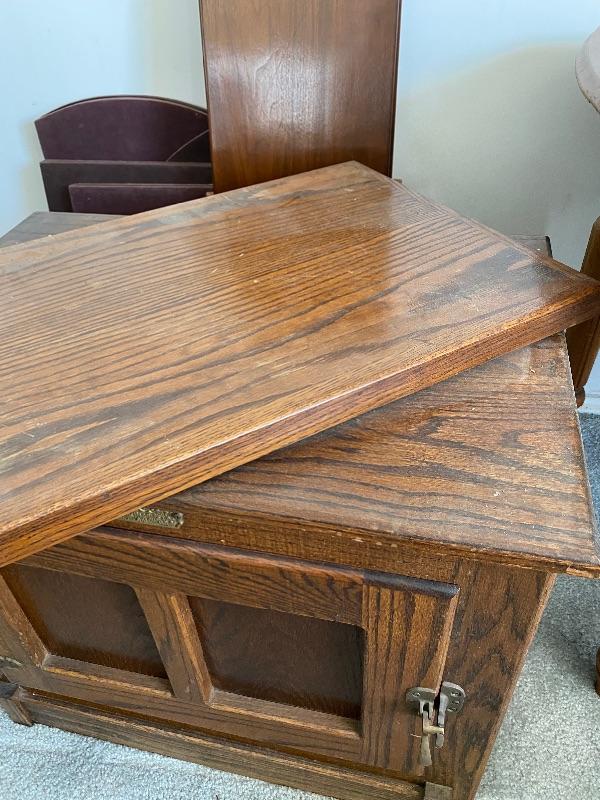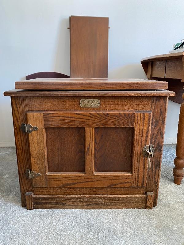 Oak White Clad Wood Ice Box Table. Single door front. Has a lazy susan top that turns nicely. The side panel on the right is loose and needs to be renailed or glued, only noticeable when you push the side. Measures roughly 28x19x24.