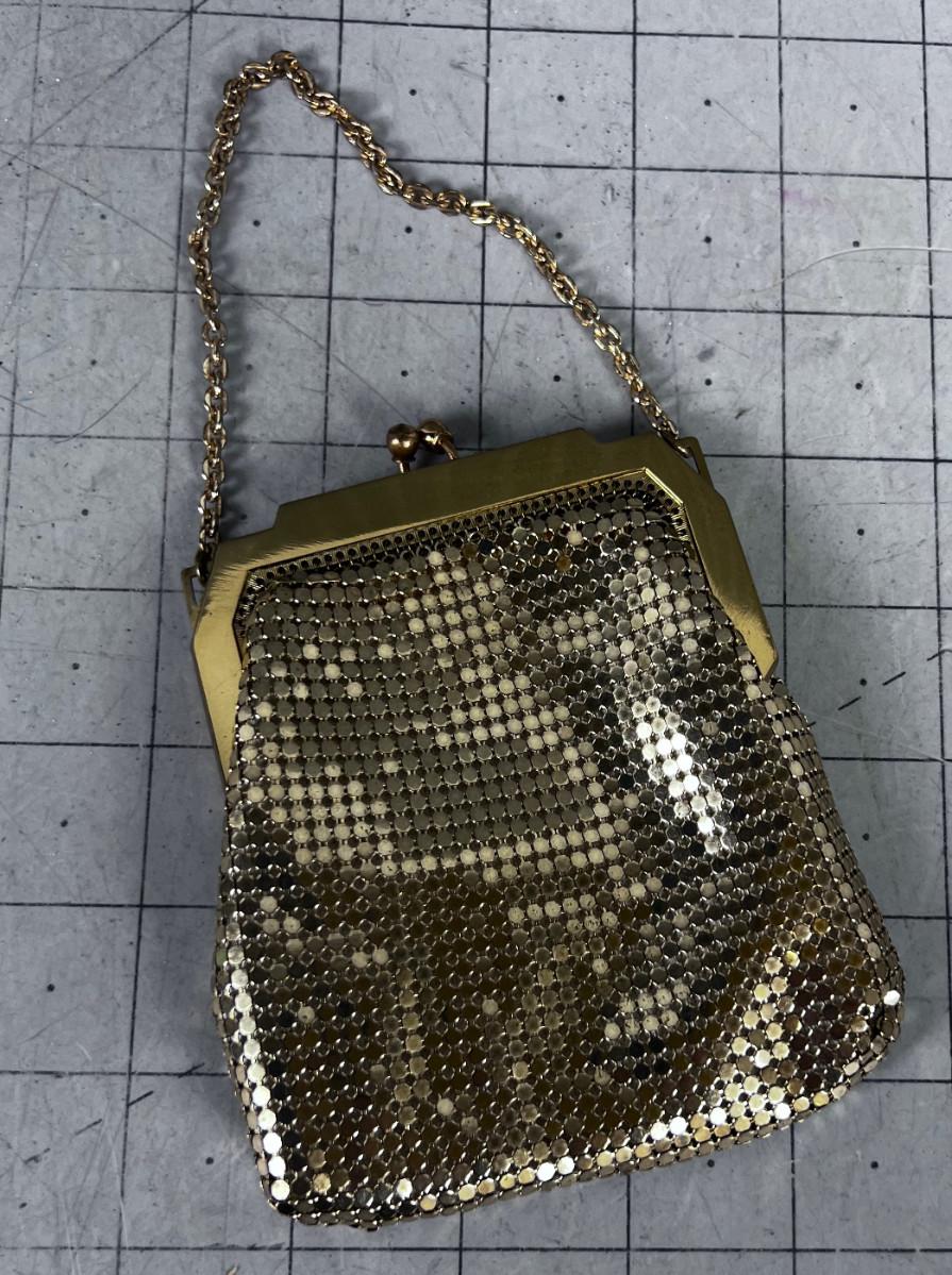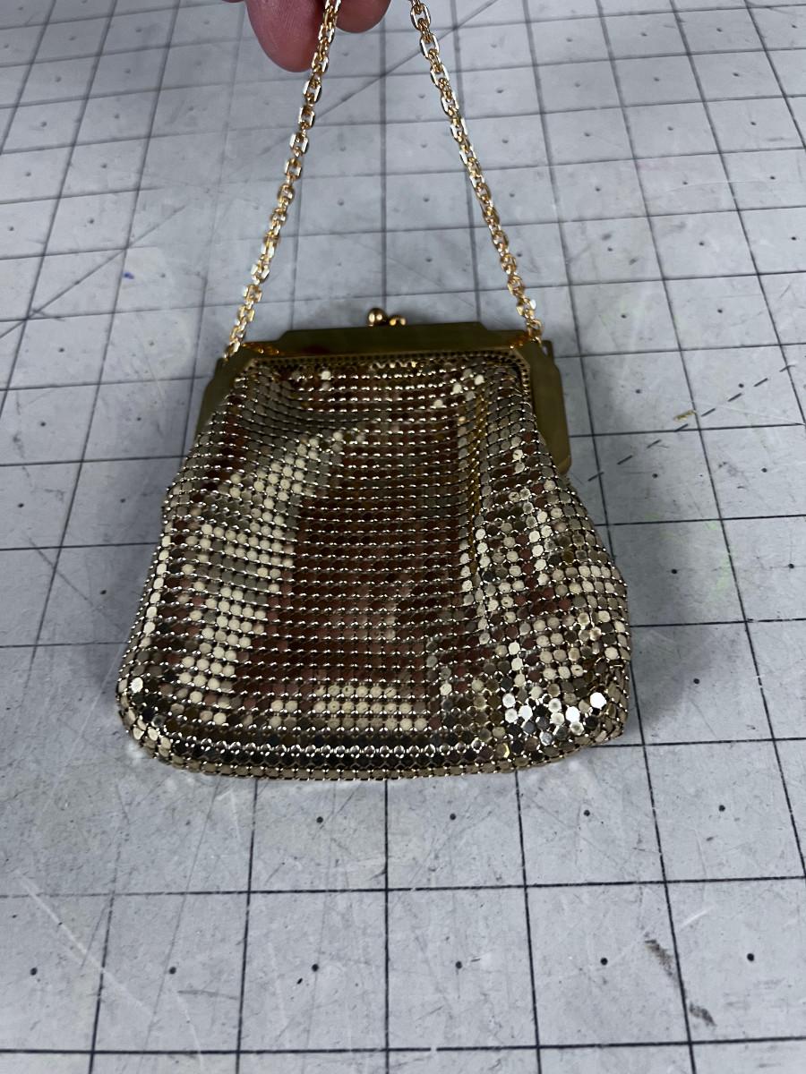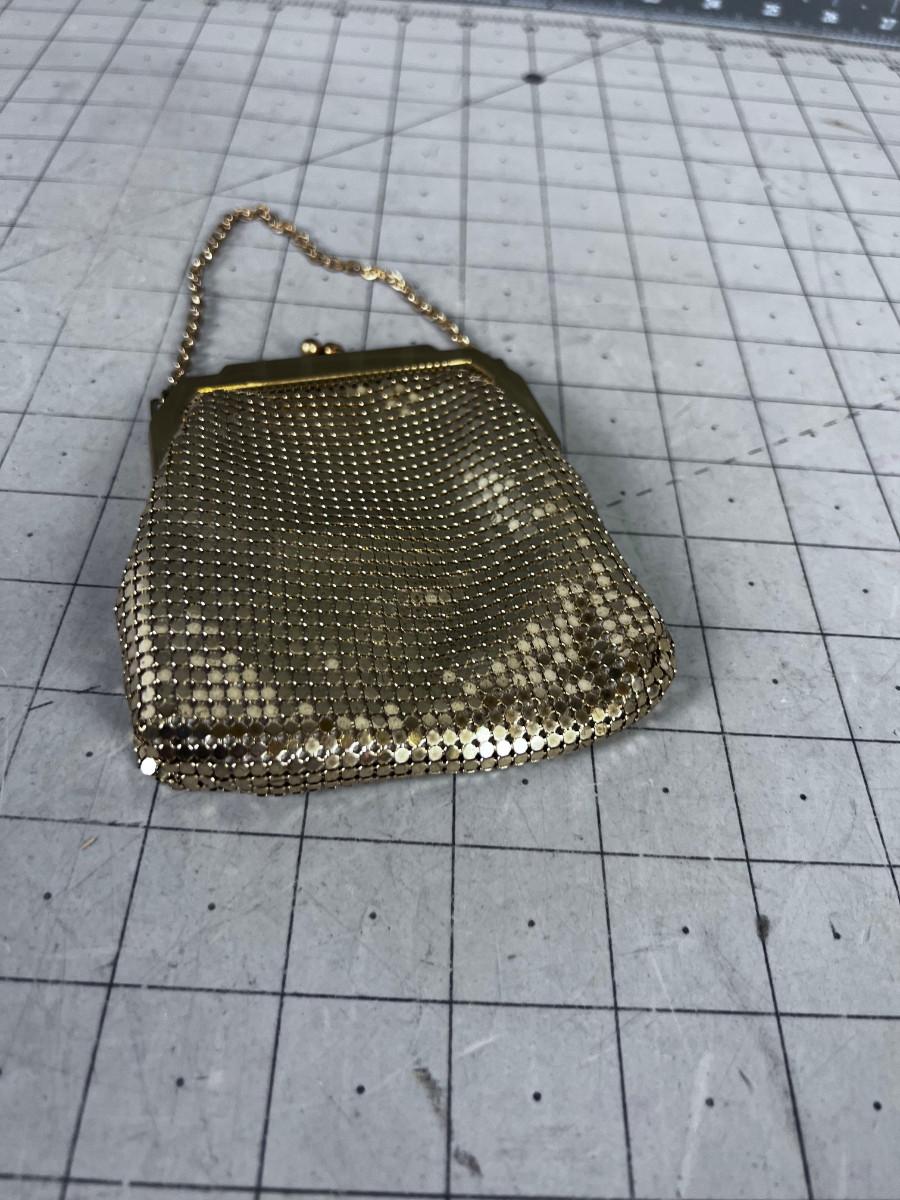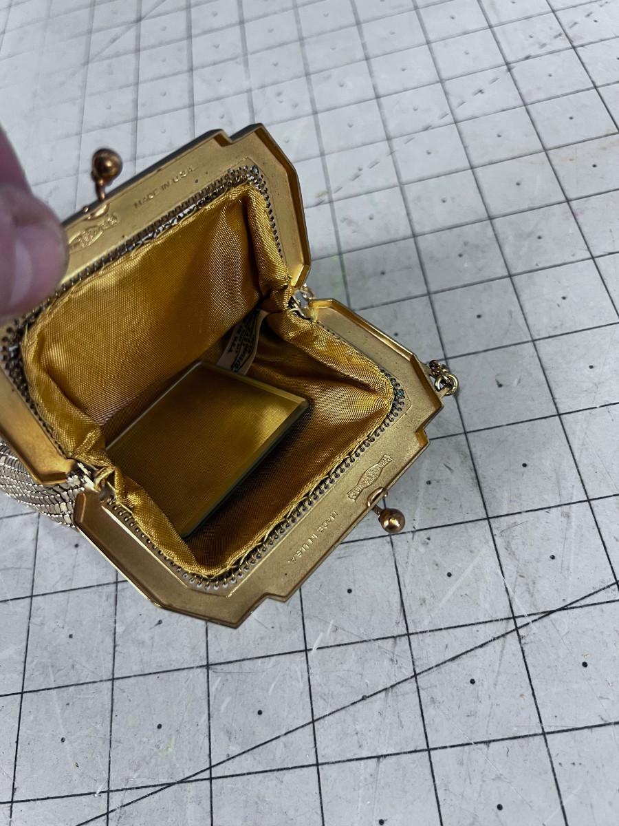 COLLECTIBLE Good Condition for age. Measures 4" Wide X 5" Tall UNIQUE! Excellent condition on this vintage gold mesh evening bag from the Whiting & Davis Company. The shimmering sheets of alums...Lined material...approx. 4.5" high by 4" wide...3.5" drop on the chain handle...Clearly hallmarked. Made in the USA...I believe this one is postwar...1950's or 60's...but I am no expert on these accessories...This glamorous bag contained a small vanity mirror