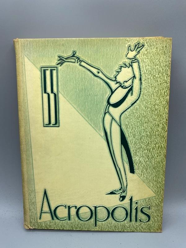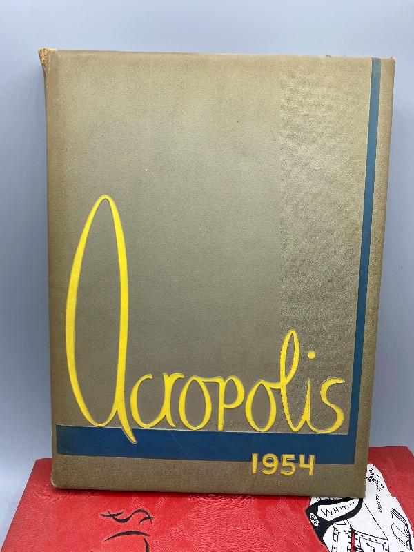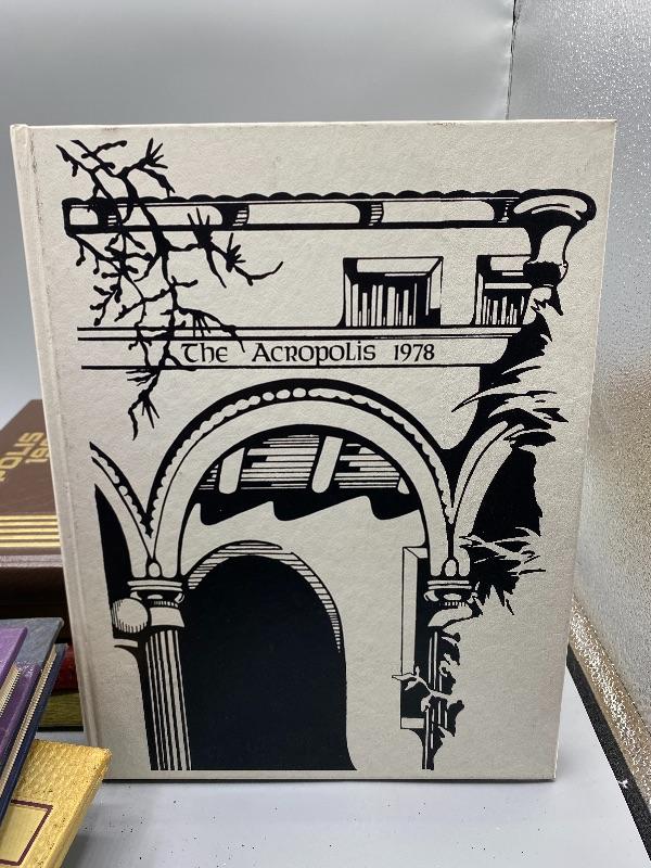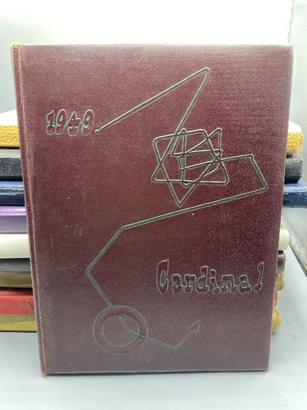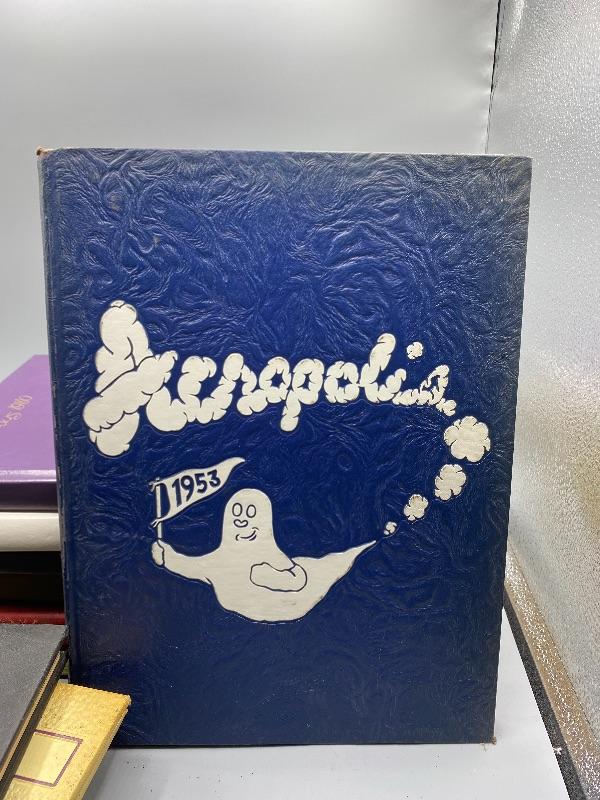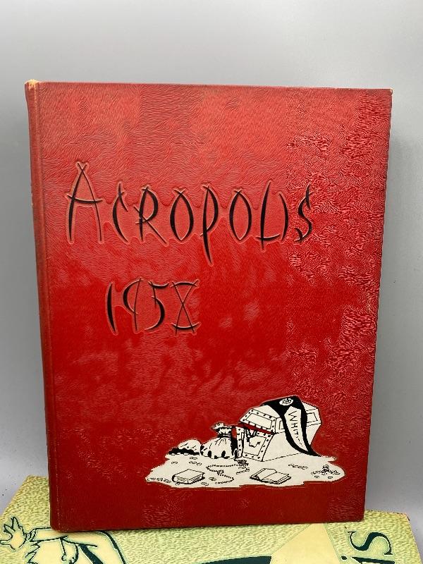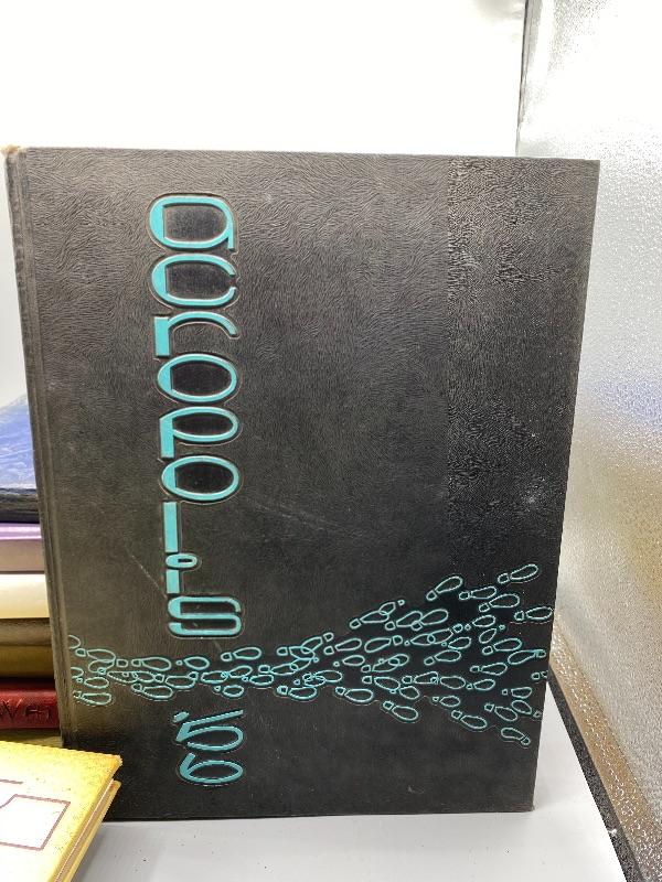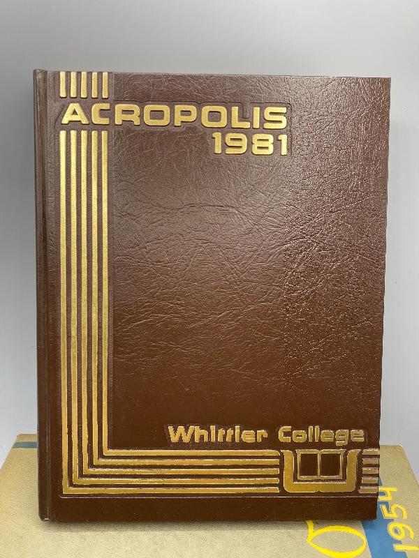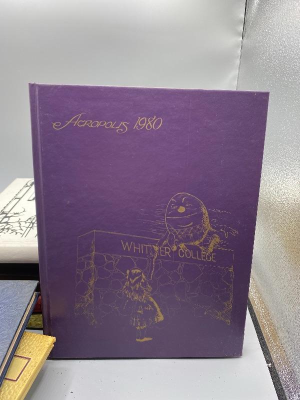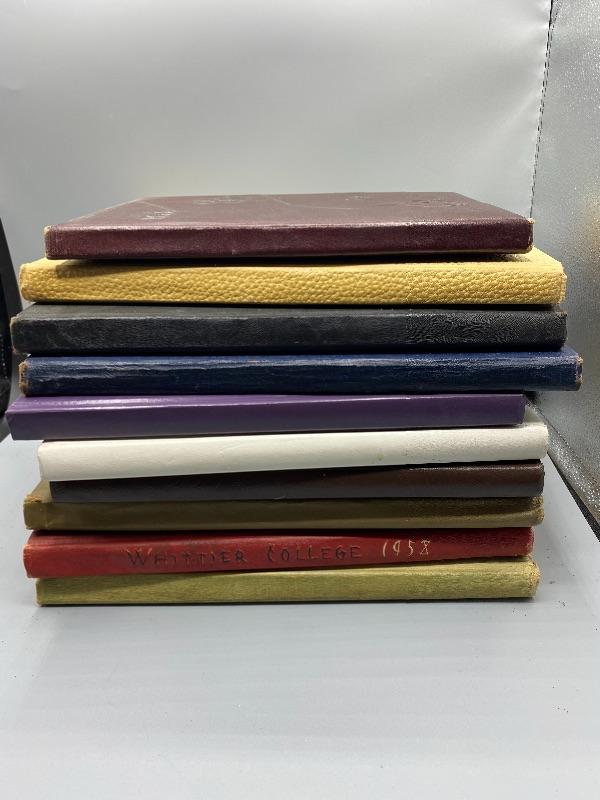 Set of 9 Whittier College and one Whittier High School yearbooks. From the 1950s and late 1970s/ early 1980s. May have writing inside, creased pages, wear to edges.