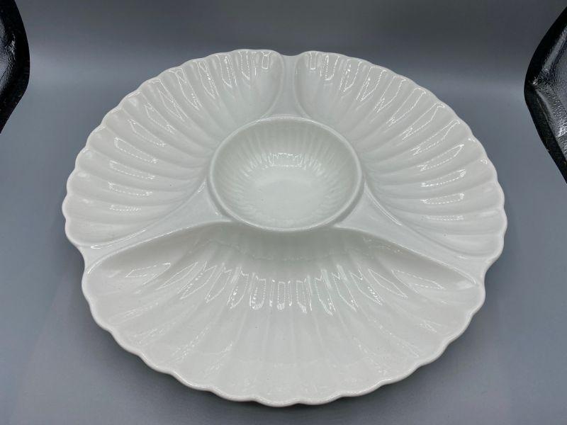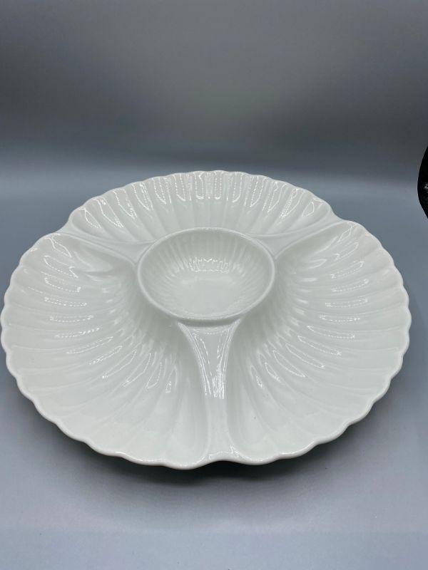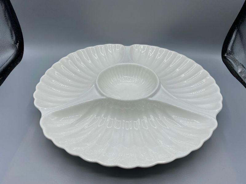 Beautiful Whittier Pottery scalloped serving tray. Divided into three sections with a center bowl use for chips and dip, vegetables, cheese and crackers, many possibilities. Great condition, no chips.
