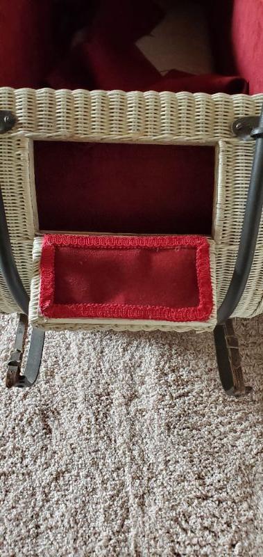 This sweet antique wicker baby buggy is in great condition for its age. It has been reupholstered in a red velvet. It has a small built in storage area and spring suspension. The wheels are intact and spin freely. The canopy slides forward and back but it not attached. The hardware is included. It measures, 45" x 22" and is 27" tall.