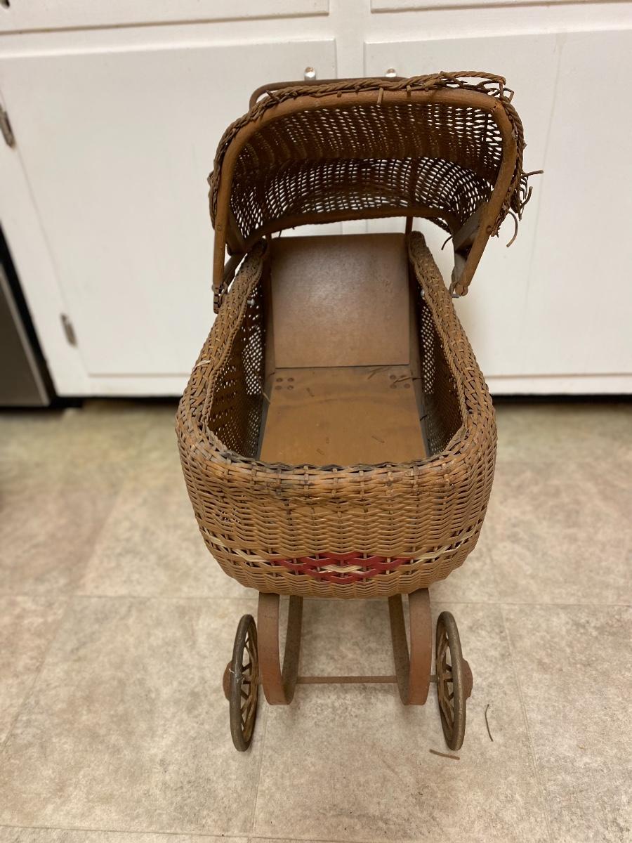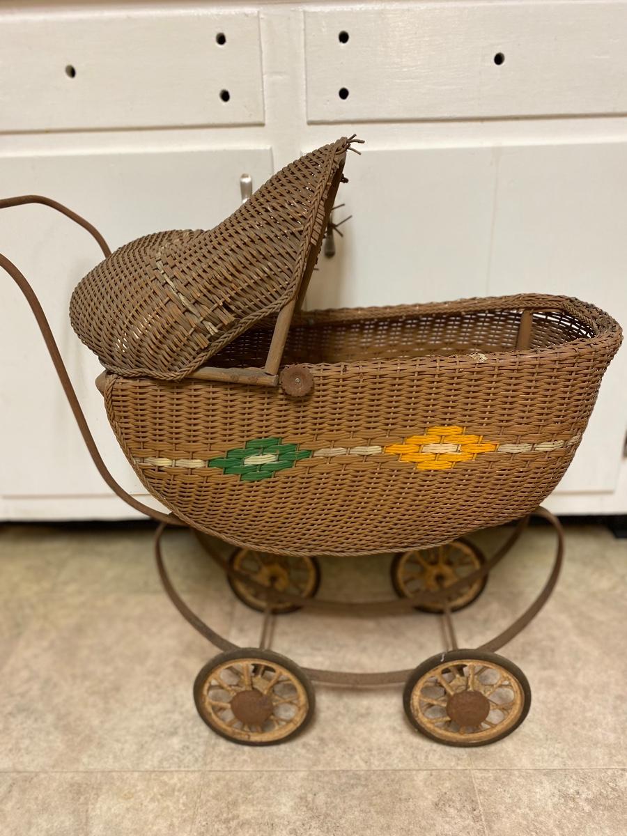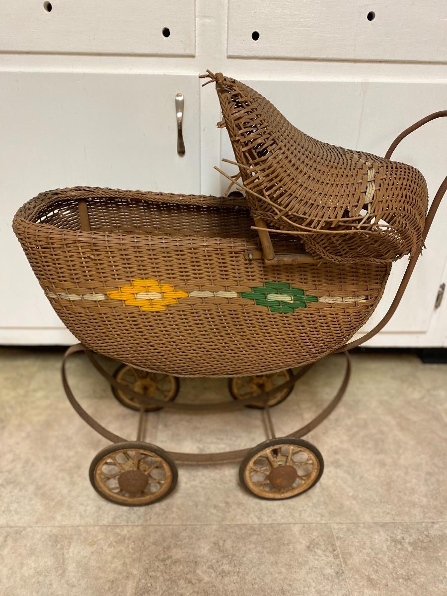 Vintage wicker baby doll stroller, needs repair. See photos.