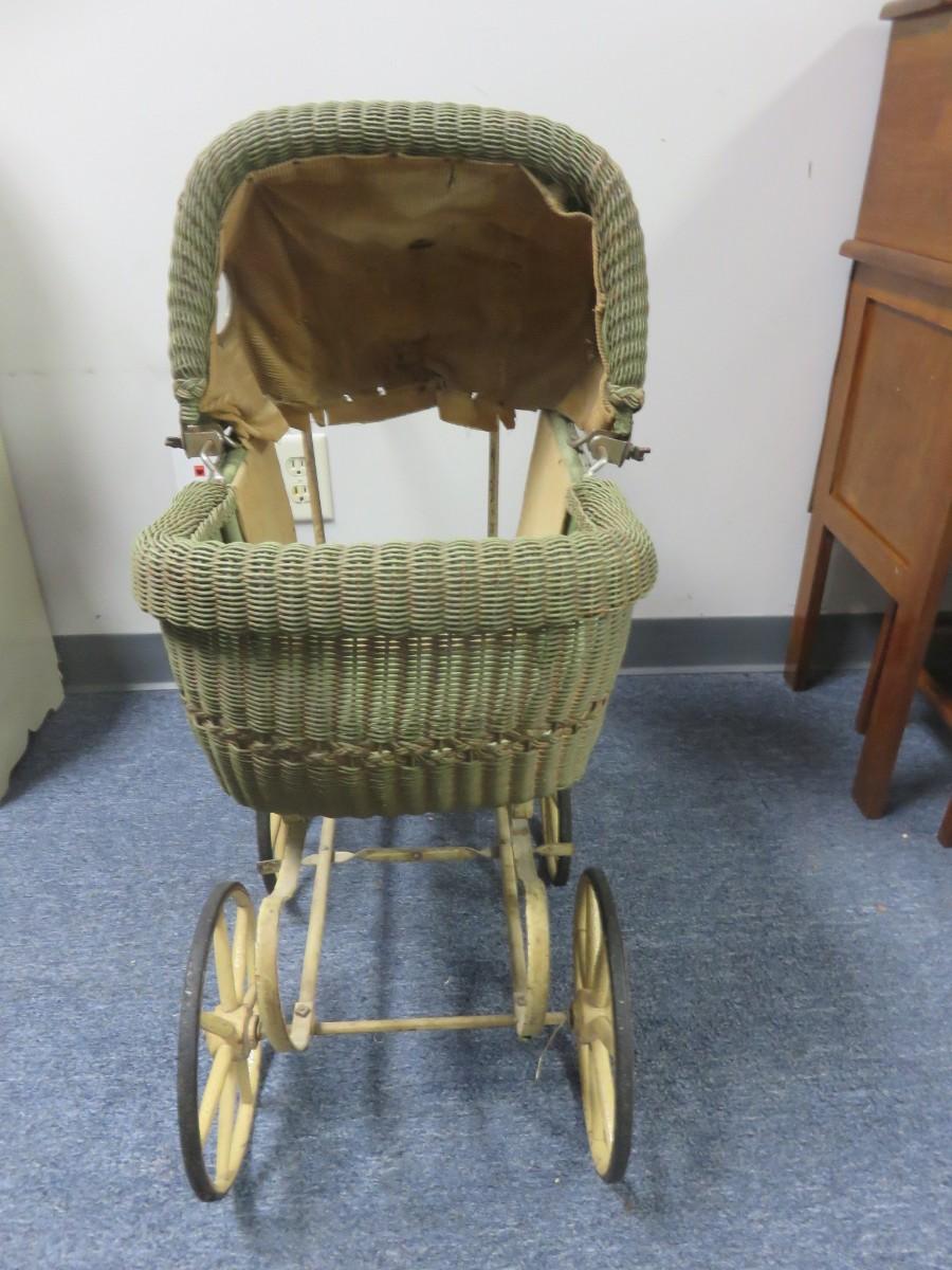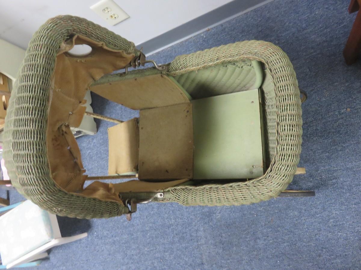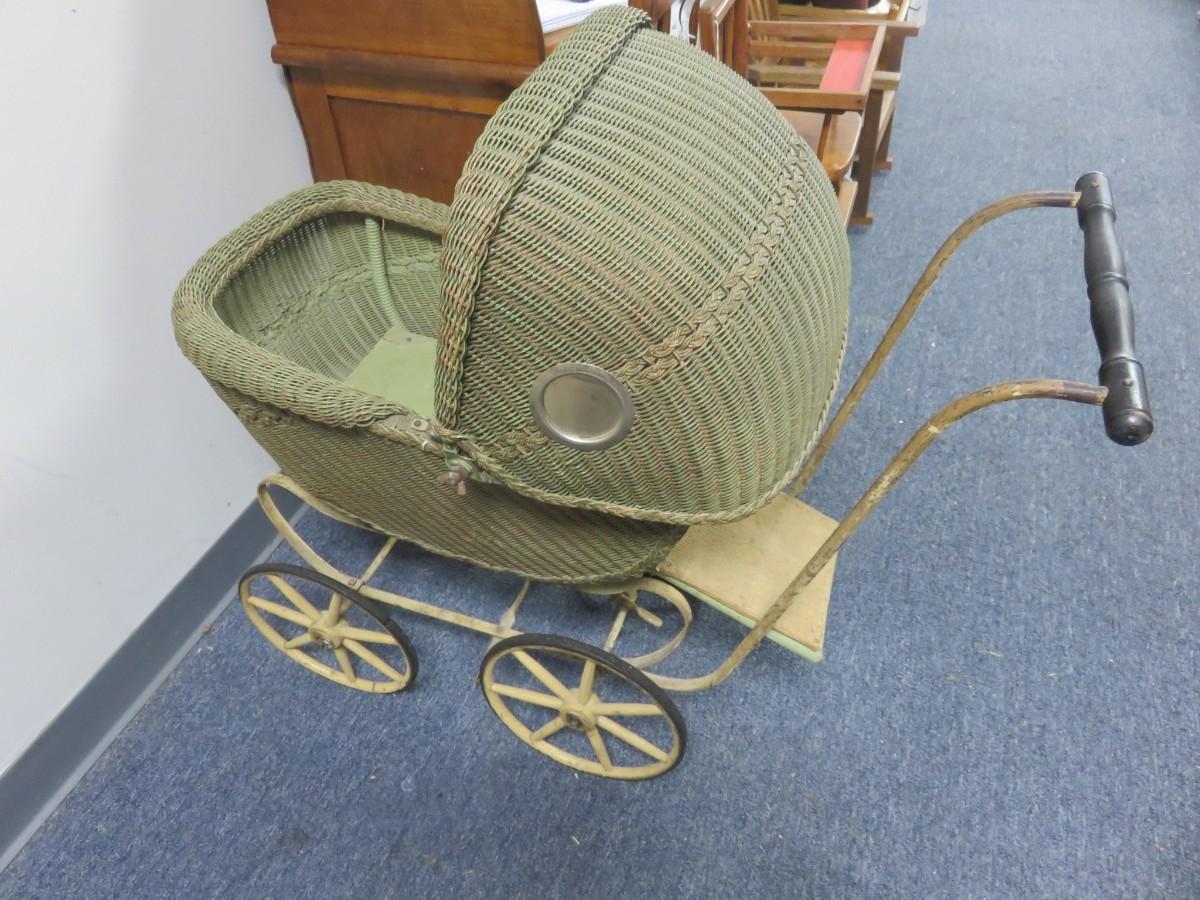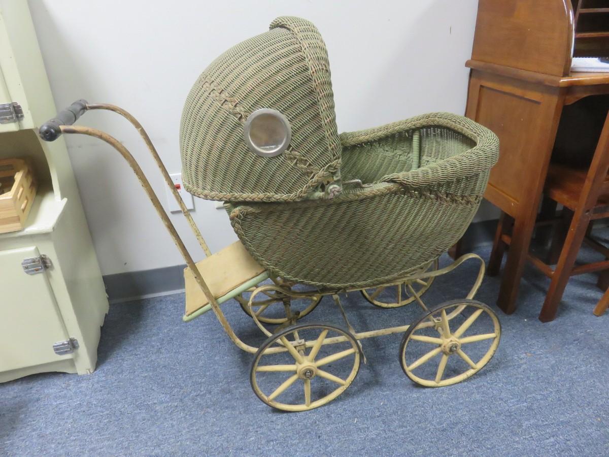 Vintage Wicker Baby Stroller with Round Glass Side Window - Wicker part measures 22 x 16 inches