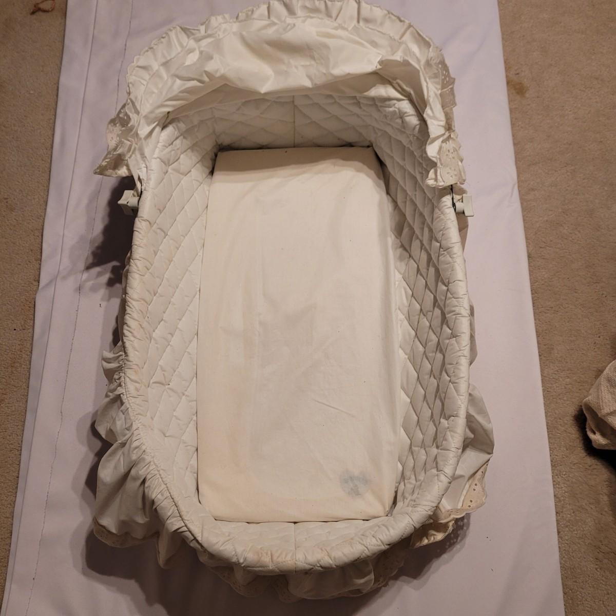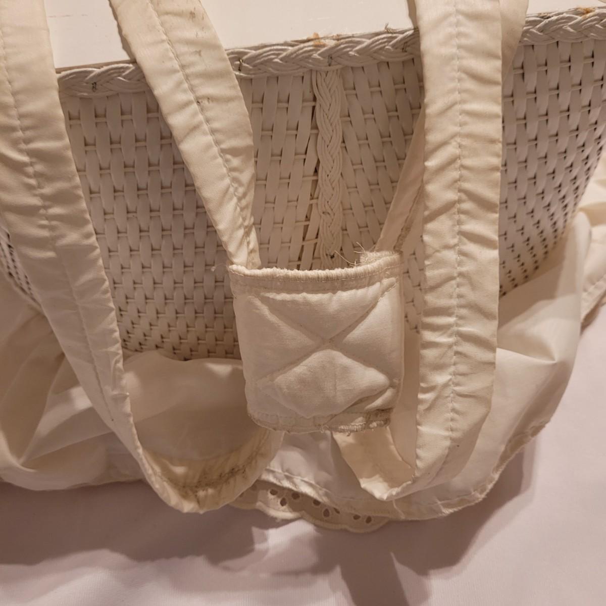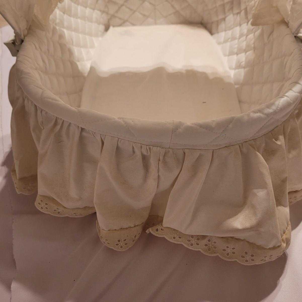 This vintage wicker bassinet has a quilted cover, retractable shade and removable pad. Measures approximately 20" x 32" x 10"H. Shipping available.