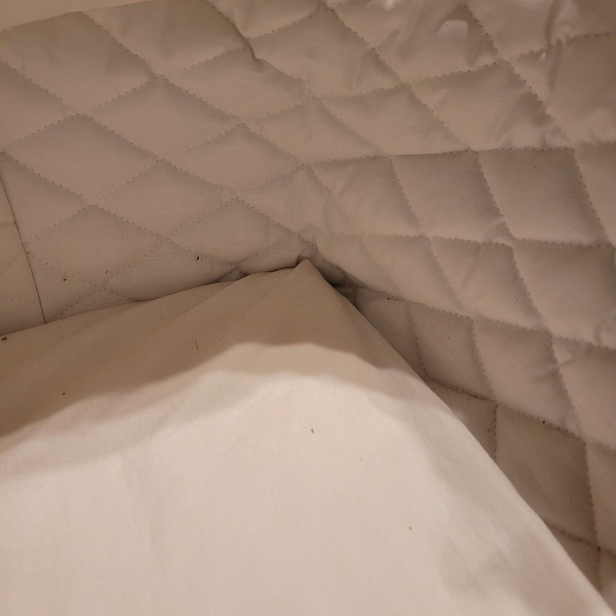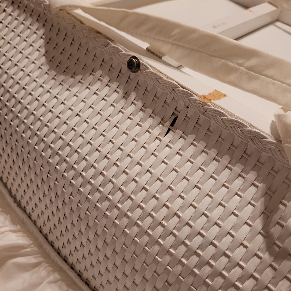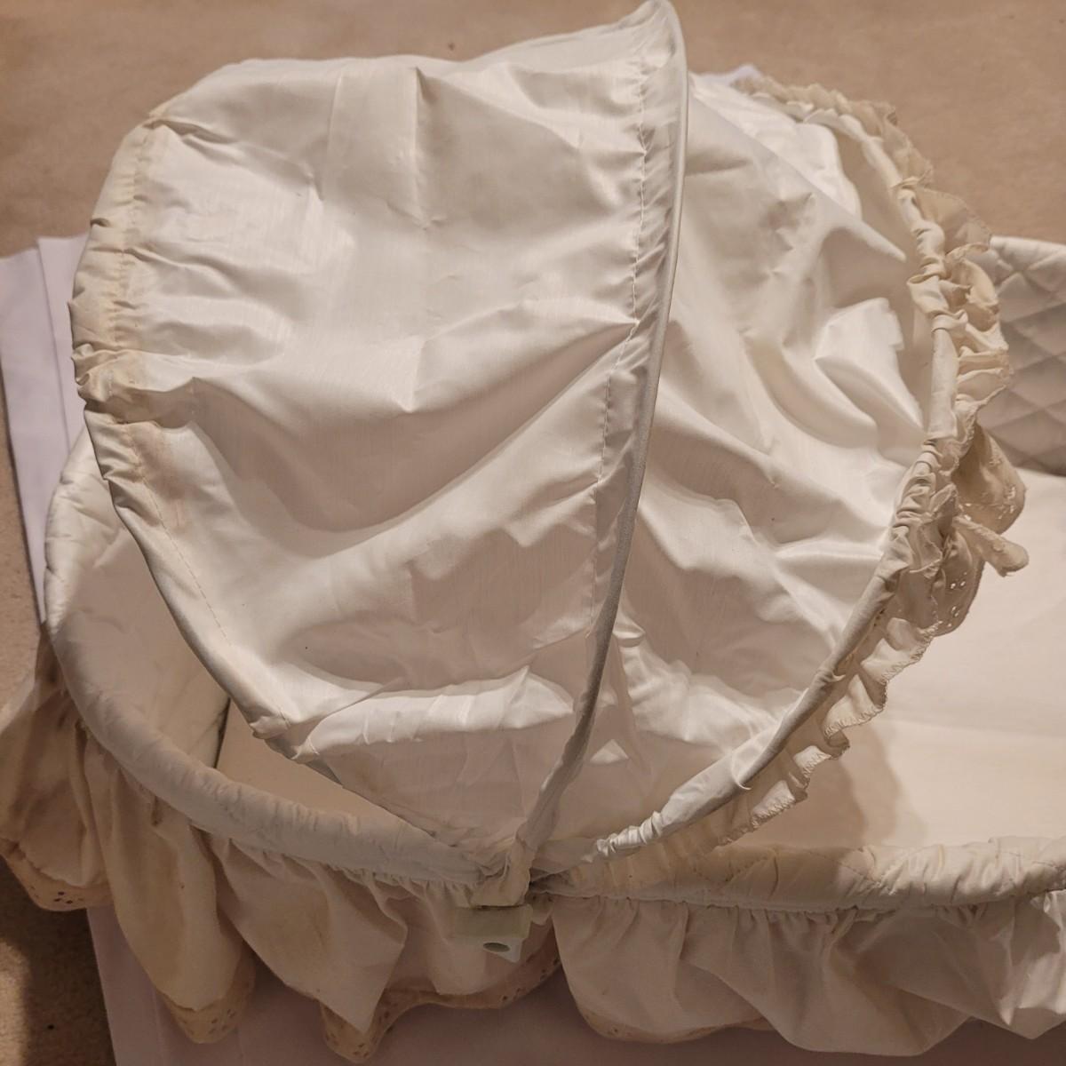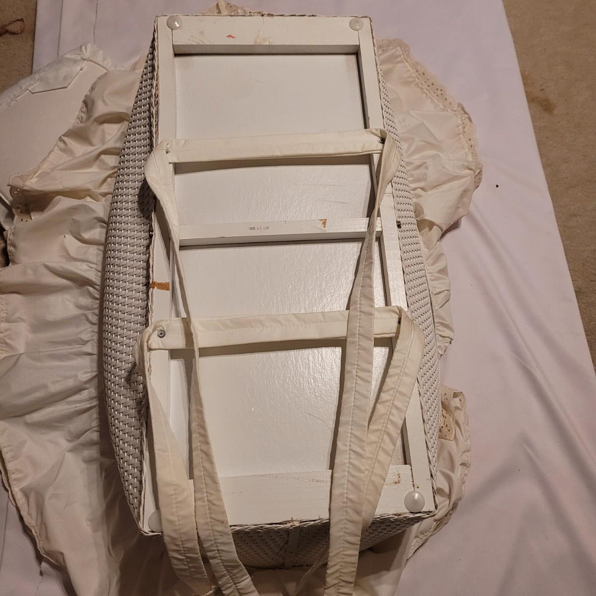 This vintage wicker bassinet has a quilted cover, retractable shade and removable pad. Measures approximately 20" x 32" x 10"H. Shipping available.