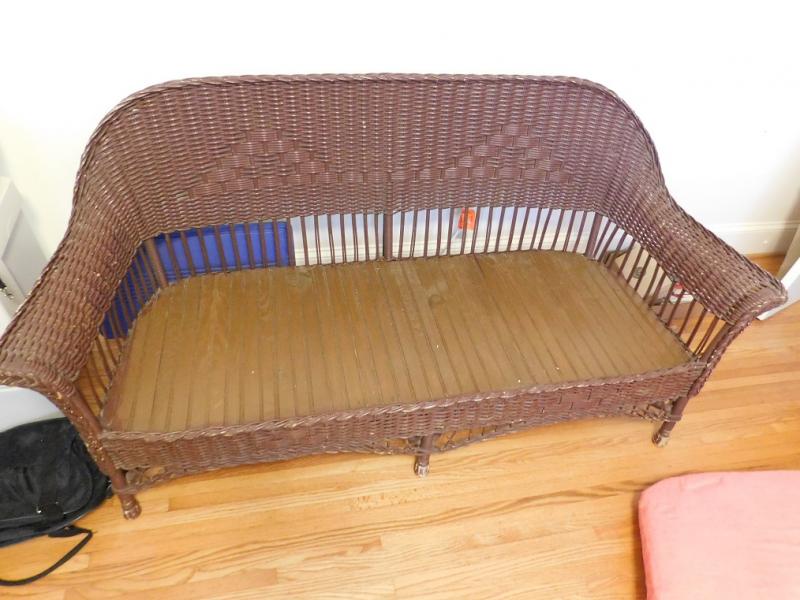 Vintage Wicker Couch Pictured with Cushions has some wear issues but in usable condition