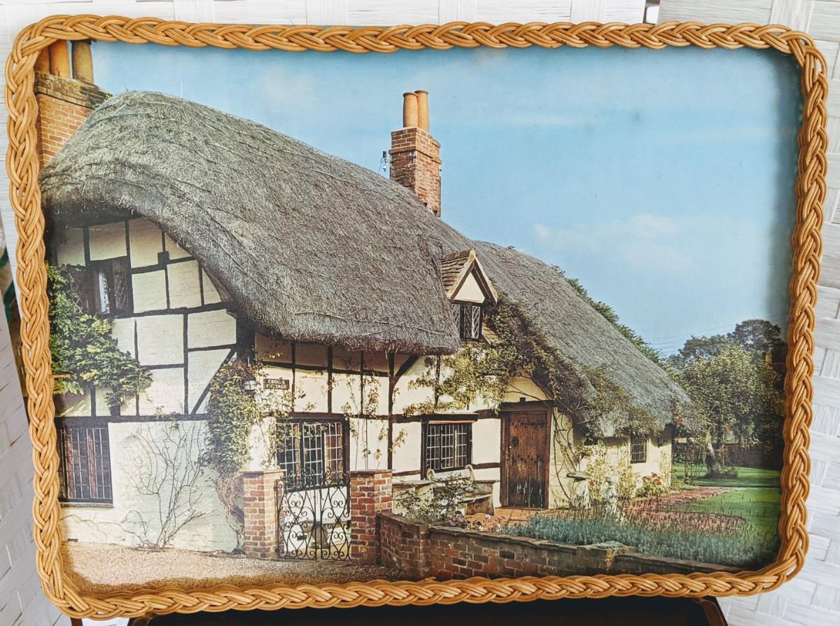 Vintage Wicker Framed Serving Tray with English Cottage scene