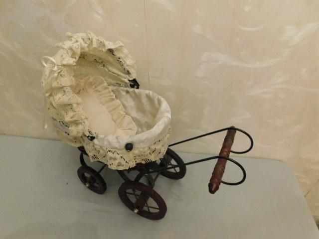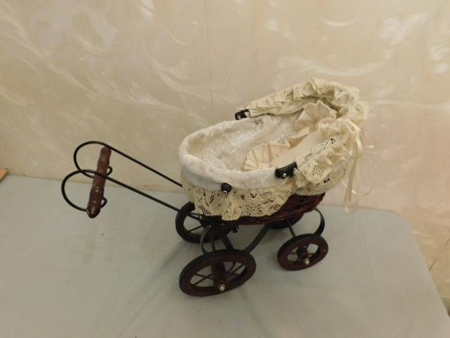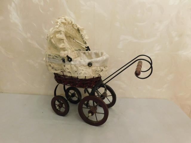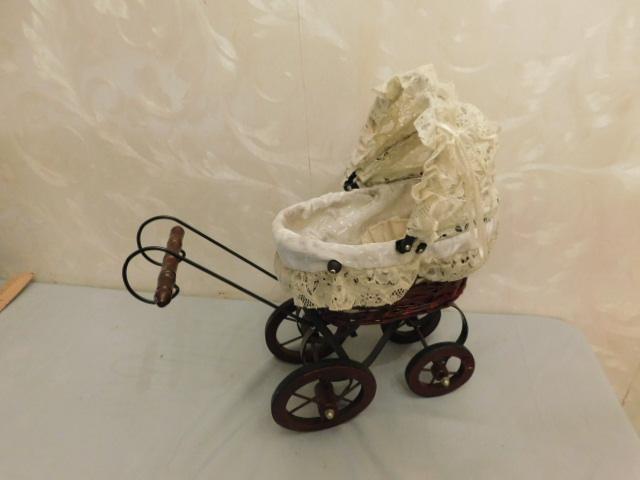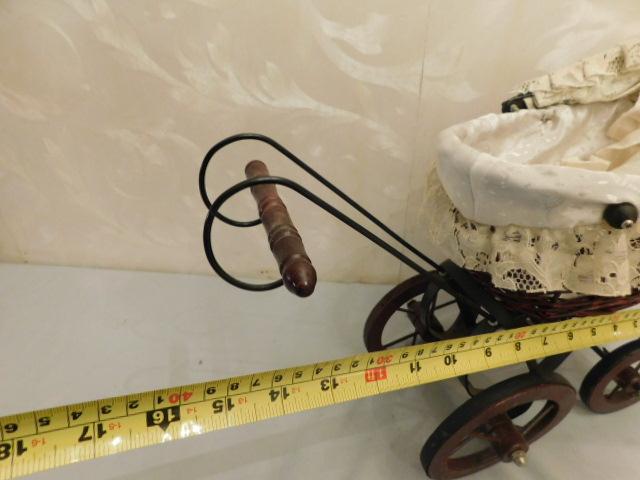 Vintage Wicker, Wood and Metal Baby Buggie with Working Cloth Bonnet for Dolls 14"x14"