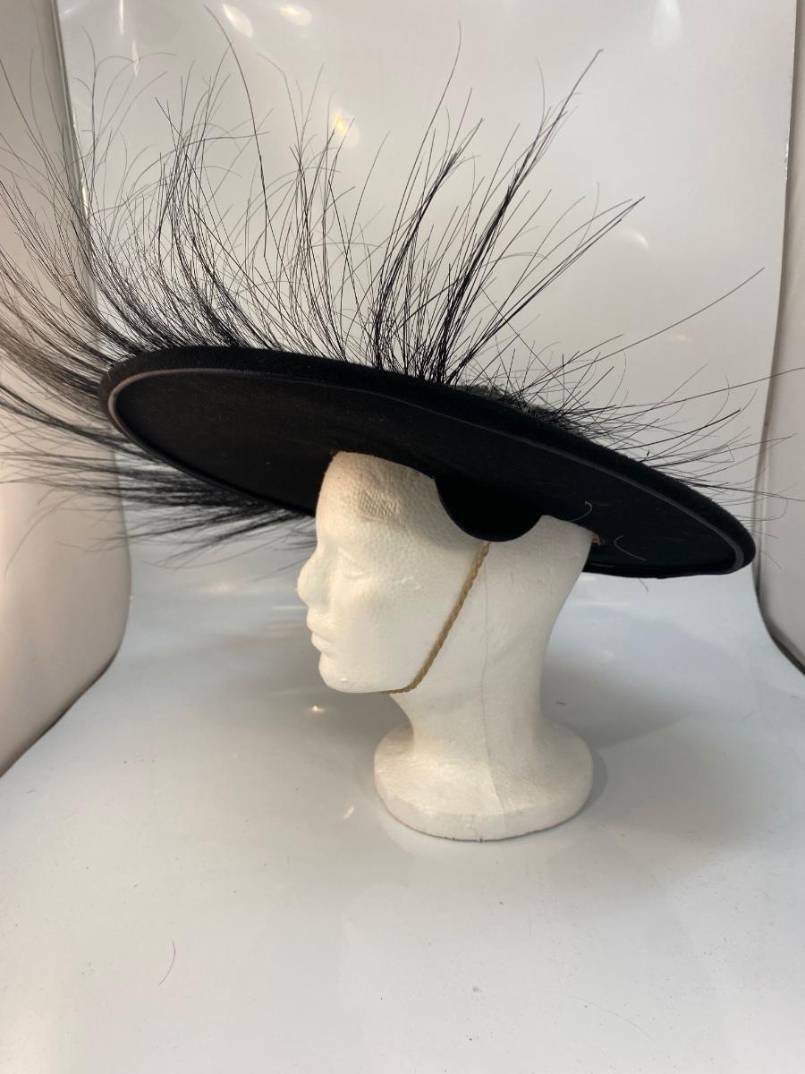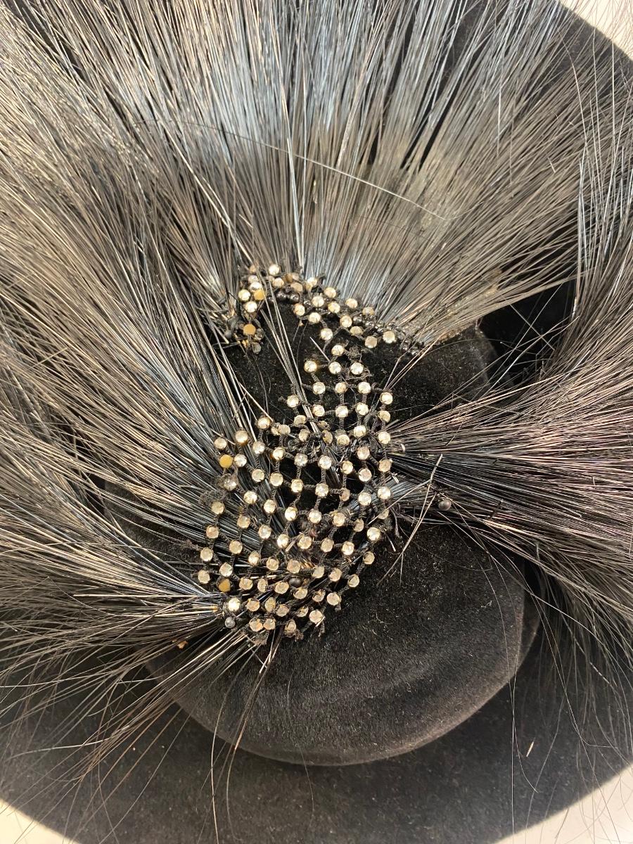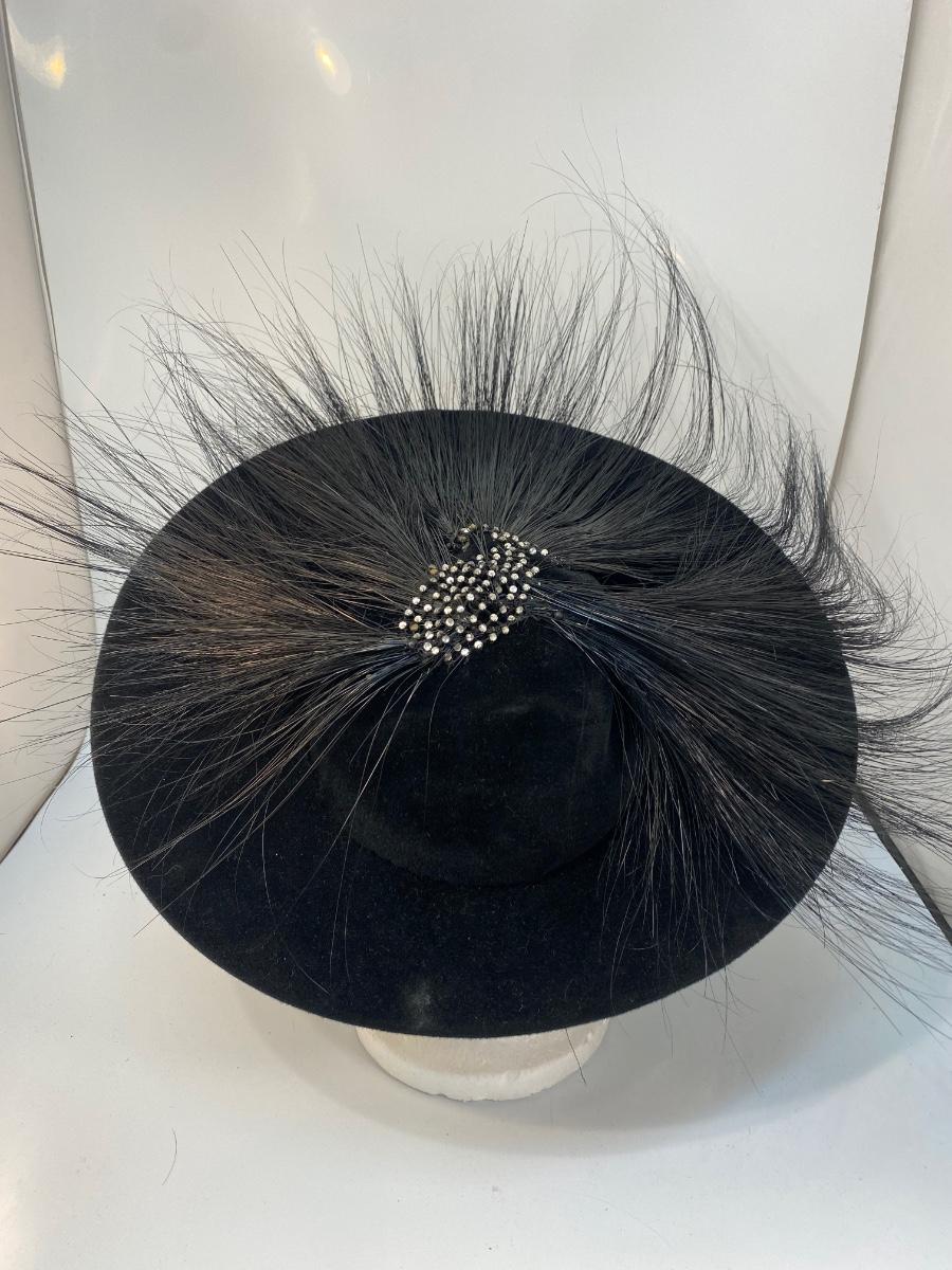 Vintage Wide Brim Feathered Black Fashion Platter Hat Milgrim Halle Bros. There is a Milgrim tag sewn over the Halle Bros tag, both were vintage hat designers. Not sure if this is all original or if the feather spray around brim was added on. Great wide brim. No holes, some dust in rhinestone accent.