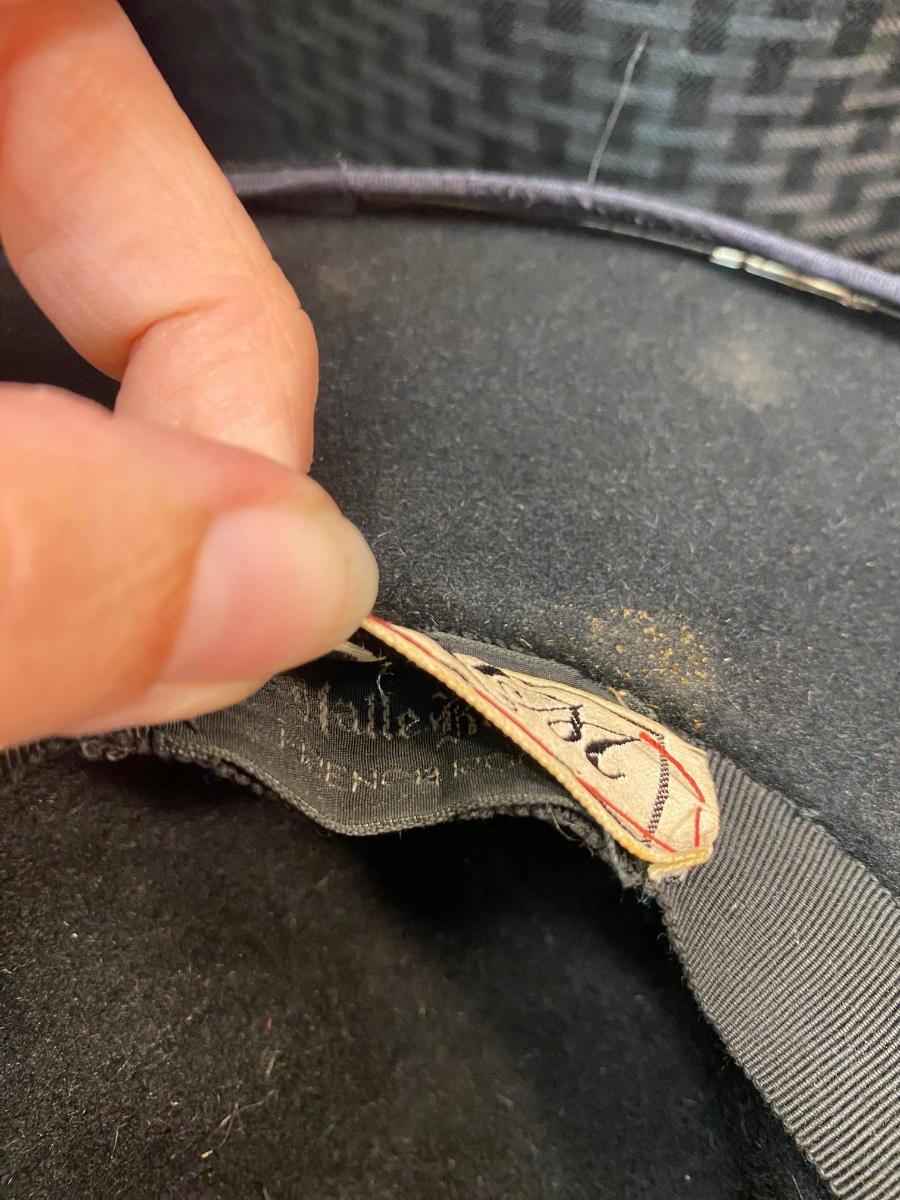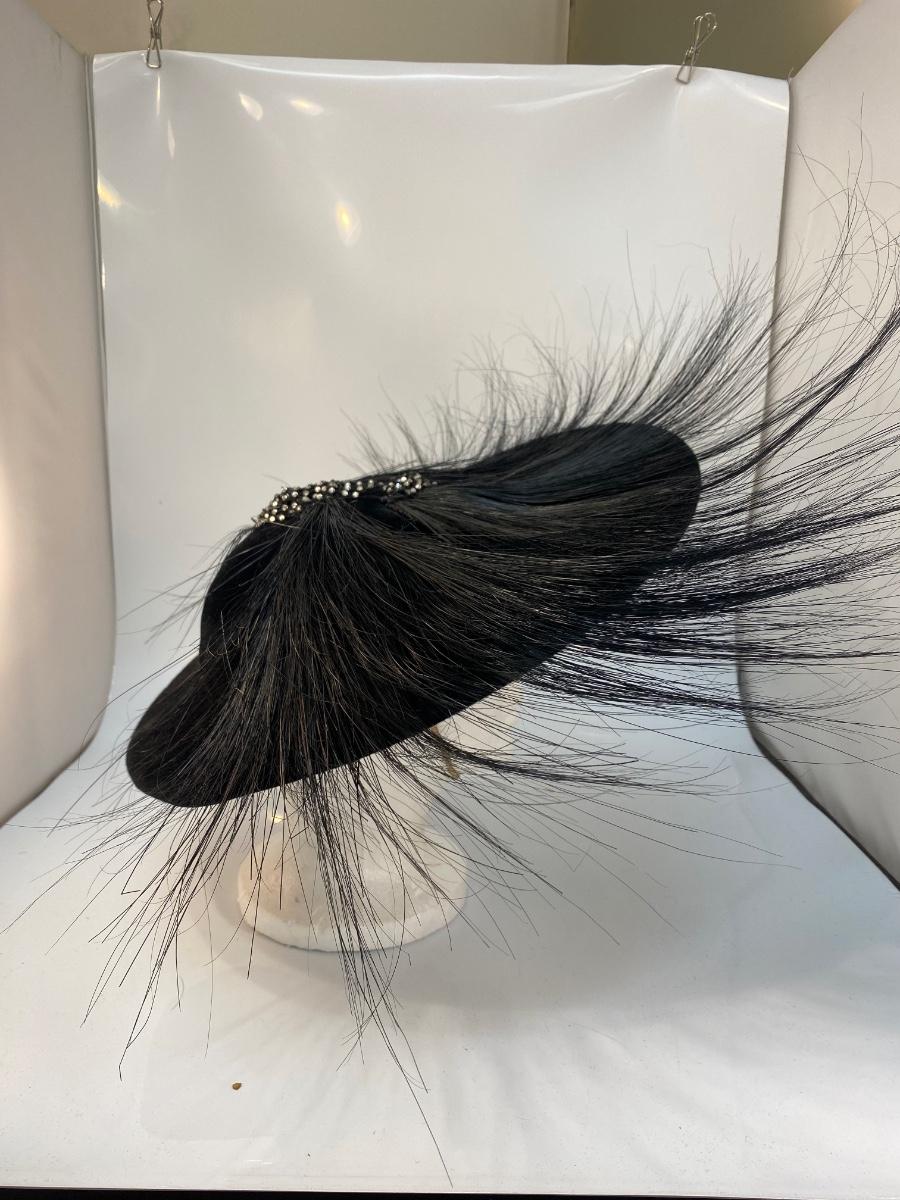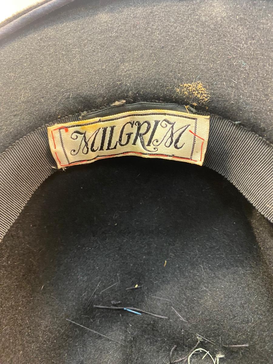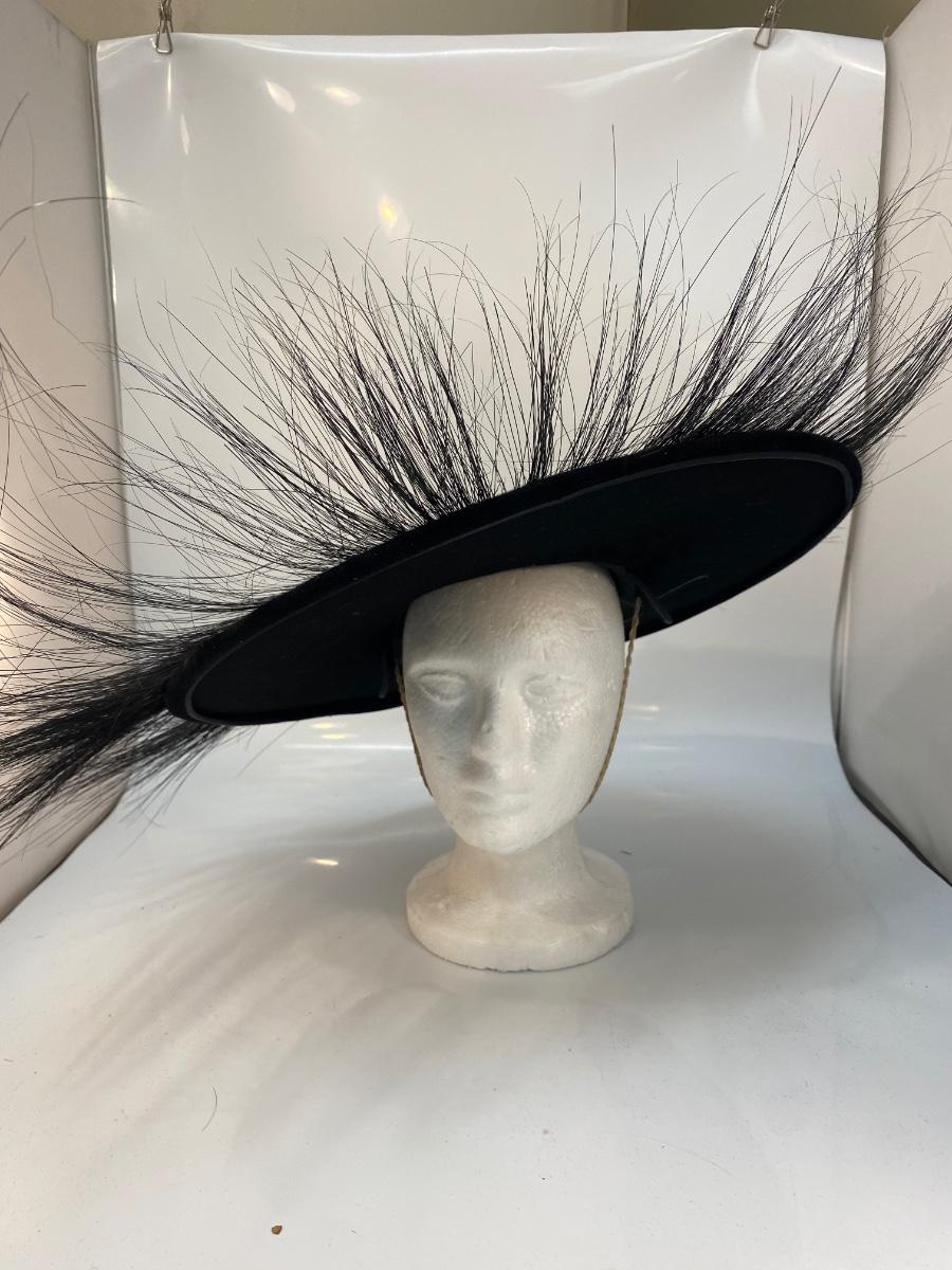 Vintage Wide Brim Feathered Black Fashion Platter Hat Milgrim Halle Bros. There is a Milgrim tag sewn over the Halle Bros tag, both were vintage hat designers. Not sure if this is all original or if the feather spray around brim was added on. Great wide brim. No holes, some dust in rhinestone accent.