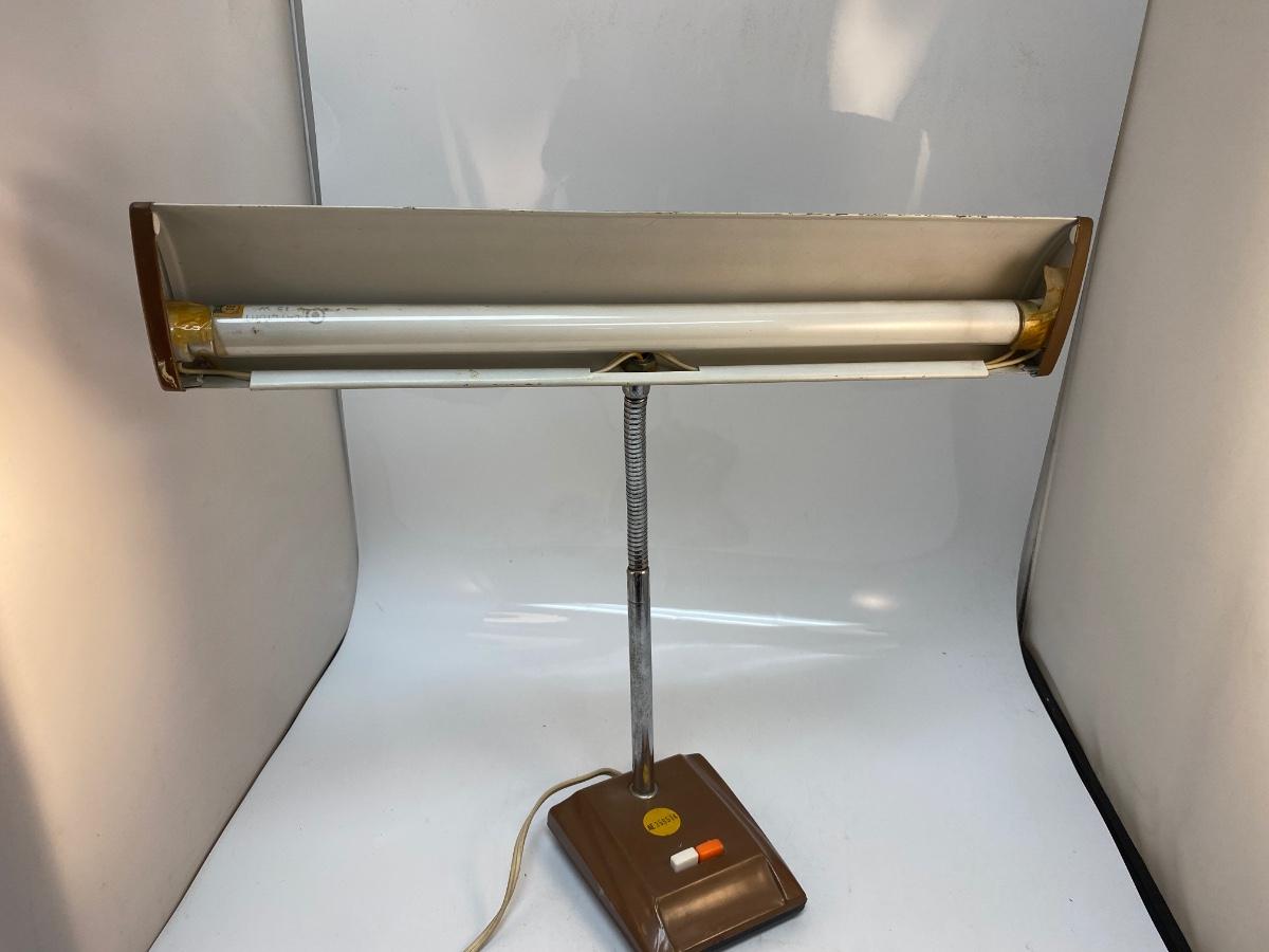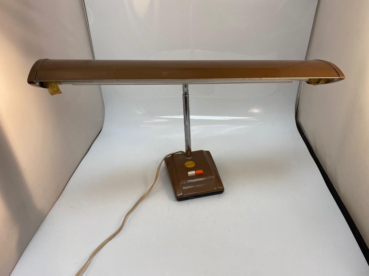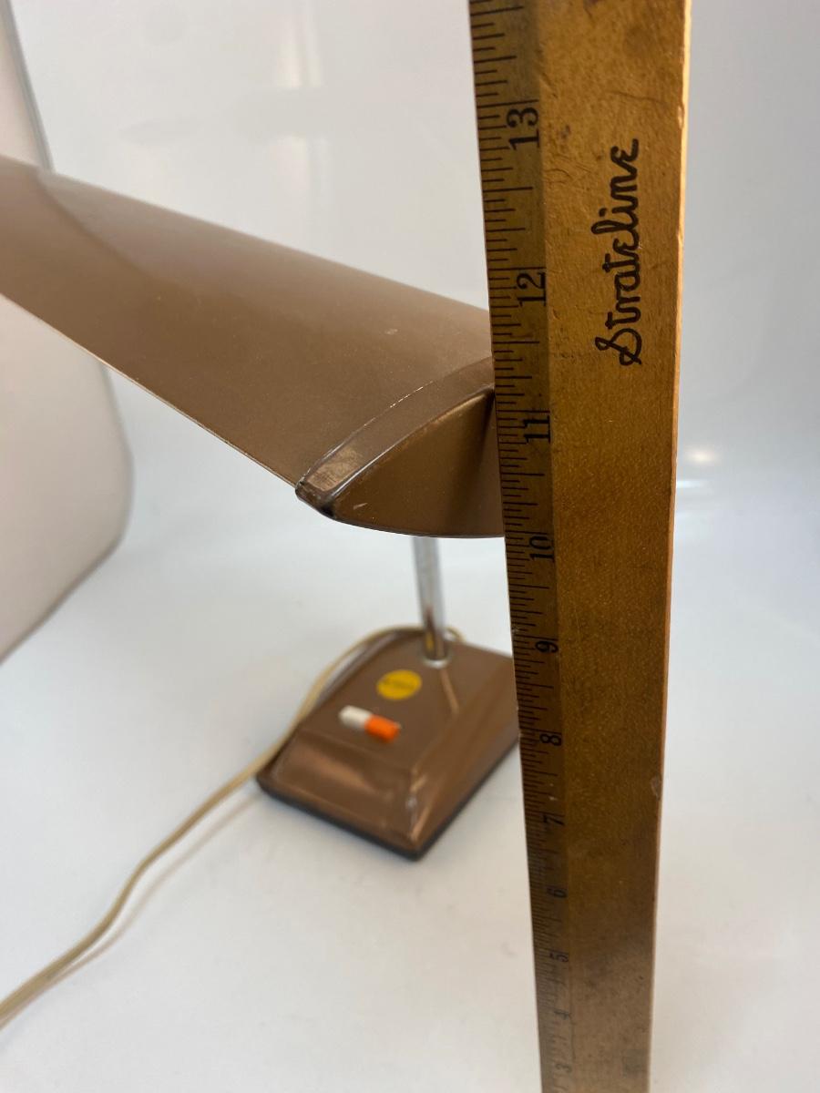 Vintage Wide Gooseneck Desk Drafting Drawing Lamp Light Push Button On Off. Works. Lamp light is about 18" size. Adjustable gooseneck is a little loose, falls slightly when moved up.