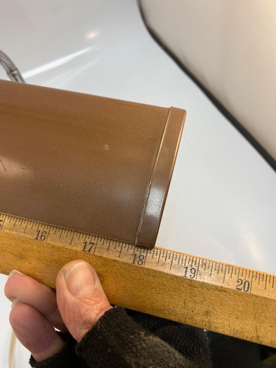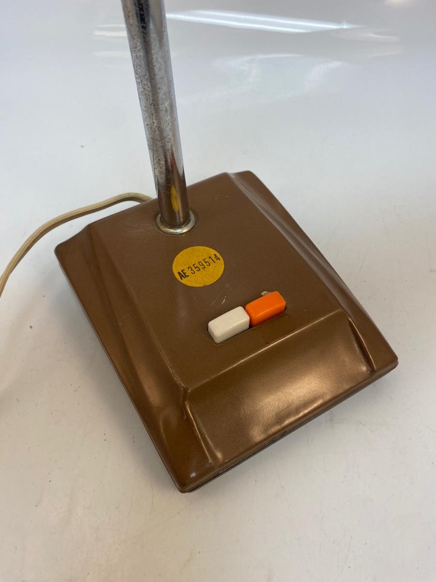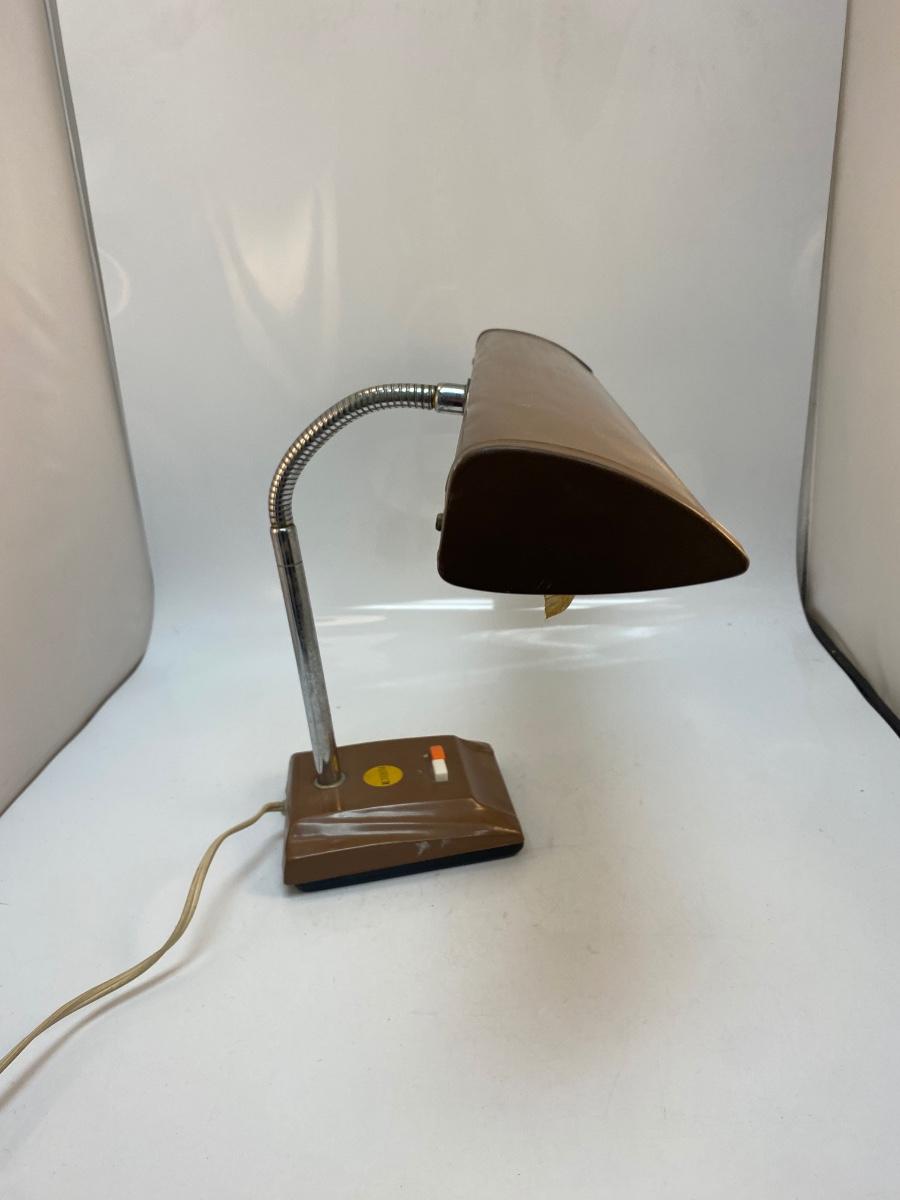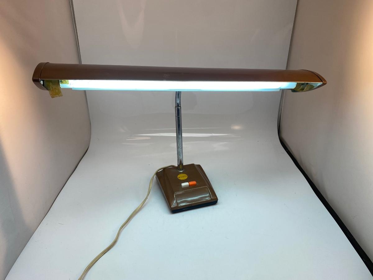 Vintage Wide Gooseneck Desk Drafting Drawing Lamp Light Push Button On Off. Works. Lamp light is about 18" size. Adjustable gooseneck is a little loose, falls slightly when moved up.