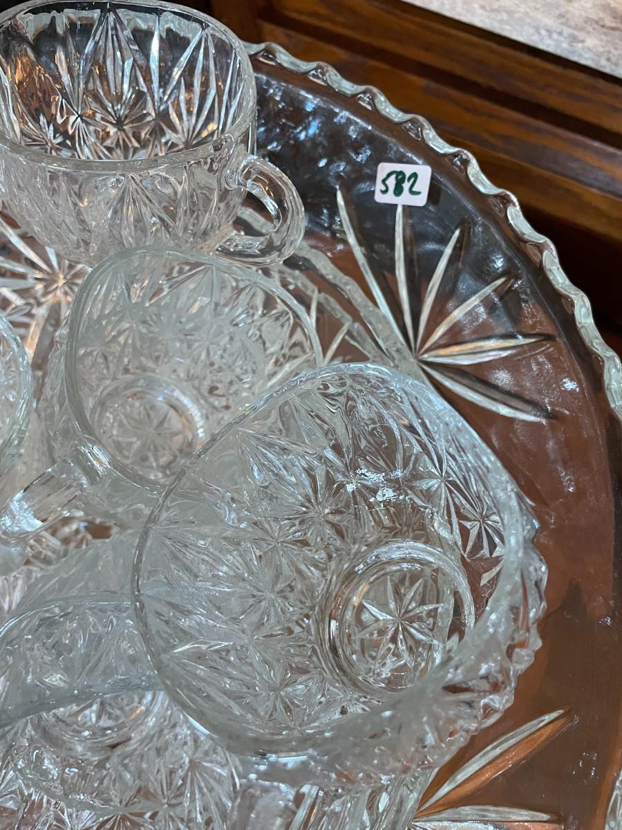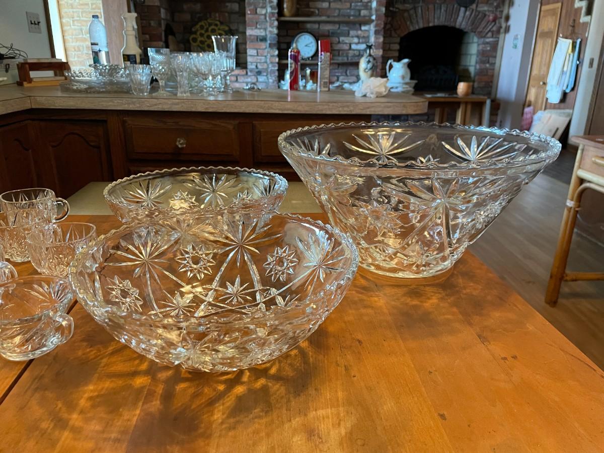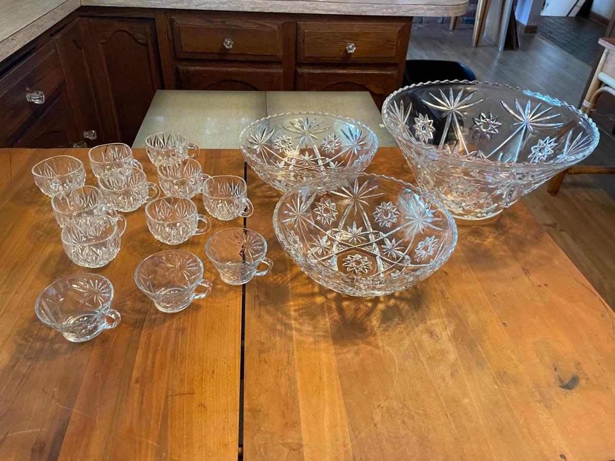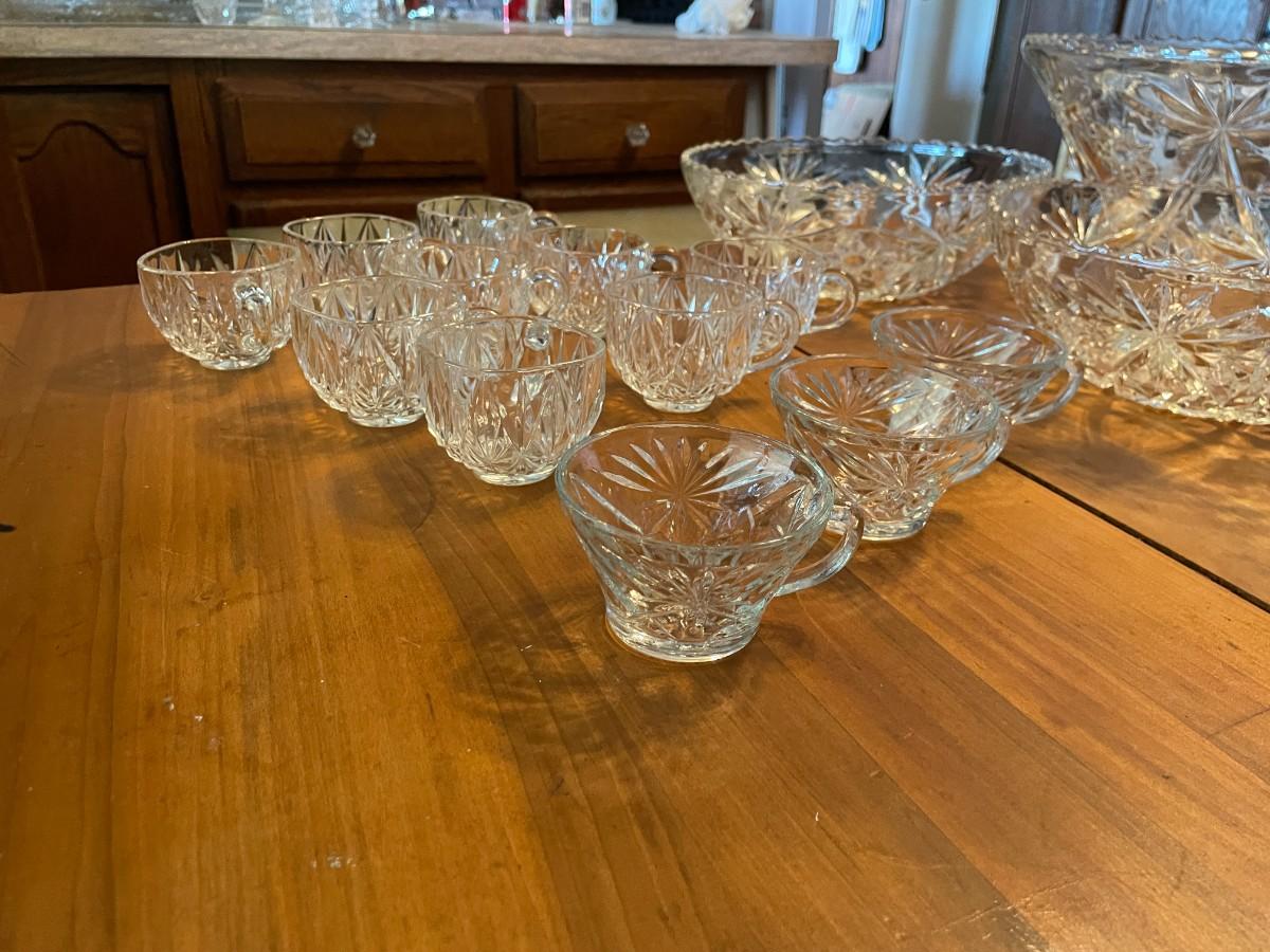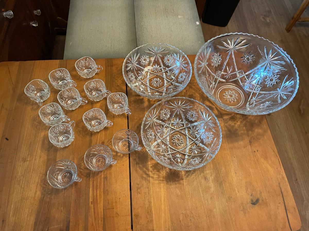 Vintage Williamport Hazel Ware Crystal Punch Glasses and Set of 3 Vintage Anchor Hocking Clear Bowl Sets