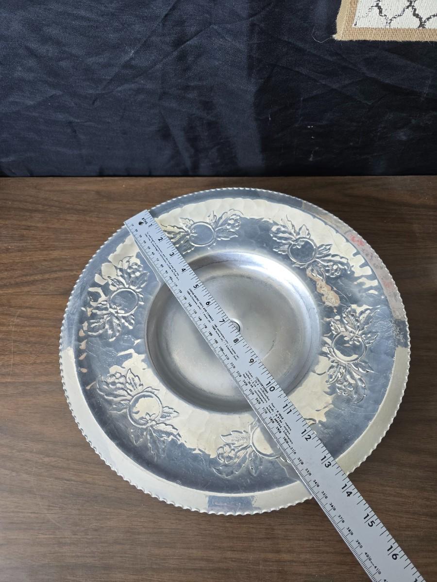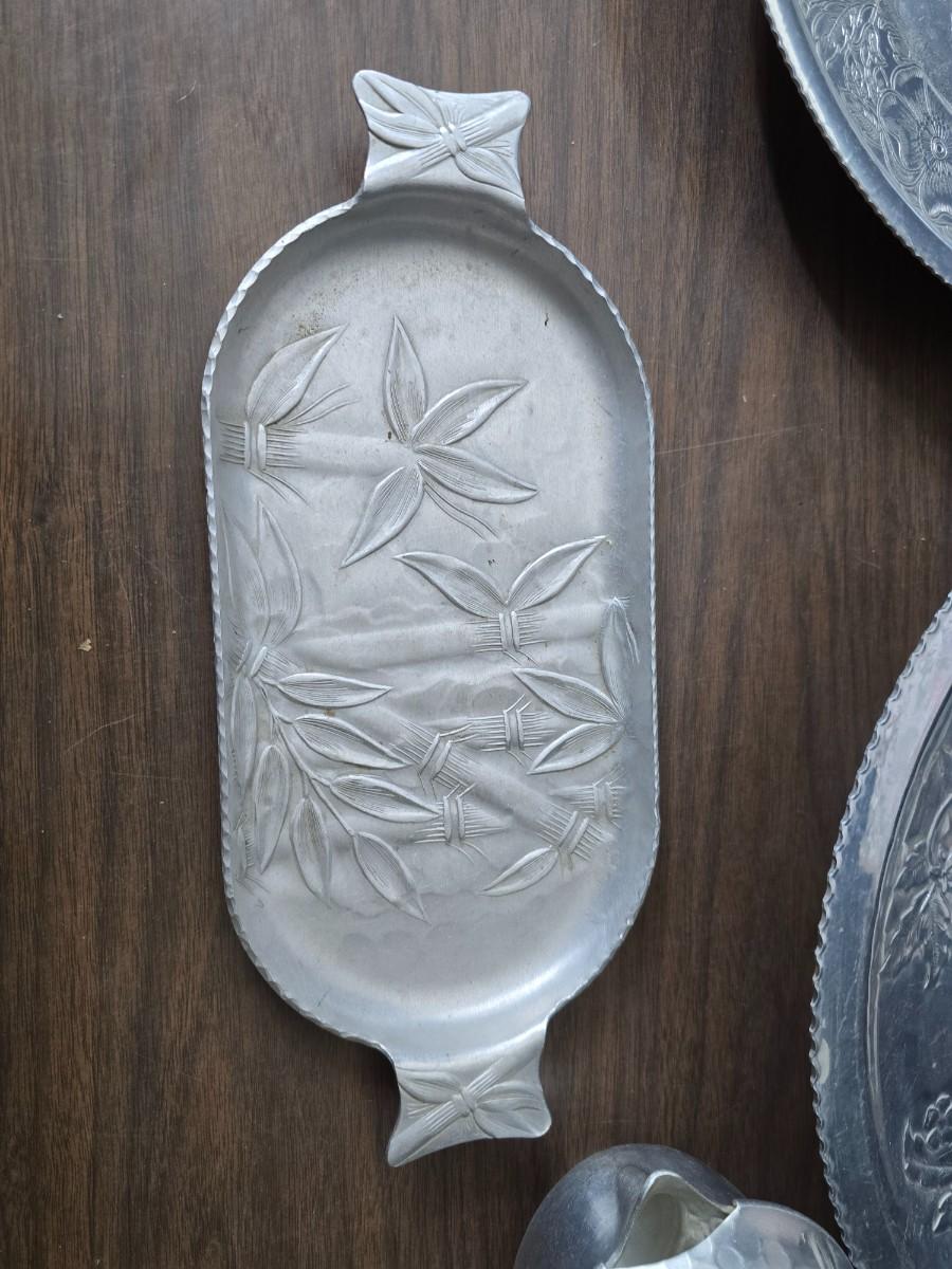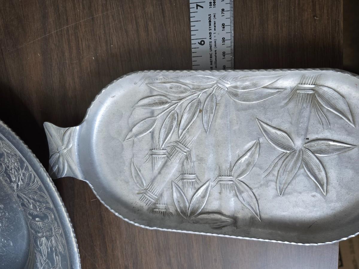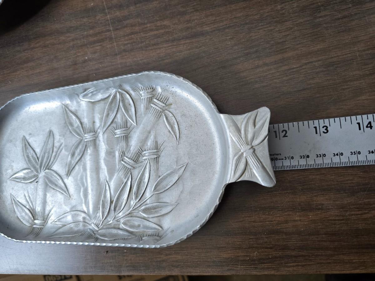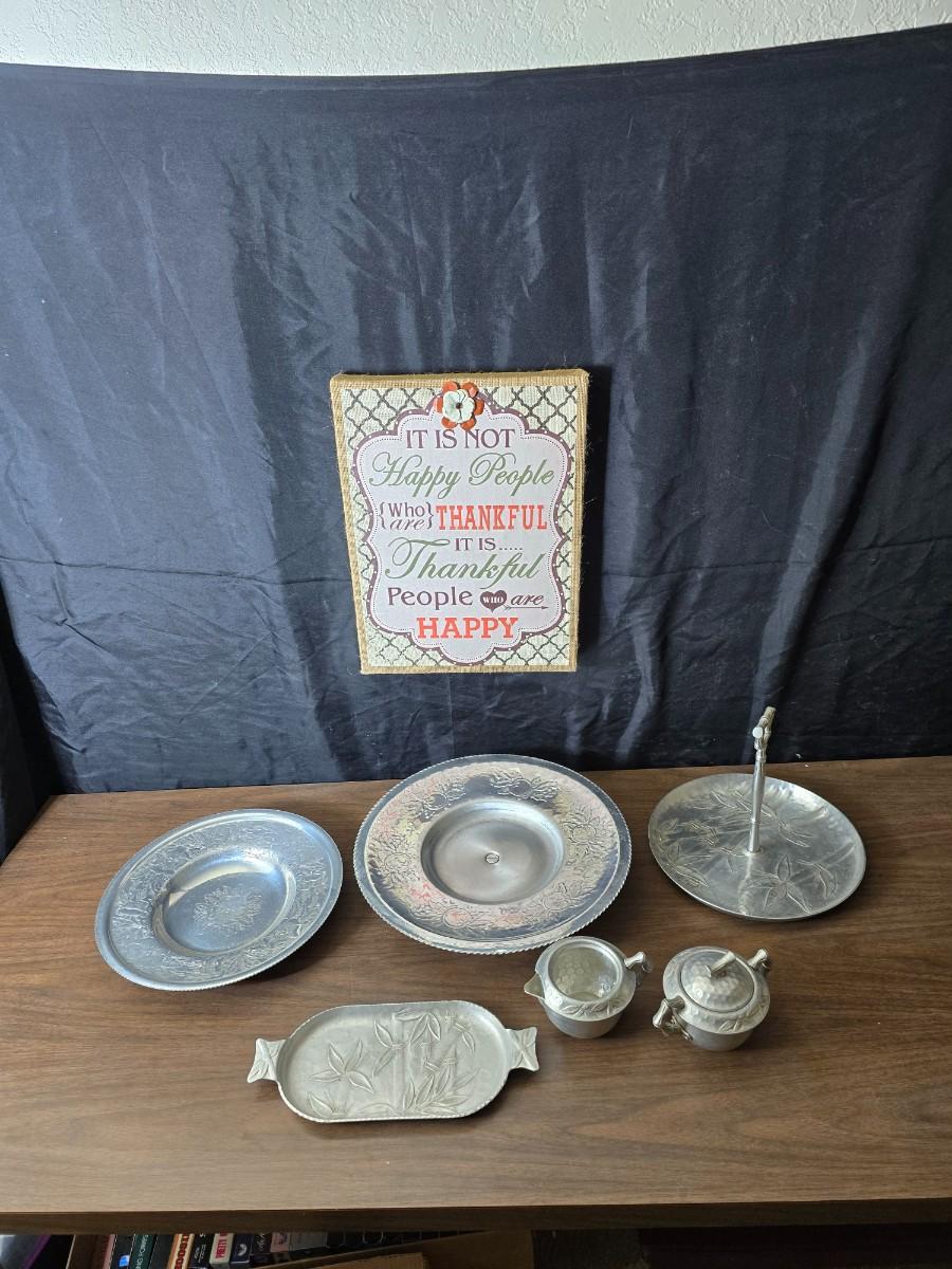 Vintage Wilson Specialties hand wrought aluminum dishware and a Thankful artwork