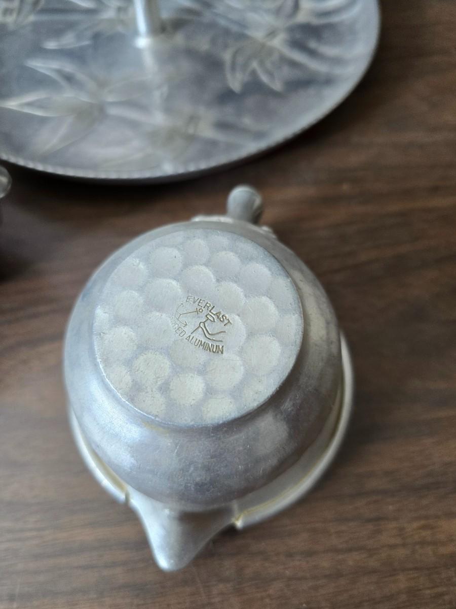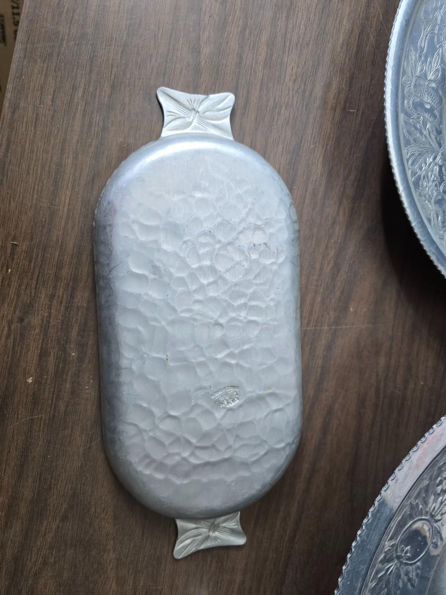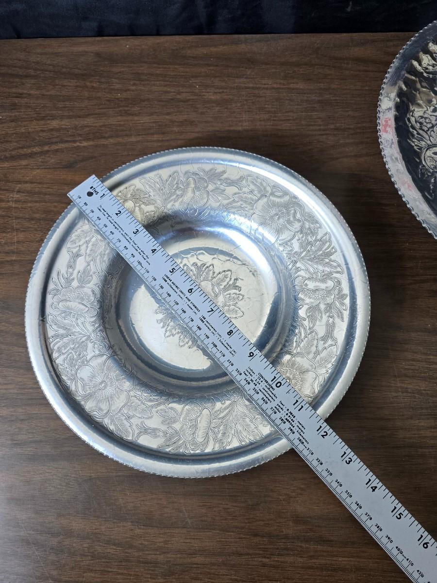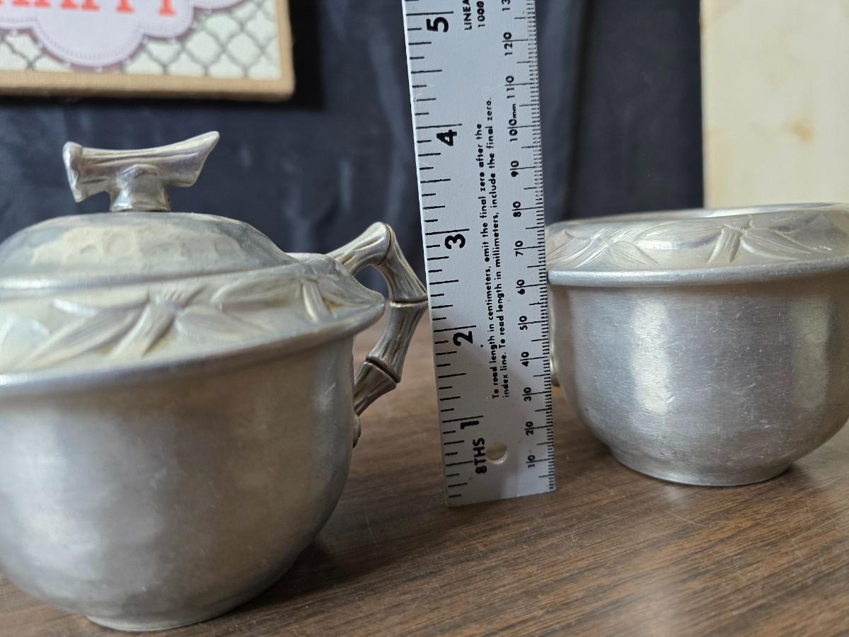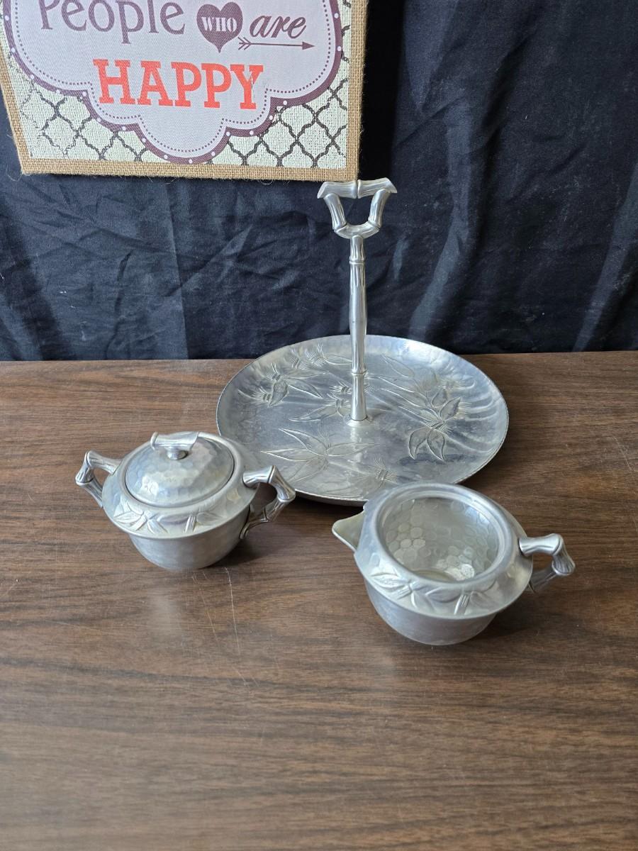 Vintage Wilson Specialties hand wrought aluminum dishware and a Thankful artwork