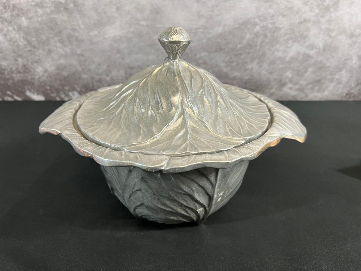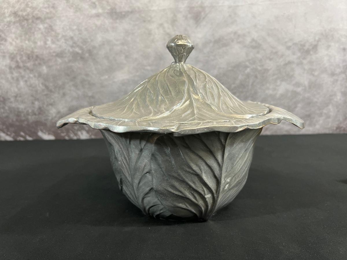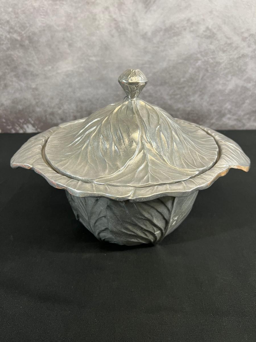 Wilton Armetale Cabbage Leaf Pewter Serving Bowl. This large heavy piece measures approx. 11" tall with the lid on x approx. 13" across from handle to handle. The opening is 8-1/2"