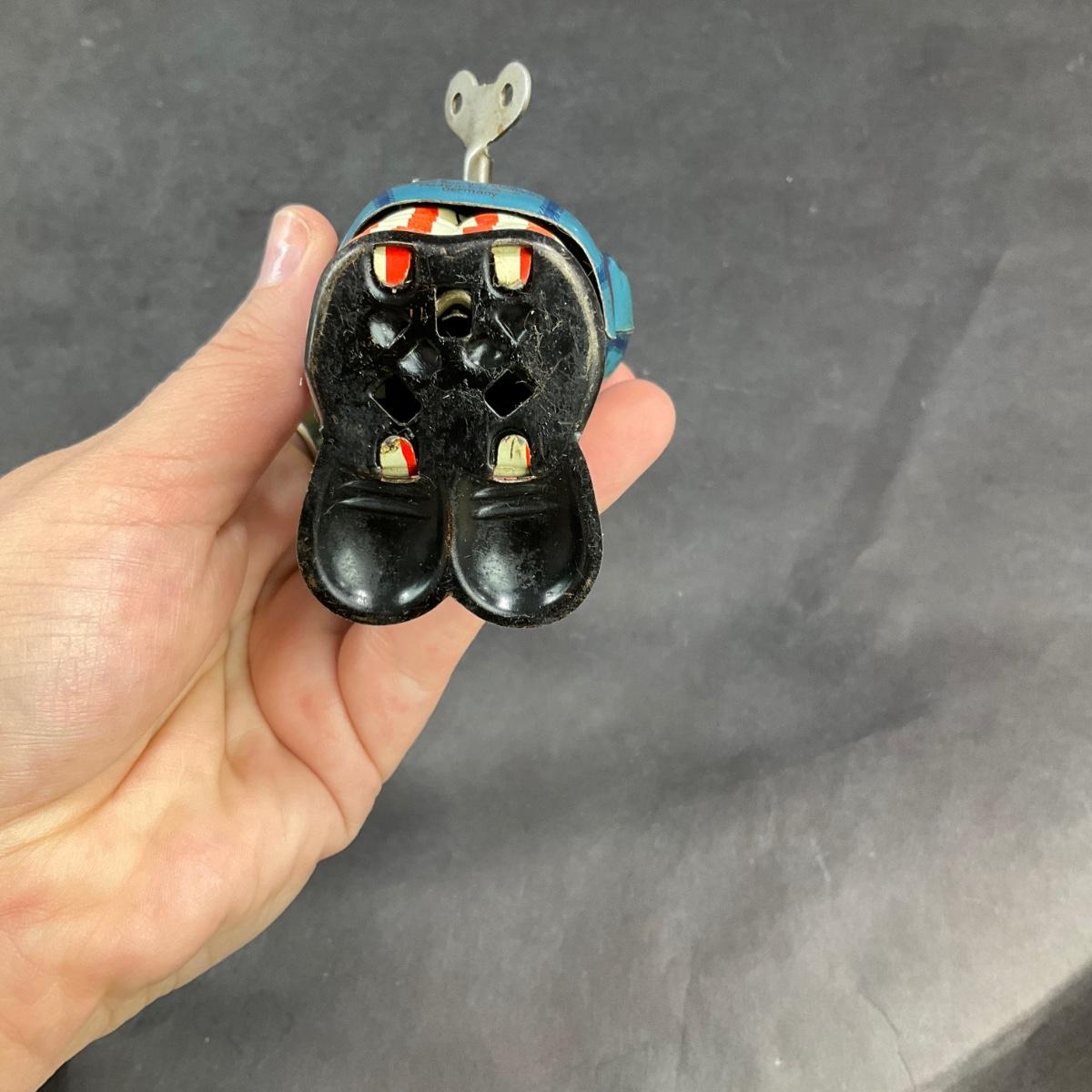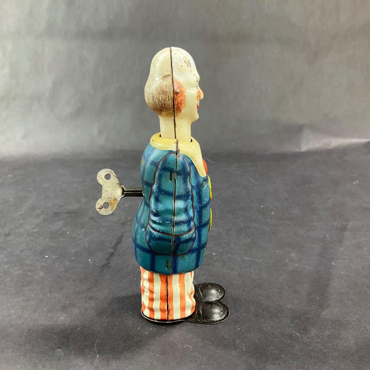 This Long-Necked Clown gets even longer so when wound up and on his way. Produced in US Zone Germany, marked DRPA, indicating it was their intellectual property. **Works, Video of Function on YouTube Video, Has Key** Please see photos for details and condition. **|** ::: Shipping is available on this lot. If you require shipping you must let us know at the close of the auction. We will coordinate with you after the item has been won. Shipping fees will include insurance up to or exceeding the value of all items being mailed. If you have any questions regarding this lot please contact the auctioneer either via this website, by direct email or by phone. PICK UP TIMES and other important information can be found in the TERMS and DESCRIPTION of the auction. Please take a look for pertinent information. Thanks!