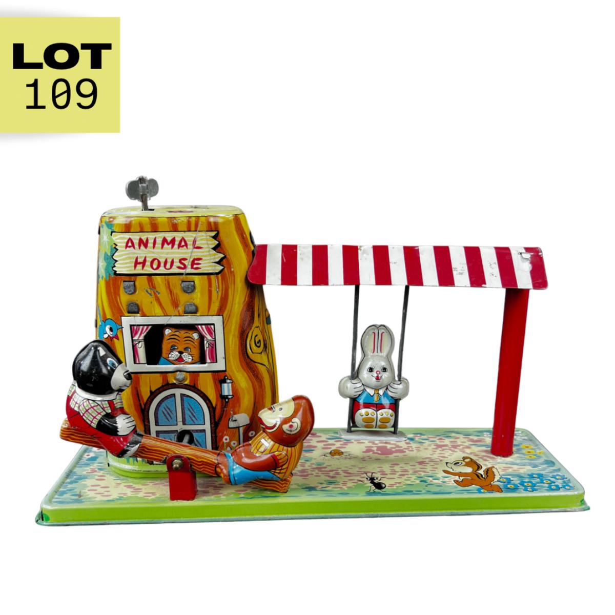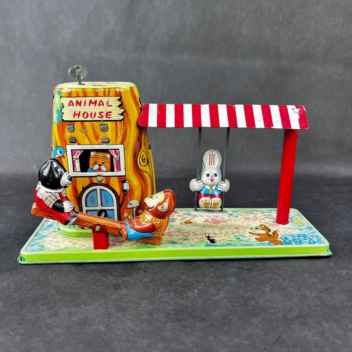 This Animal House Playground is just so special. It was produced by TPS in Japan in the 1970s. **Works, Video of Function on YouTube Video, Has Key** Please see photos for details and condition. **|** ::: Shipping is available on this lot. If you require shipping you must let us know at the close of the auction. We will coordinate with you after the item has been won. Shipping fees will include insurance up to or exceeding the value of all items being mailed. If you have any questions regarding this lot please contact the auctioneer either via this website, by direct email or by phone. PICK UP TIMES and other important information can be found in the TERMS and DESCRIPTION of the auction. Please take a look for pertinent information. Thanks!