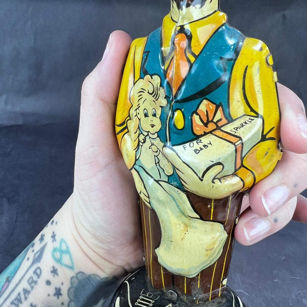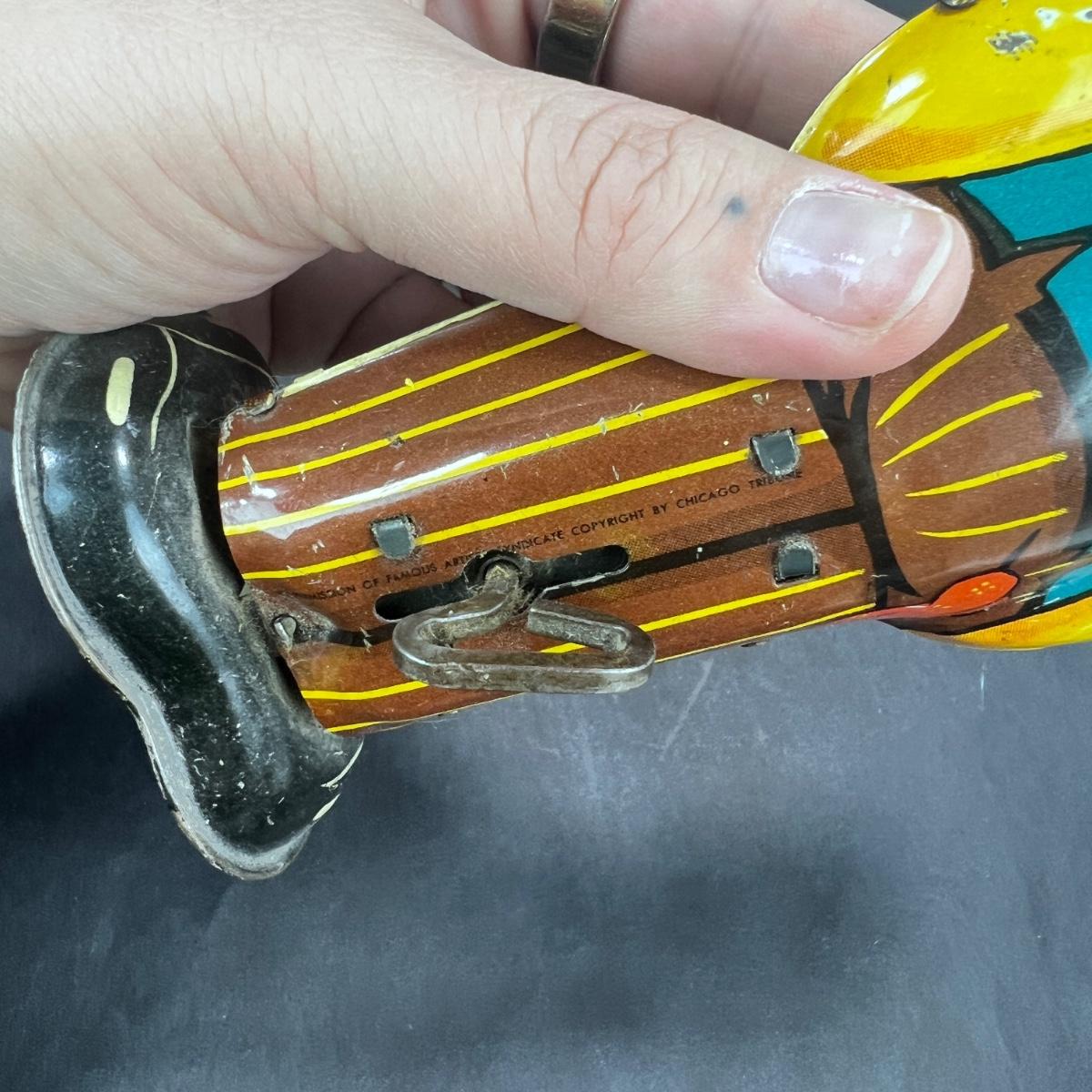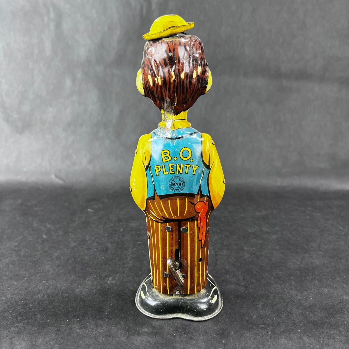 This Dick Tracy character, B O Plenty, was produced by Marx toys in the 1930s and 40s. It features BO holding his daughter, Sparkle. **Works, Video of Function on YouTube Video, Has Key** Please see photos for details and condition. **|** ::: Shipping is available on this lot. If you require shipping you must let us know at the close of the auction. We will coordinate with you after the item has been won. Shipping fees will include insurance up to or exceeding the value of all items being mailed. If you have any questions regarding this lot please contact the auctioneer either via this website, by direct email or by phone. PICK UP TIMES and other important information can be found in the TERMS and DESCRIPTION of the auction. Please take a look for pertinent information. Thanks!