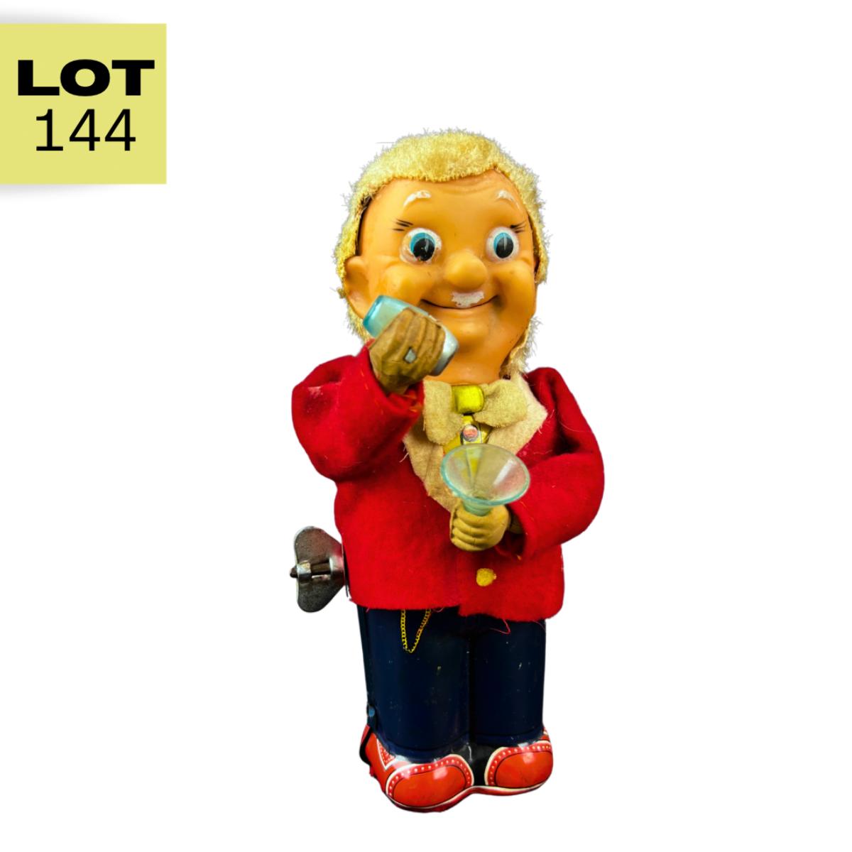 This Wind-Up Bartender was produced by Nomura in the 1960s as an additional off-shoot of the Charlie Weaver Bartender battery operated toy. **Works, Video of Function on YouTube Video, Has Key** Please see photos for details and condition. **|** ::: Shipping is available on this lot. If you require shipping you must let us know at the close of the auction. We will coordinate with you after the item has been won. Shipping fees will include insurance up to or exceeding the value of all items being mailed. If you have any questions regarding this lot please contact the auctioneer either via this website, by direct email or by phone. PICK UP TIMES and other important information can be found in the TERMS and DESCRIPTION of the auction. Please take a look for pertinent information. Thanks!