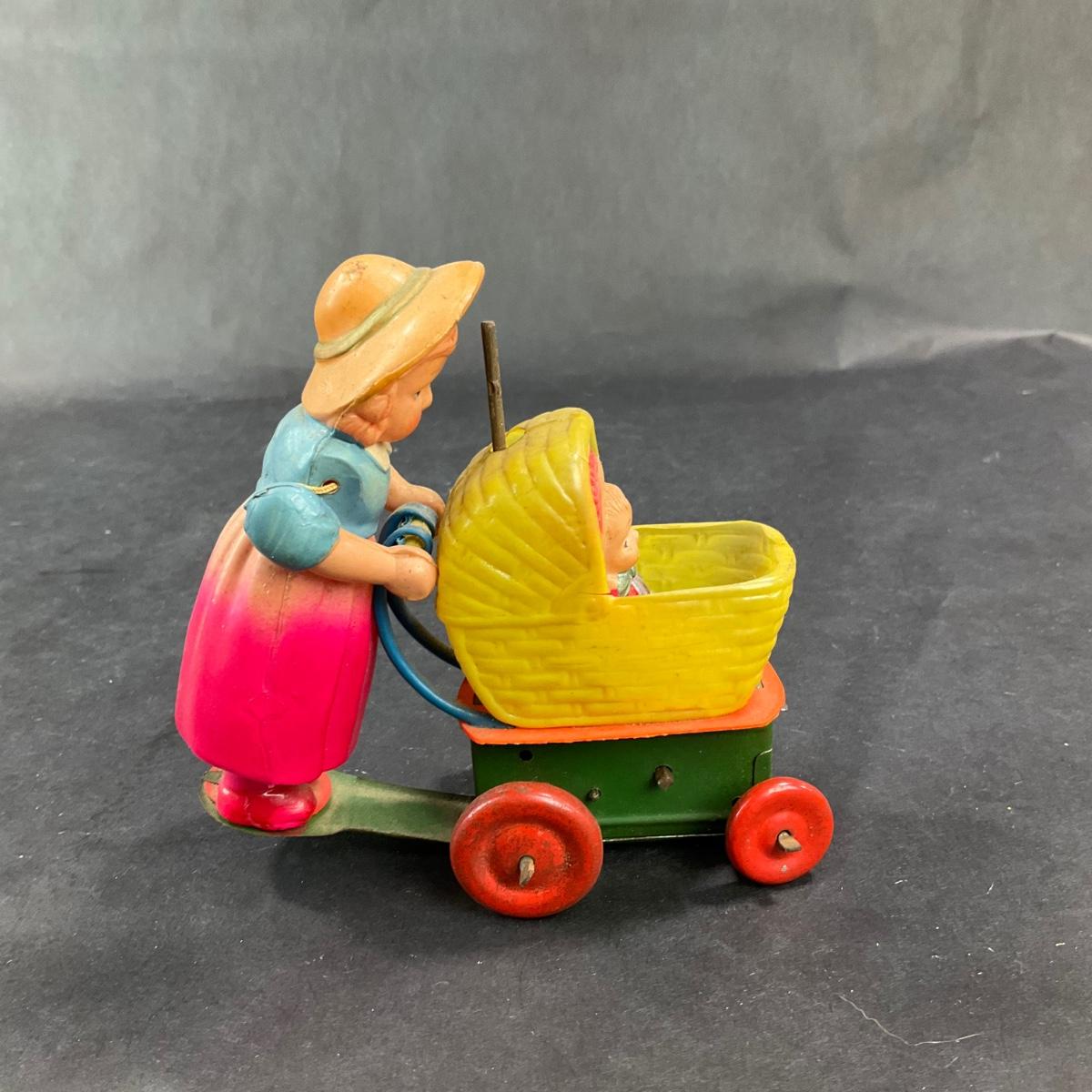 This sweet little girl is pushing along the sweetest little baby Buggy... or is it pulling her?! This toy is unmarked, but believed to be produced in the mid-1900s in Japan. The main construction is celluloid, with the base of the toy being tin. **Works, Video of Function on YouTube Video, Has Key** Please see photos for details and condition. **|** ::: Shipping is available on this lot. If you require shipping you must let us know at the close of the auction. We will coordinate with you after the item has been won. Shipping fees will include insurance up to or exceeding the value of all items being mailed. If you have any questions regarding this lot please contact the auctioneer either via this website, by direct email or by phone. PICK UP TIMES and other important information can be found in the TERMS and DESCRIPTION of the auction. Please take a look for pertinent information. Thanks!