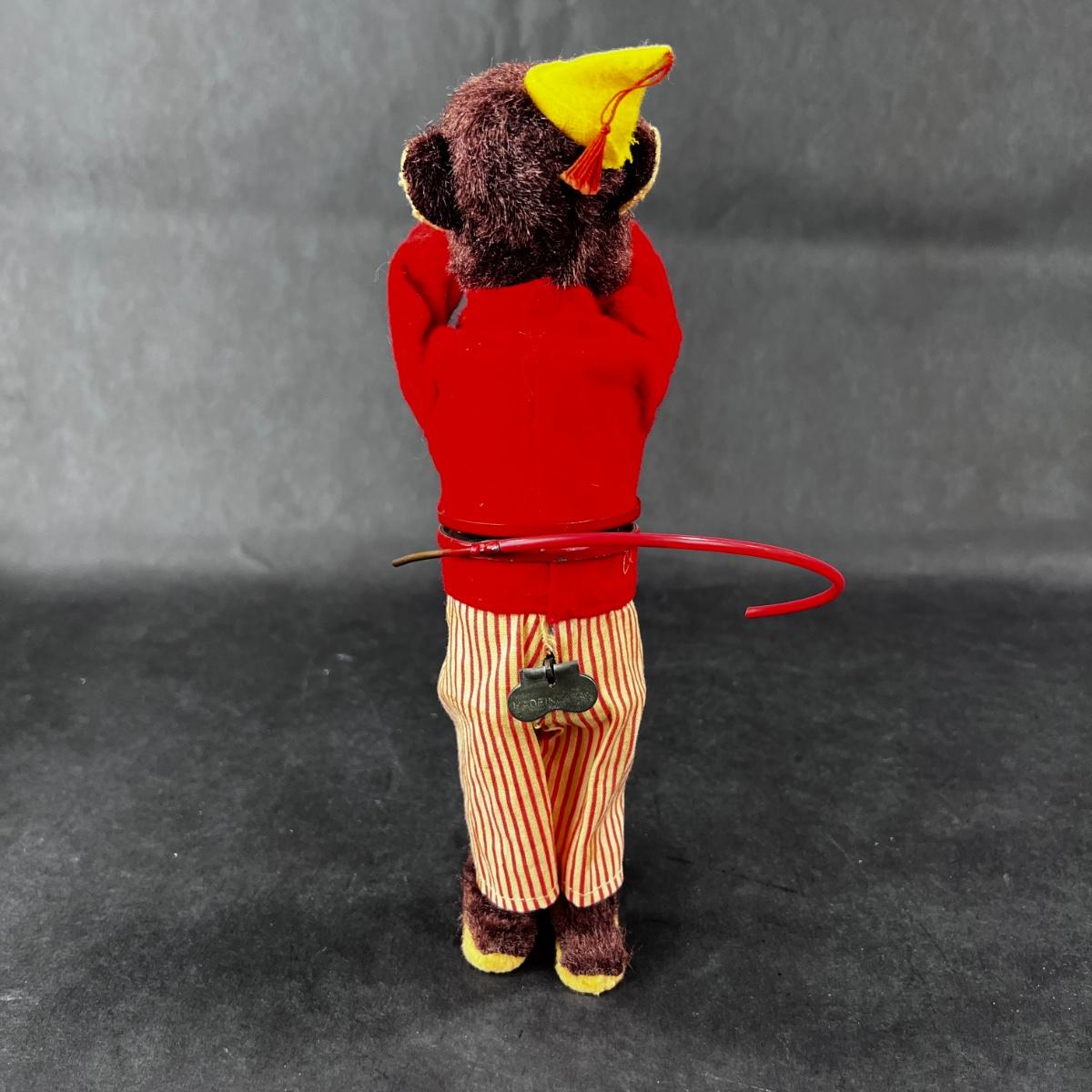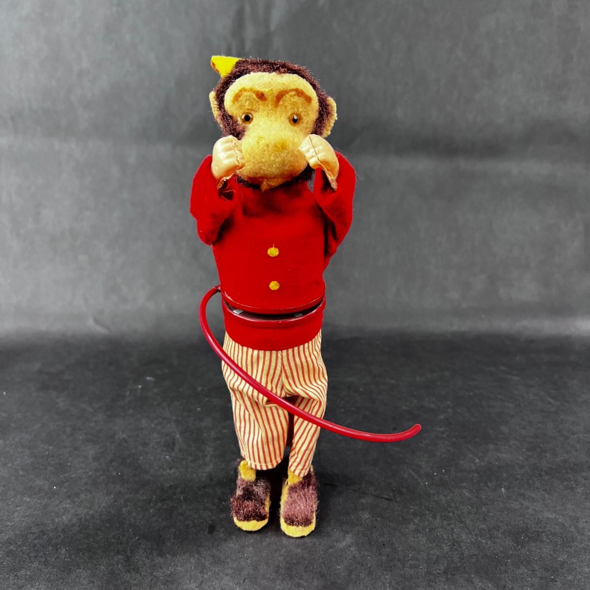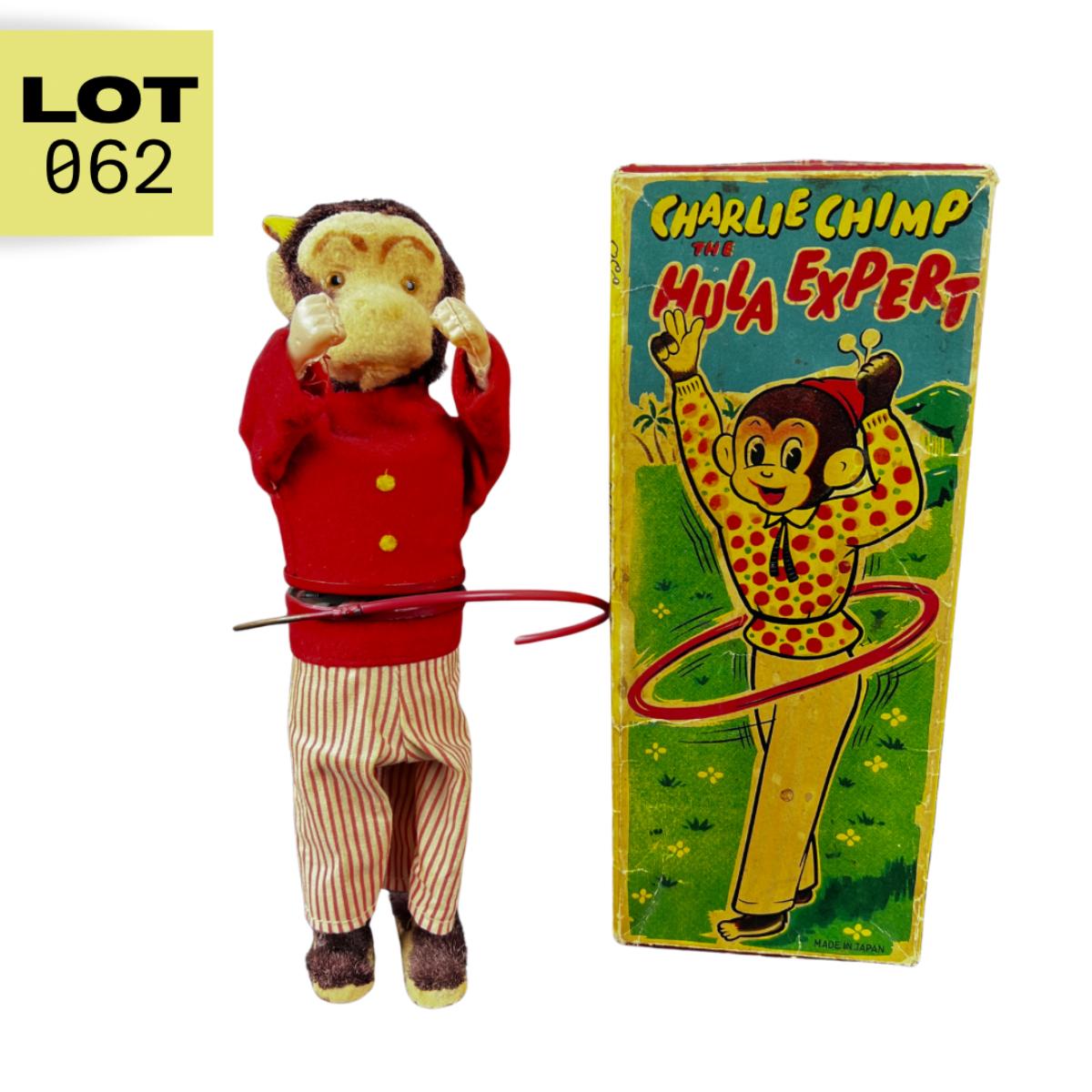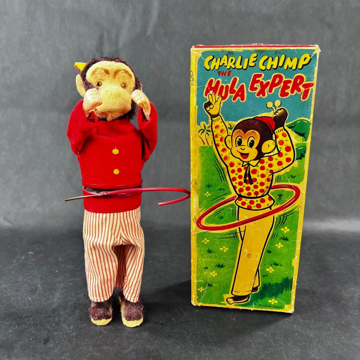 Here is an attractive Charlie Chimp, The Hula Expert - with his box! The "flexible" hula hoop needs to be replaced with a thin piece of tubing - which I might have and will happily provide you with. This toy was produced in the 1950s in Japan. **Works, Video of Function on YouTube Video, Has Key** **|** Please see photos for details and condition. ::: Shipping is available on this lot. If you require shipping you must let us know at the close of the auction. We will coordinate with you after the item has been won. Shipping fees will include insurance up to or exceeding the value of all items being mailed. If you have any questions regarding this lot please contact the auctioneer either via this website, by direct email or by phone. PICK UP TIMES and other important information can be found in the TERMS and DESCRIPTION of the auction. Please take a look for pertinent information. Thanks!