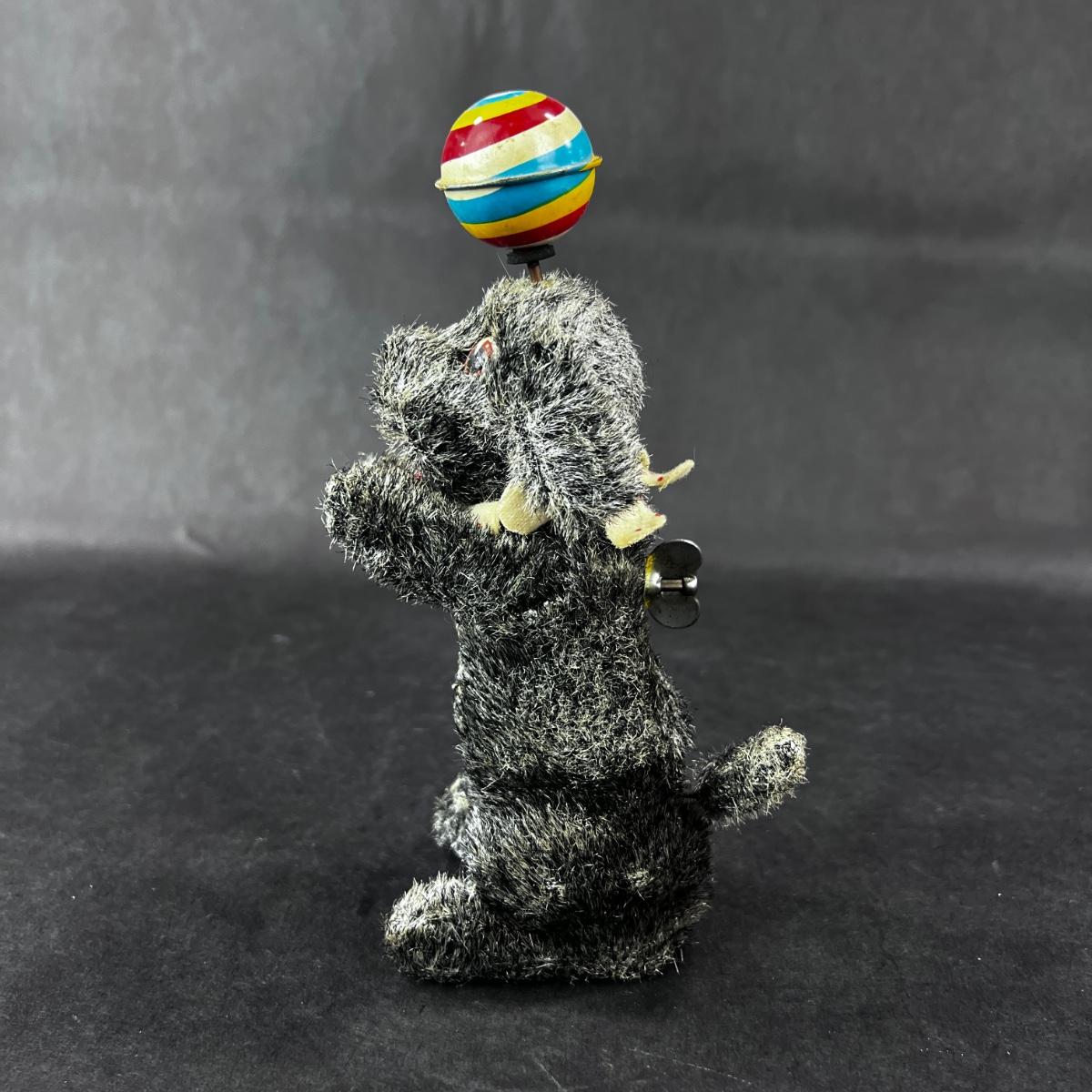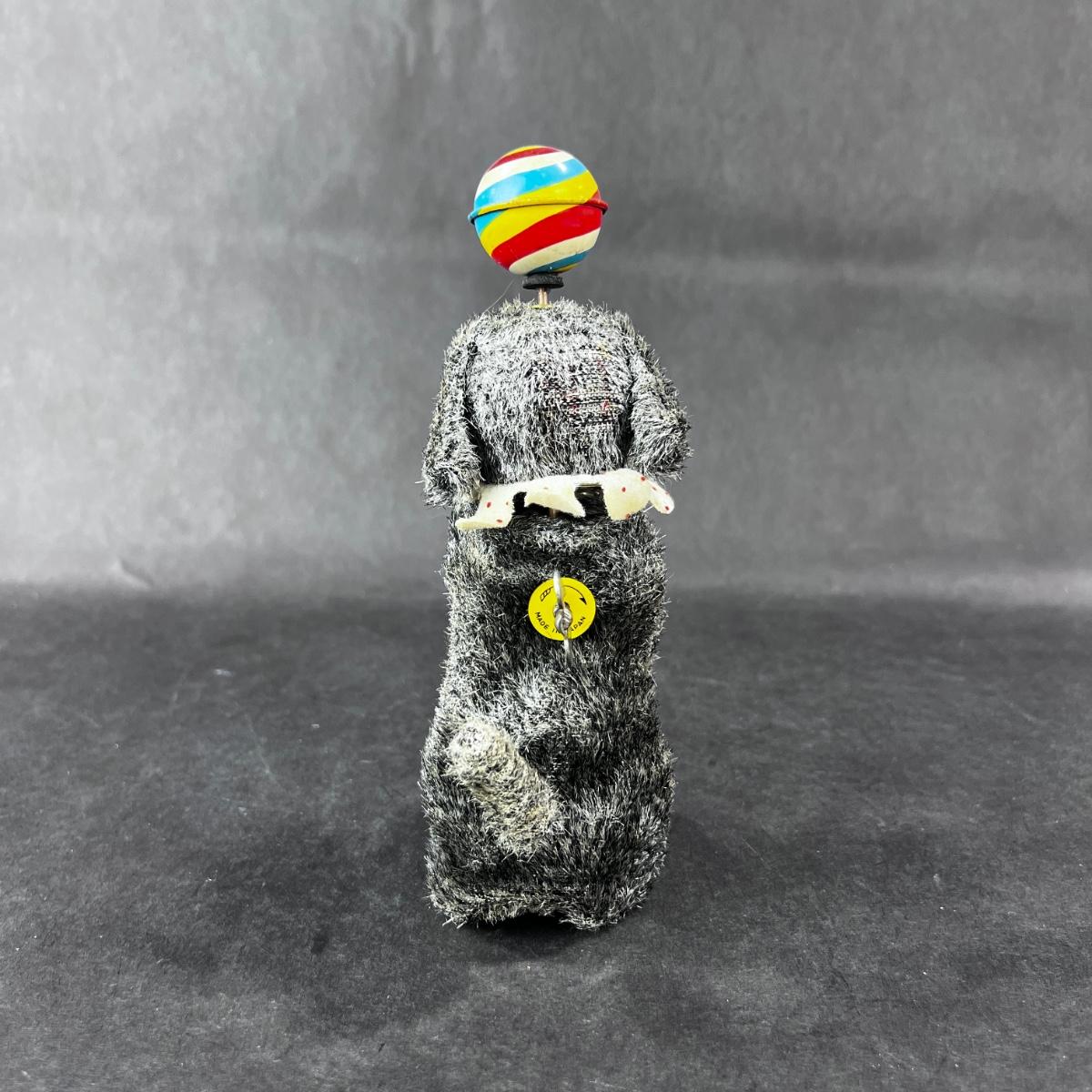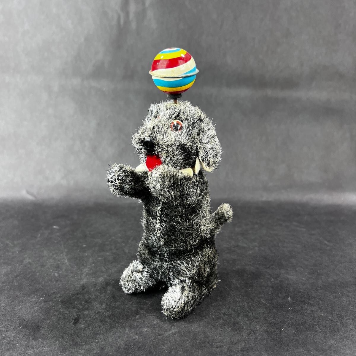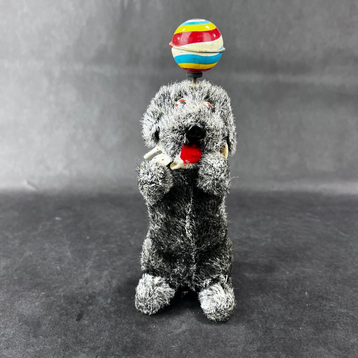 A very attractive Grey Dog, using all its talents to balance a ball on its head. Has great action. This piece was likely produced in Japan in the 1950s. I don't note a marking indicating a company. **Works, Video of Function on YouTube Video, Has Key** **|** Please see photos for details and condition. ::: Shipping is available on this lot. If you require shipping you must let us know at the close of the auction. We will coordinate with you after the item has been won. Shipping fees will include insurance up to or exceeding the value of all items being mailed. If you have any questions regarding this lot please contact the auctioneer either via this website, by direct email or by phone. PICK UP TIMES and other important information can be found in the TERMS and DESCRIPTION of the auction. Please take a look for pertinent information. Thanks!
