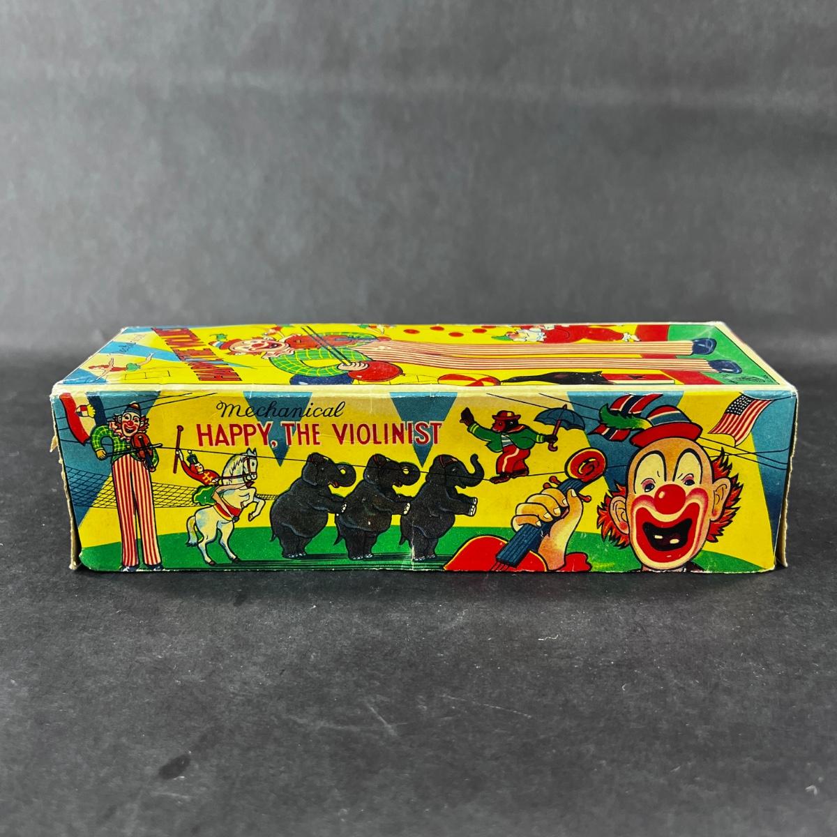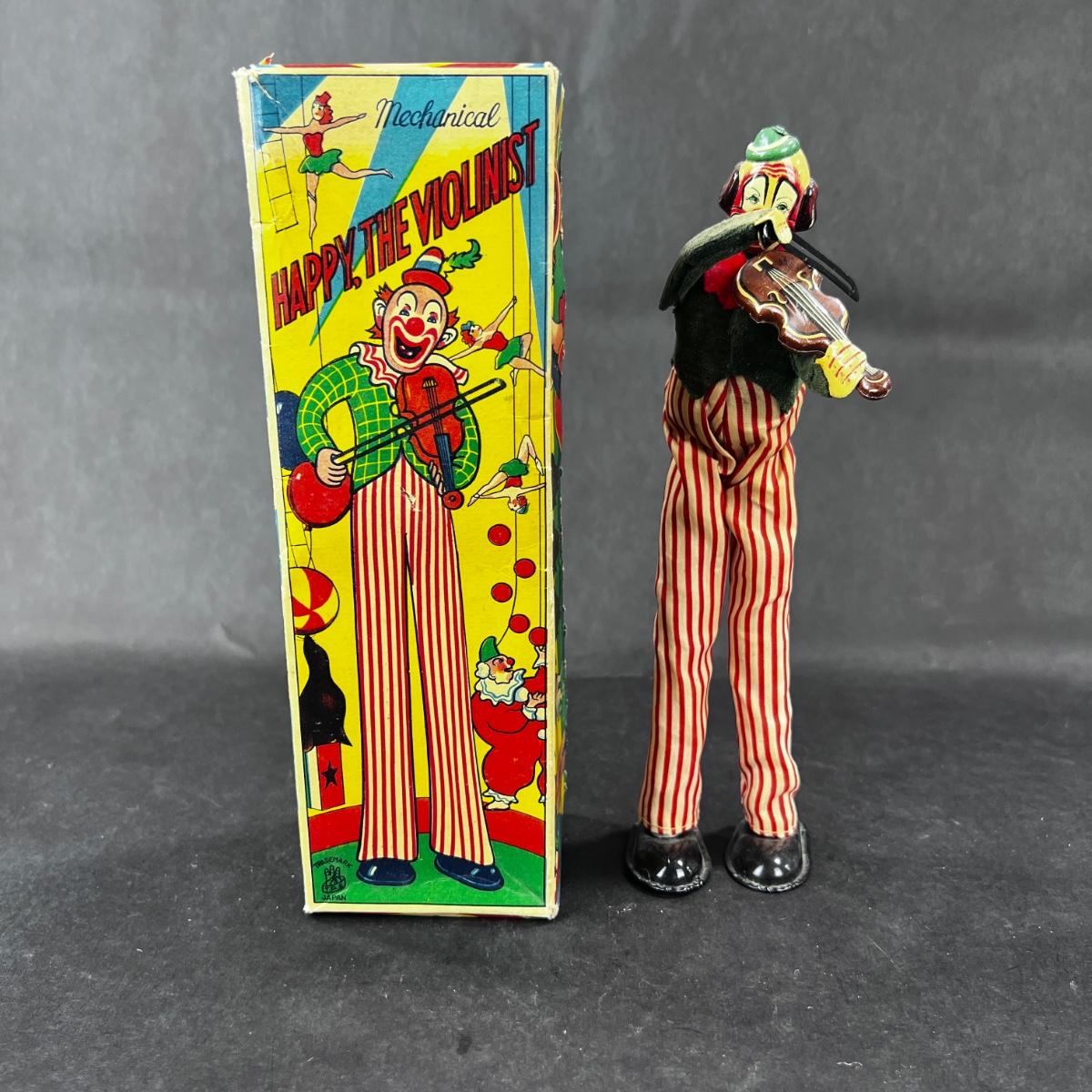 Here's Happy the Violinist - with his box! He'll stand on his tall tall legs and play you a little song to your heart's content. **Works, Video of Function on YouTube Video, Has Key** This Gentleman is approximately 8" tall **|** Please see photos for details and condition. ::: Shipping is available on this lot. If you require shipping you must let us know at the close of the auction. We will coordinate with you after the item has been won. Shipping fees will include insurance up to or exceeding the value of all items being mailed. If you have any questions regarding this lot please contact the auctioneer either via this website, by direct email or by phone. PICK UP TIMES and other important information can be found in the TERMS and DESCRIPTION of the auction. Please take a look for pertinent information. Thanks!