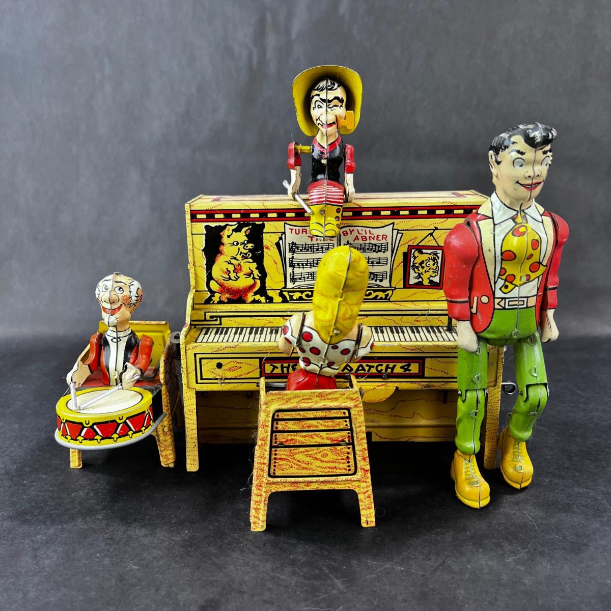 This toy comes with its original box. Also, for those that looked at the previous Lil' Abner band, this one has BOTH arms! **Works, Video of Function on YouTube Video, Has Key** Please see photos for details and condition. This toy was produced by the Ferdinand Strauss Corporation in the mid 1900s. **|** ::: Shipping is available on this lot. If you require shipping you must let us know at the close of the auction. We will coordinate with you after the item has been won. Shipping fees will include insurance up to or exceeding the value of all items being mailed. If you have any questions regarding this lot please contact the auctioneer either via this website, by direct email or by phone. PICK UP TIMES and other important information can be found in the TERMS and DESCRIPTION of the auction. Please take a look for pertinent information. Thanks!