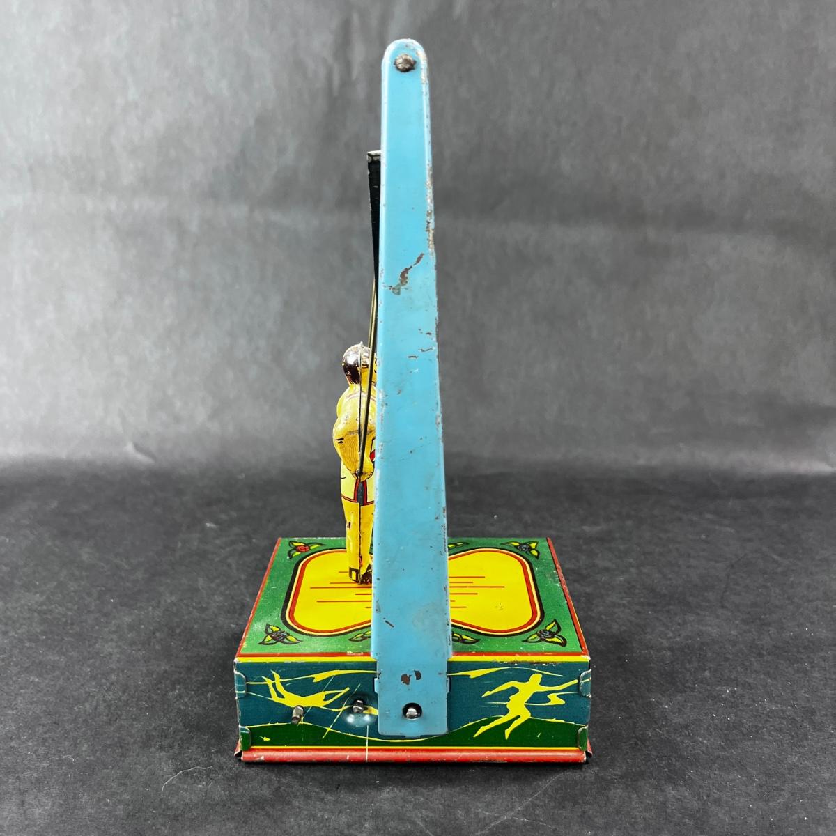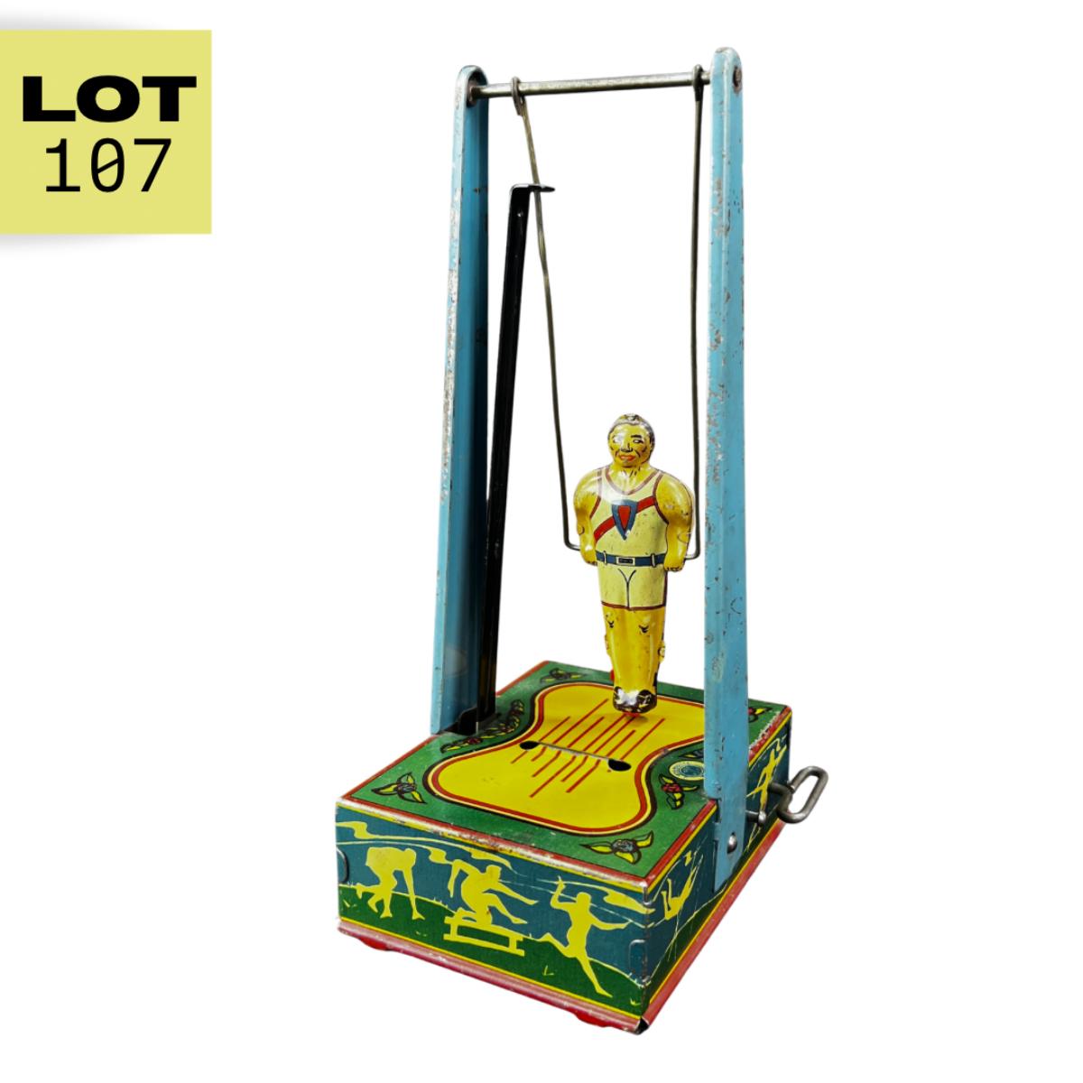 This was one of the last Pre-War 1940s toys that Wyandotte made. This Man on the Flying Trapeze has great action. **Works, Video of Function on YouTube Video, Has Key** Please see photos for details and condition. **|** ::: Shipping is available on this lot. If you require shipping you must let us know at the close of the auction. We will coordinate with you after the item has been won. Shipping fees will include insurance up to or exceeding the value of all items being mailed. If you have any questions regarding this lot please contact the auctioneer either via this website, by direct email or by phone. PICK UP TIMES and other important information can be found in the TERMS and DESCRIPTION of the auction. Please take a look for pertinent information. Thanks!