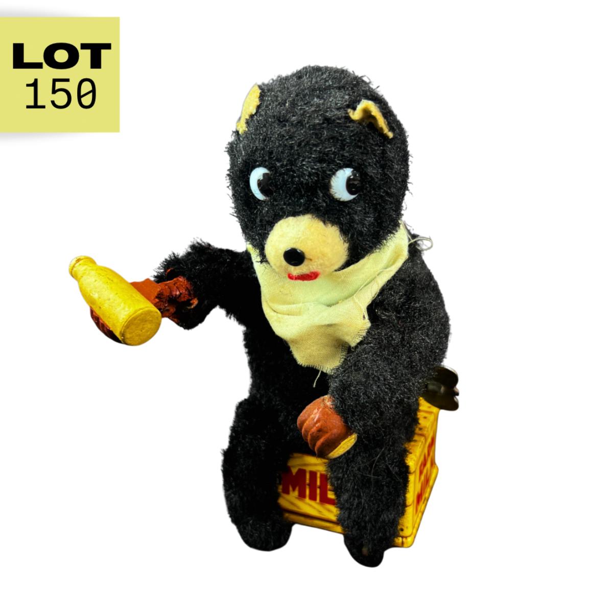 This Vintage Wind-Up of a Milk Drinking Bear is - admittedly - scary. His hand is in bad need of repair. The rubber hands didn't fare well in the Wisconsin weather. Beyond that he works great. Produced in the 1960s and 70s in Japan by Nomura Toys. **Works, Video of Function on YouTube Video, Has Key** Please see photos for details and condition. **|** ::: Shipping is available on this lot. If you require shipping you must let us know at the close of the auction. We will coordinate with you after the item has been won. Shipping fees will include insurance up to or exceeding the value of all items being mailed. If you have any questions regarding this lot please contact the auctioneer either via this website, by direct email or by phone. PICK UP TIMES and other important information can be found in the TERMS and DESCRIPTION of the auction. Please take a look for pertinent information. Thanks!