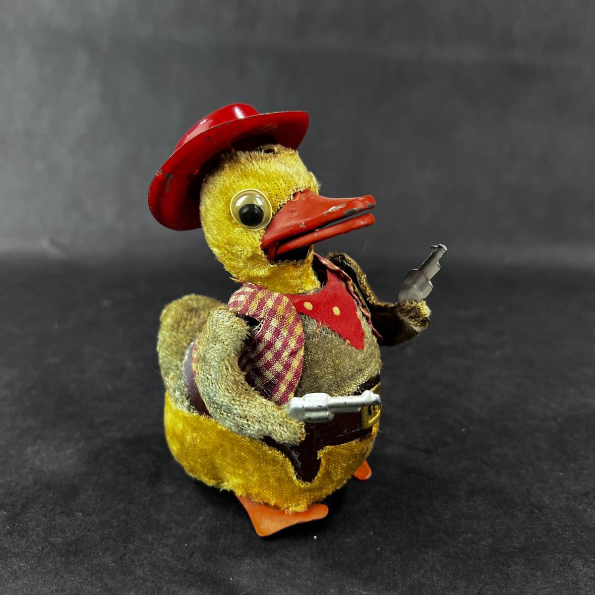 This Pistol Packing Duck by Nomura was produced in Japan in the 1960s. This duck has forward motion and "gun" sounds. This iconic duck does not come with its original box, but don't let that stop you from bidding! This duck does NOT come with a key. **Works, Video of Function on YouTube Video** Please see photos for details and condition. **|** ::: Shipping is available on this lot. If you require shipping you must let us know at the close of the auction. We will coordinate with you after the item has been won. Shipping fees will include insurance up to or exceeding the value of all items being mailed. If you have any questions regarding this lot please contact the auctioneer either via this website, by direct email or by phone. PICK UP TIMES and other important information can be found in the TERMS and DESCRIPTION of the auction. Please take a look for pertinent information. Thanks!