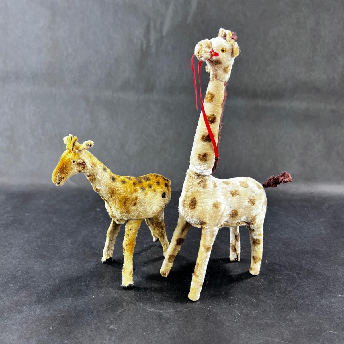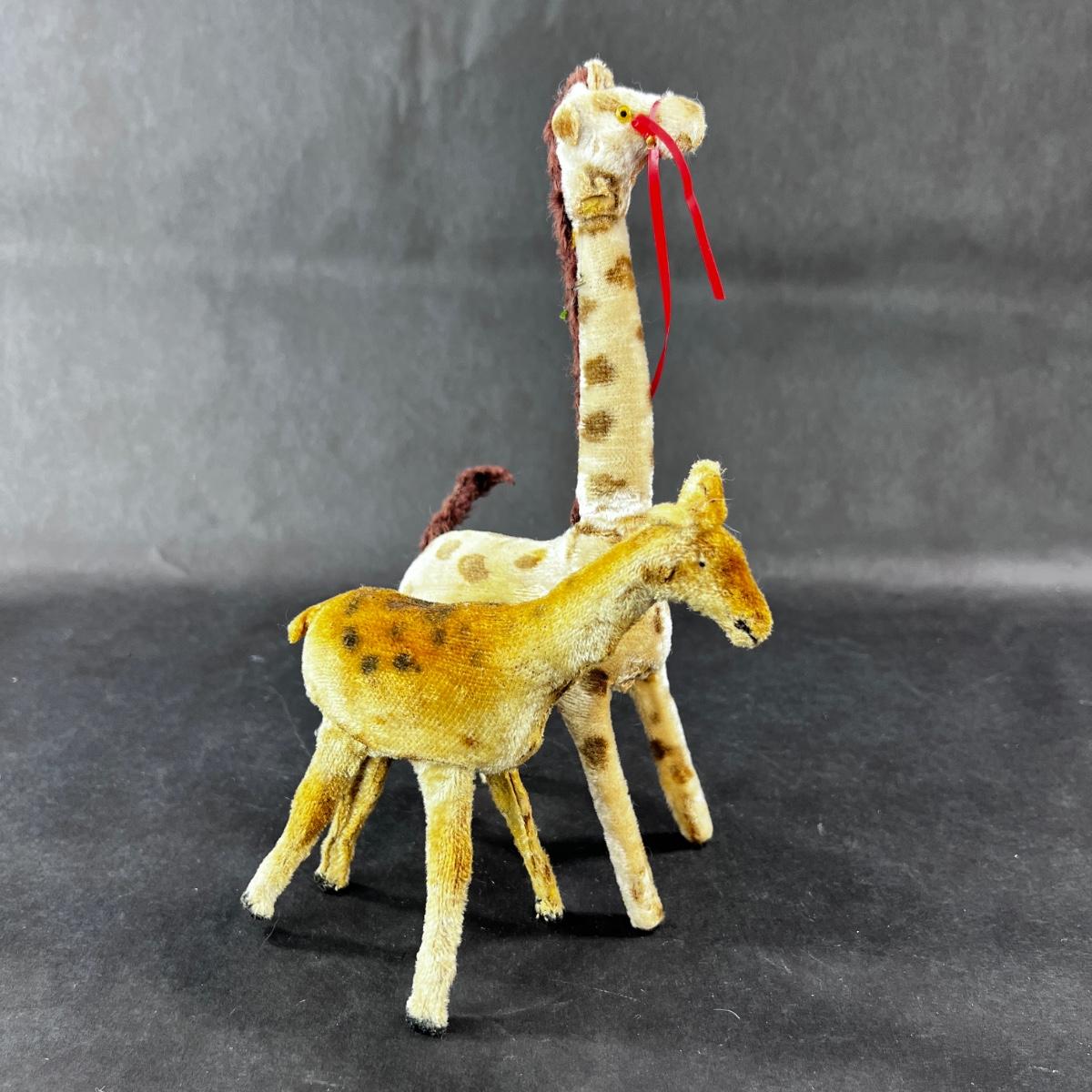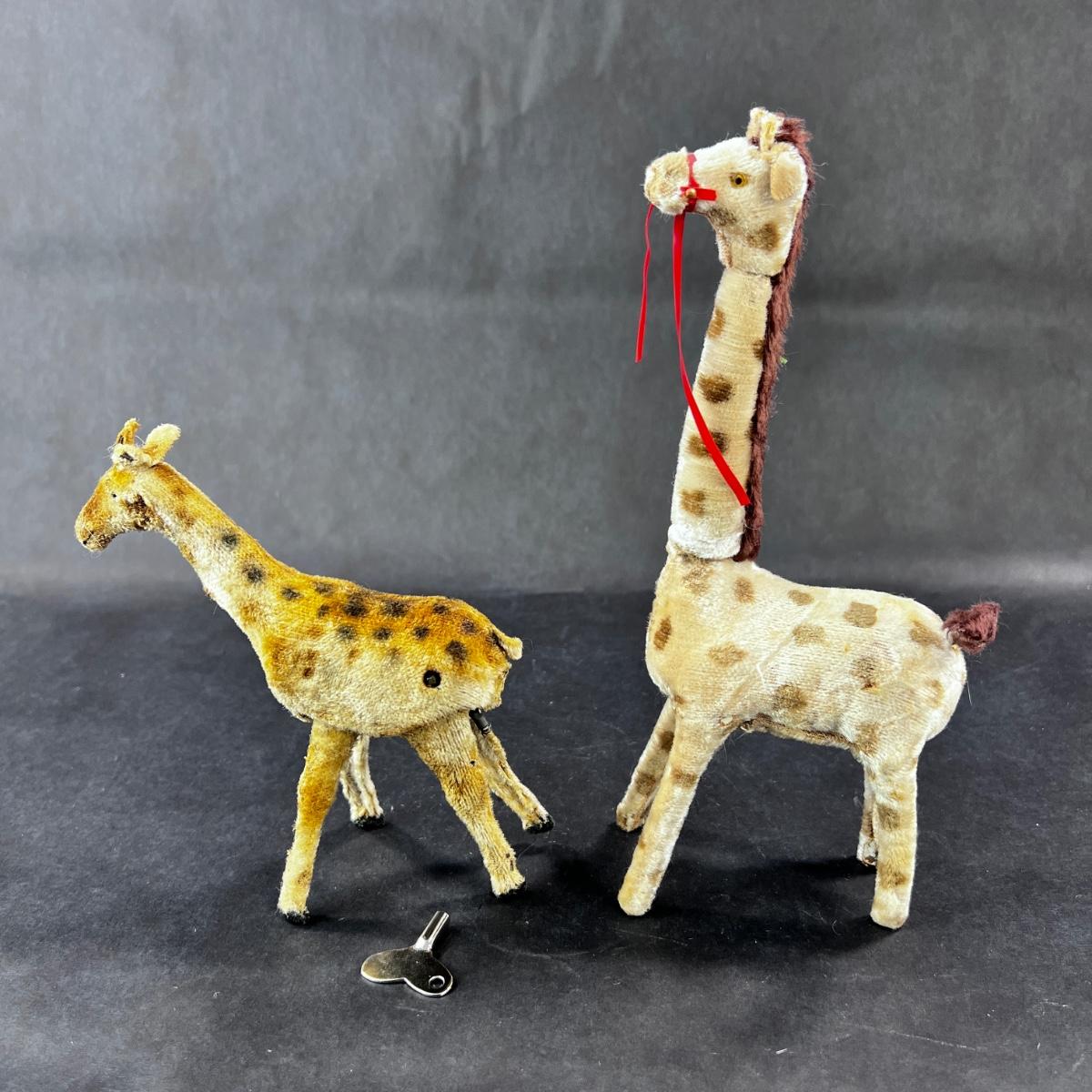 A nice pair of Plush Giraffes. Neither are marked. But Momma and Baby are happy as can be. They both work - albeit differently. The tall one spins their tail and changes head direction. The small one WANTS to run across the table, but only goes crazy when you hold him up. Both come with keys. Video of the described motions is in the YouTube video. **|** Please see photos for details and condition. ::: Shipping is available on this lot. If you require shipping you must let us know at the close of the auction. We will coordinate with you after the item has been won. Shipping fees will include insurance up to or exceeding the value of all items being mailed. If you have any questions regarding this lot please contact the auctioneer either via this website, by direct email or by phone. PICK UP TIMES and other important information can be found in the TERMS and DESCRIPTION of the auction. Please take a look for pertinent information. Thanks!