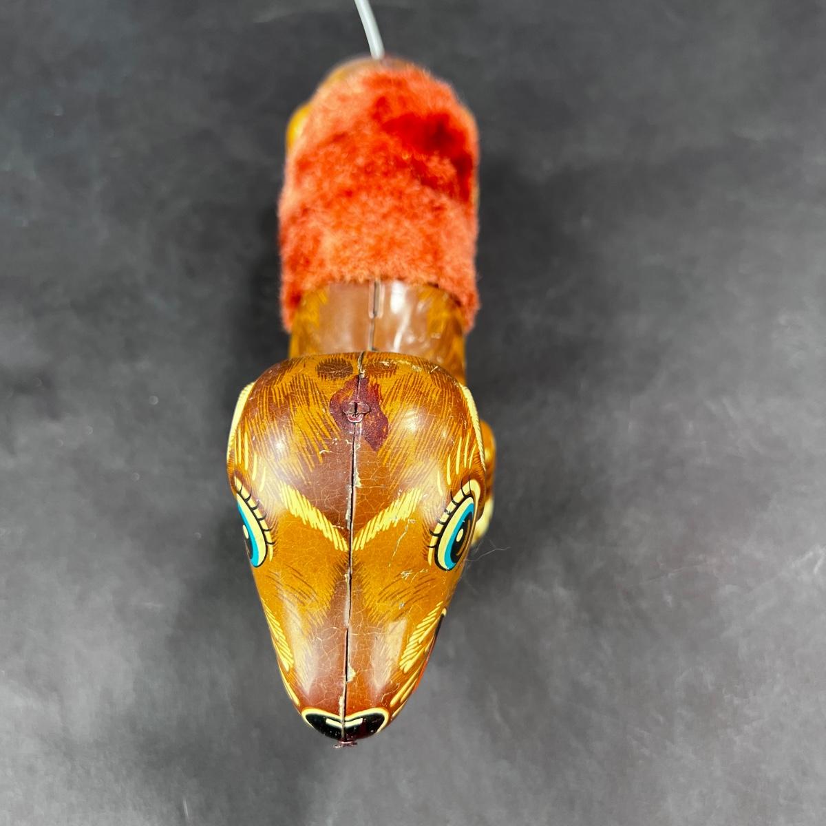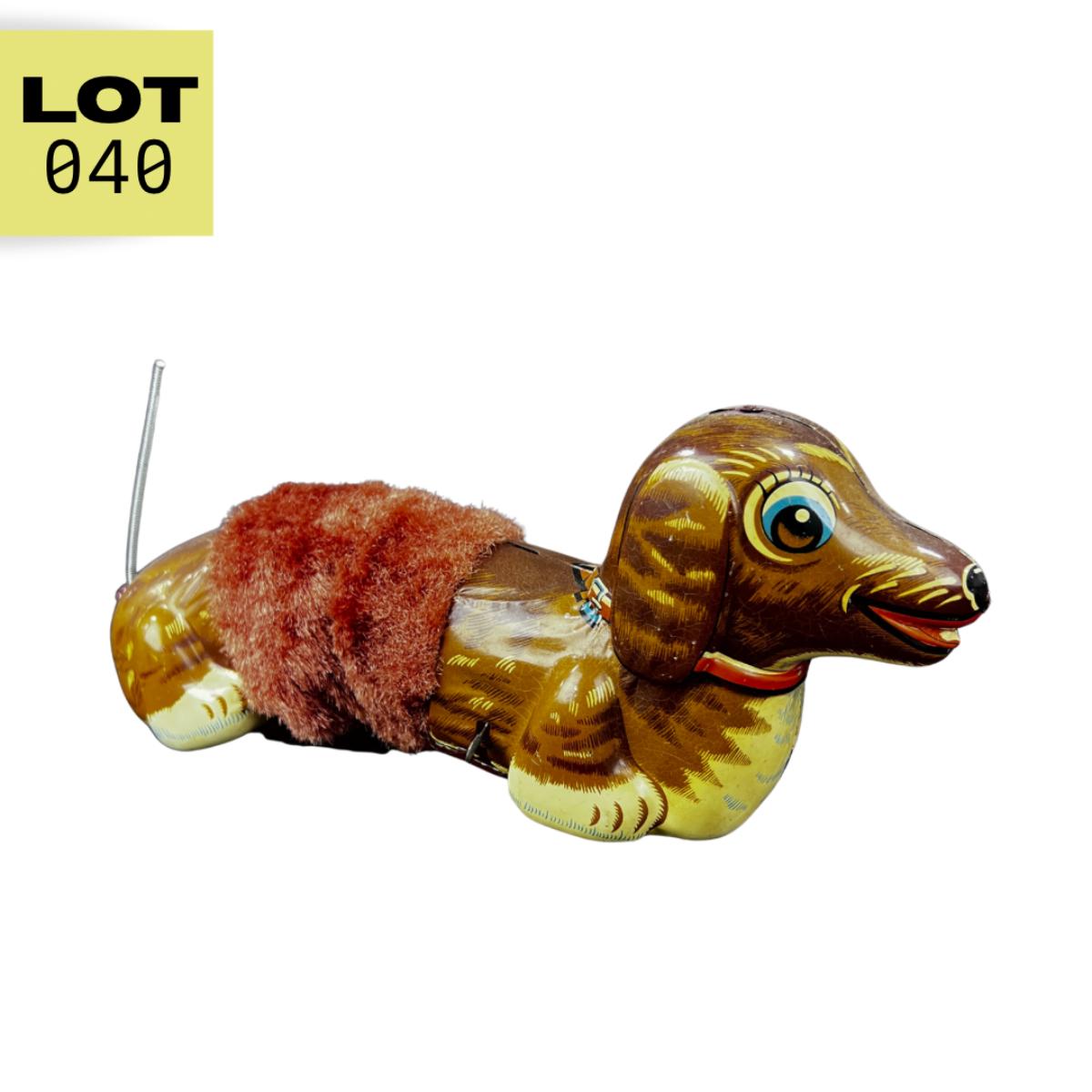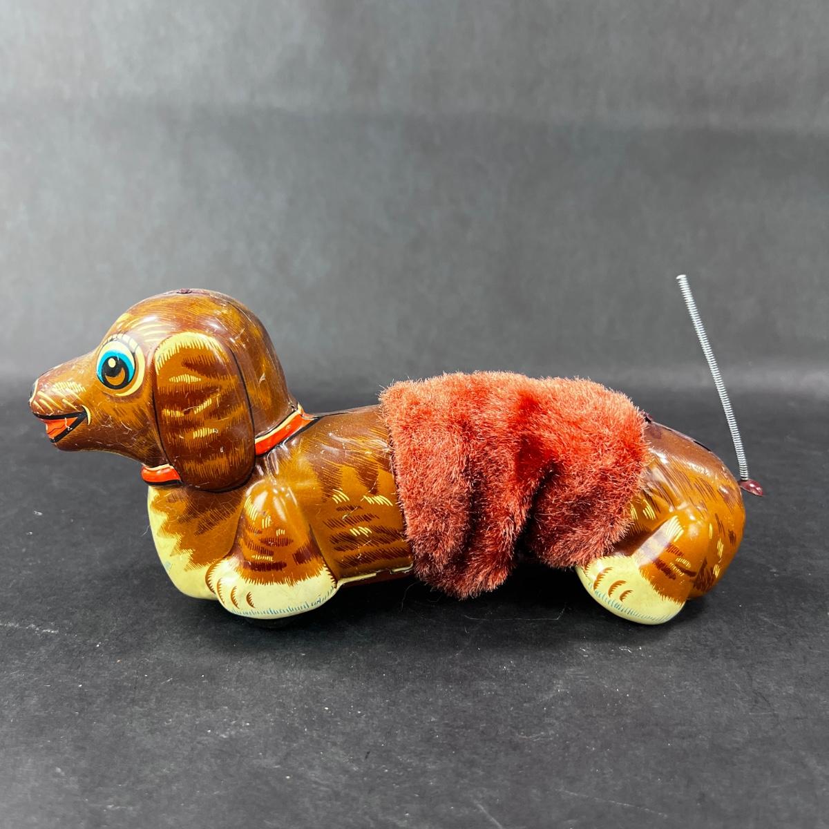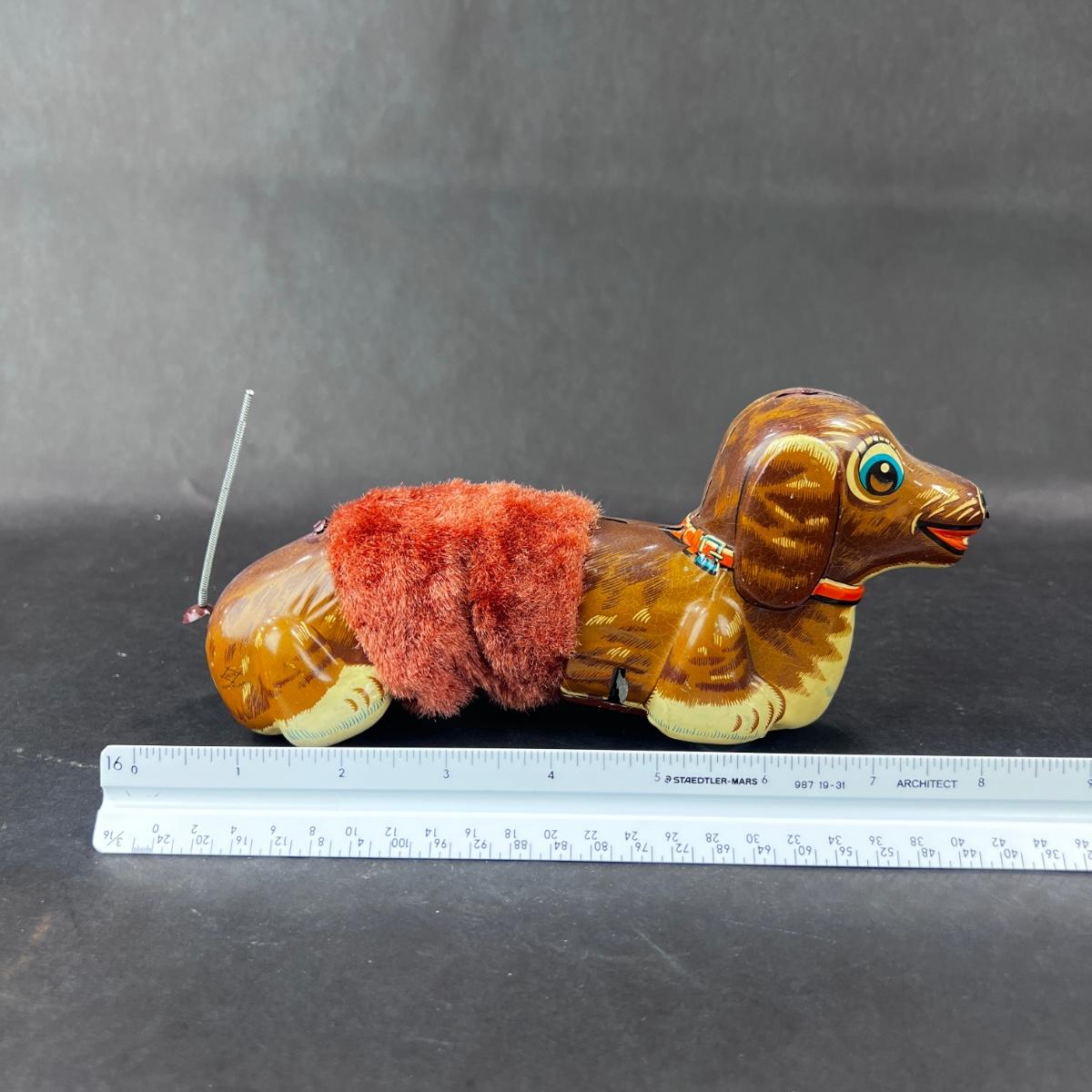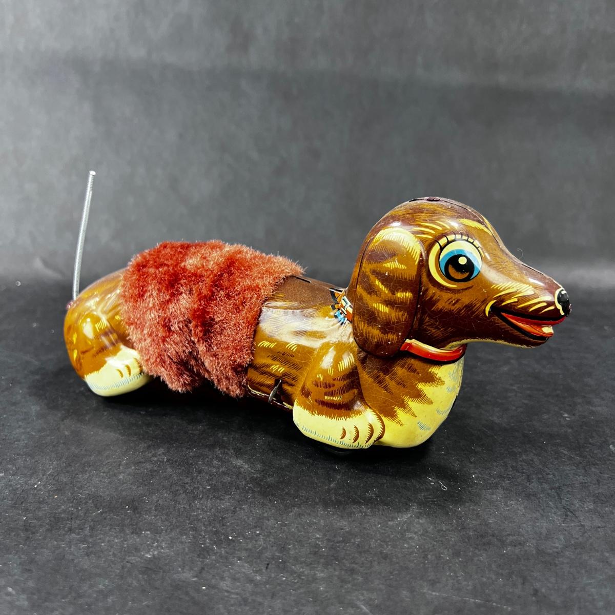A Running Dachshund, right into your arms! This little guy has a plush middle so that he can slinky across the room. Produced by DAIYA in the 1960s. **Works, Video of Function on YouTube Video, Has Key** **|** Please see photos for details and condition. ::: Shipping is available on this lot. If you require shipping you must let us know at the close of the auction. We will coordinate with you after the item has been won. Shipping fees will include insurance up to or exceeding the value of all items being mailed. If you have any questions regarding this lot please contact the auctioneer either via this website, by direct email or by phone. PICK UP TIMES and other important information can be found in the TERMS and DESCRIPTION of the auction. Please take a look for pertinent information. Thanks!