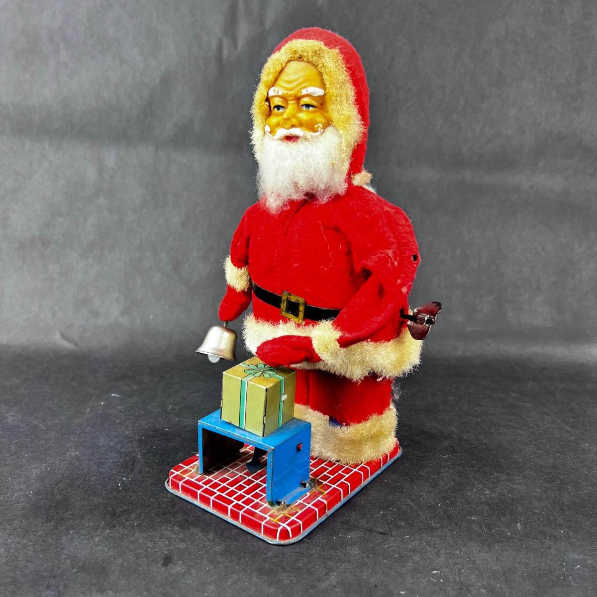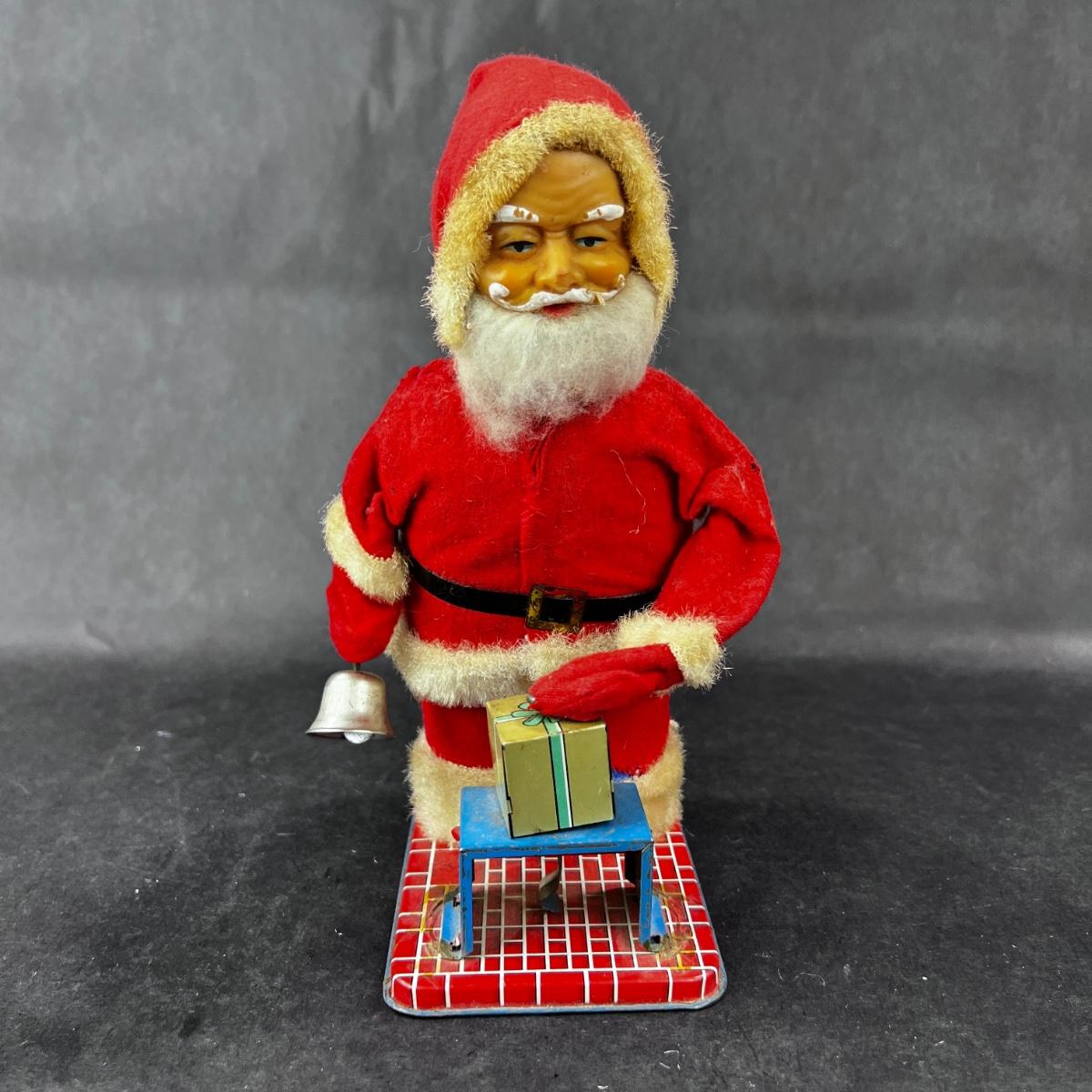 This Vintage Wind-Up Santa is missing his "Sack" The present should look like it's coming out of a sack as the magnet on his hand lifts the present up to give it away. This toy was produced in the mid 1900s by Yonezawa. **Works, Video of Function on YouTube Video, Has Key** **|** Please see photos for details and condition. ::: Shipping is available on this lot. If you require shipping you must let us know at the close of the auction. We will coordinate with you after the item has been won. Shipping fees will include insurance up to or exceeding the value of all items being mailed. If you have any questions regarding this lot please contact the auctioneer either via this website, by direct email or by phone. PICK UP TIMES and other important information can be found in the TERMS and DESCRIPTION of the auction. Please take a look for pertinent information. Thanks!