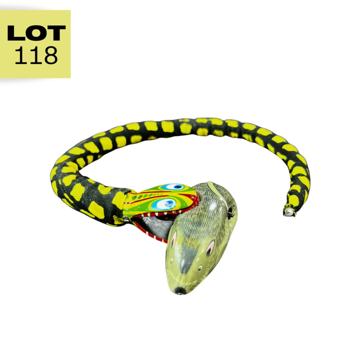 This Snake and Mouse Wind-Up was produced in Japan in the late 1900s. The snake has wiggly action while trying to kill its prey. **Works, Video of Function on YouTube Video**. This snake does NOT come with a Key. Please see photos for details and condition. **|** ::: Shipping is available on this lot. If you require shipping you must let us know at the close of the auction. We will coordinate with you after the item has been won. Shipping fees will include insurance up to or exceeding the value of all items being mailed. If you have any questions regarding this lot please contact the auctioneer either via this website, by direct email or by phone. PICK UP TIMES and other important information can be found in the TERMS and DESCRIPTION of the auction. Please take a look for pertinent information. Thanks!