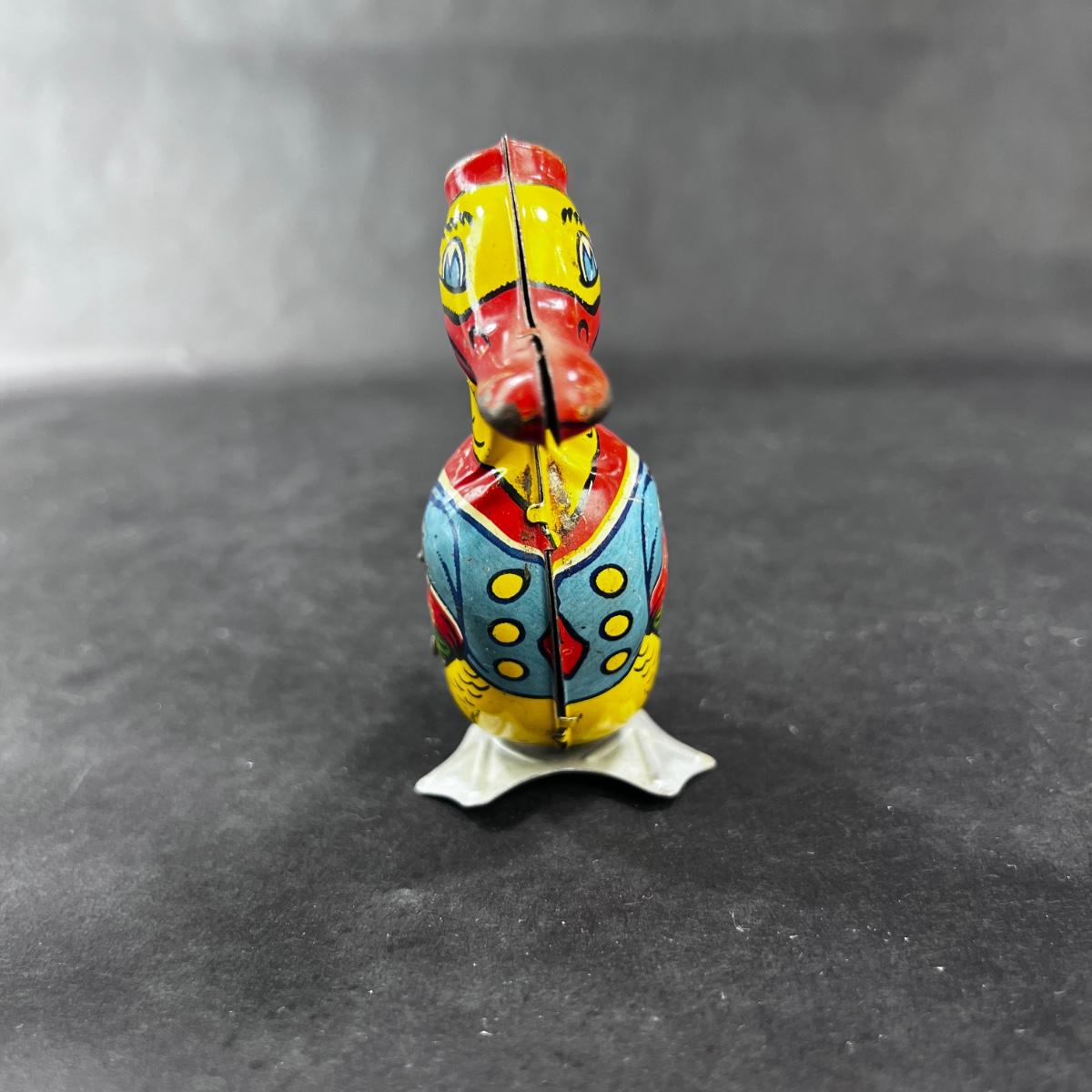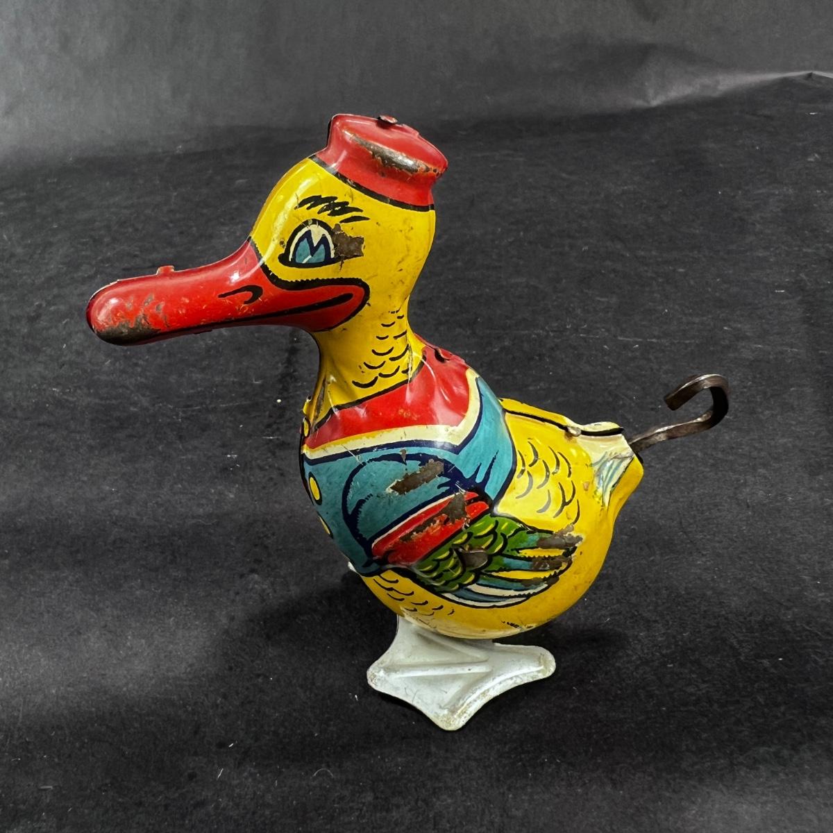 Produced by J Chein in the mid 1900s. This duck, unfortunately, does not work. He may be overwound. Please see photos for details and condition. **|** ::: Shipping is available on this lot. If you require shipping you must let us know at the close of the auction. We will coordinate with you after the item has been won. Shipping fees will include insurance up to or exceeding the value of all items being mailed. If you have any questions regarding this lot please contact the auctioneer either via this website, by direct email or by phone. PICK UP TIMES and other important information can be found in the TERMS and DESCRIPTION of the auction. Please take a look for pertinent information. Thanks!