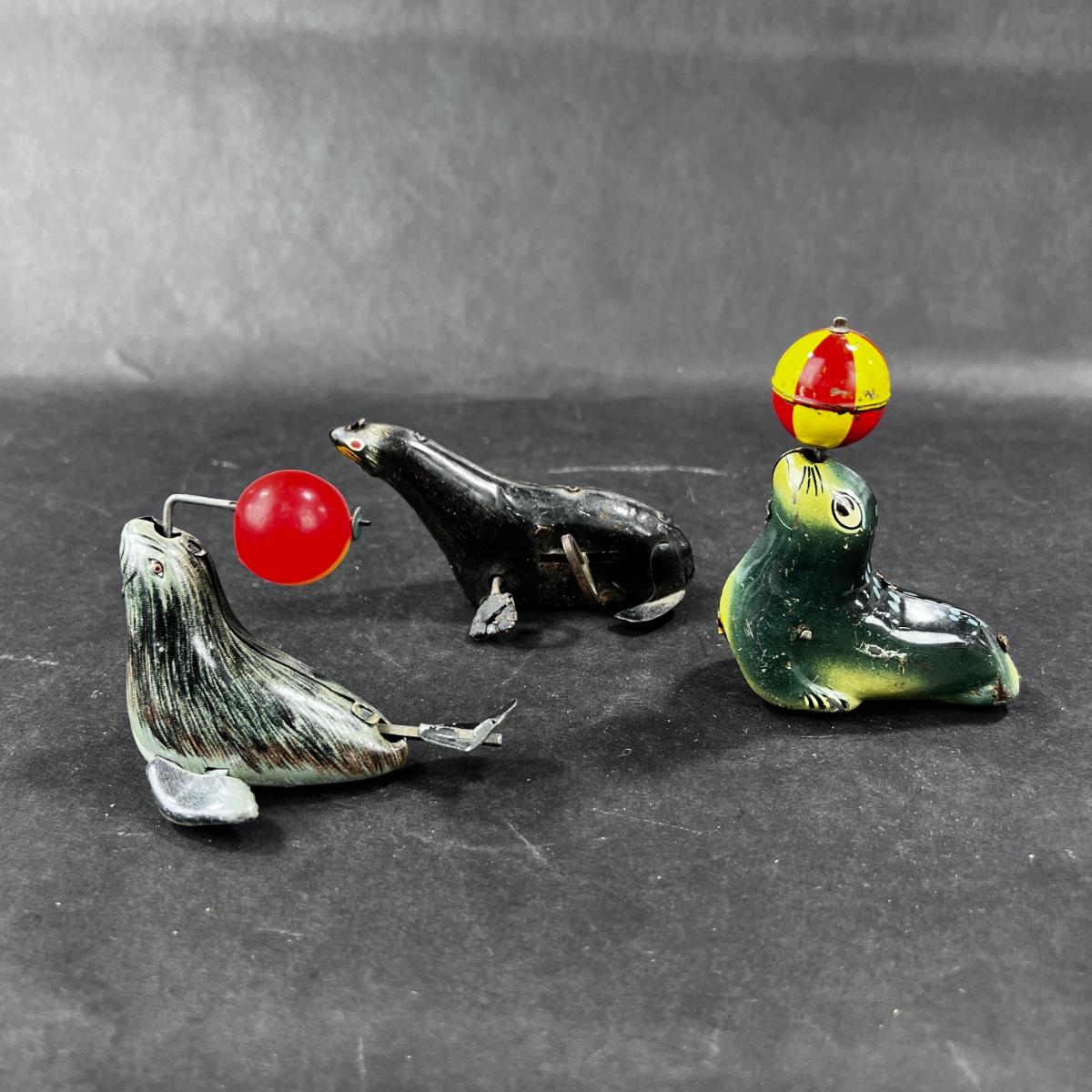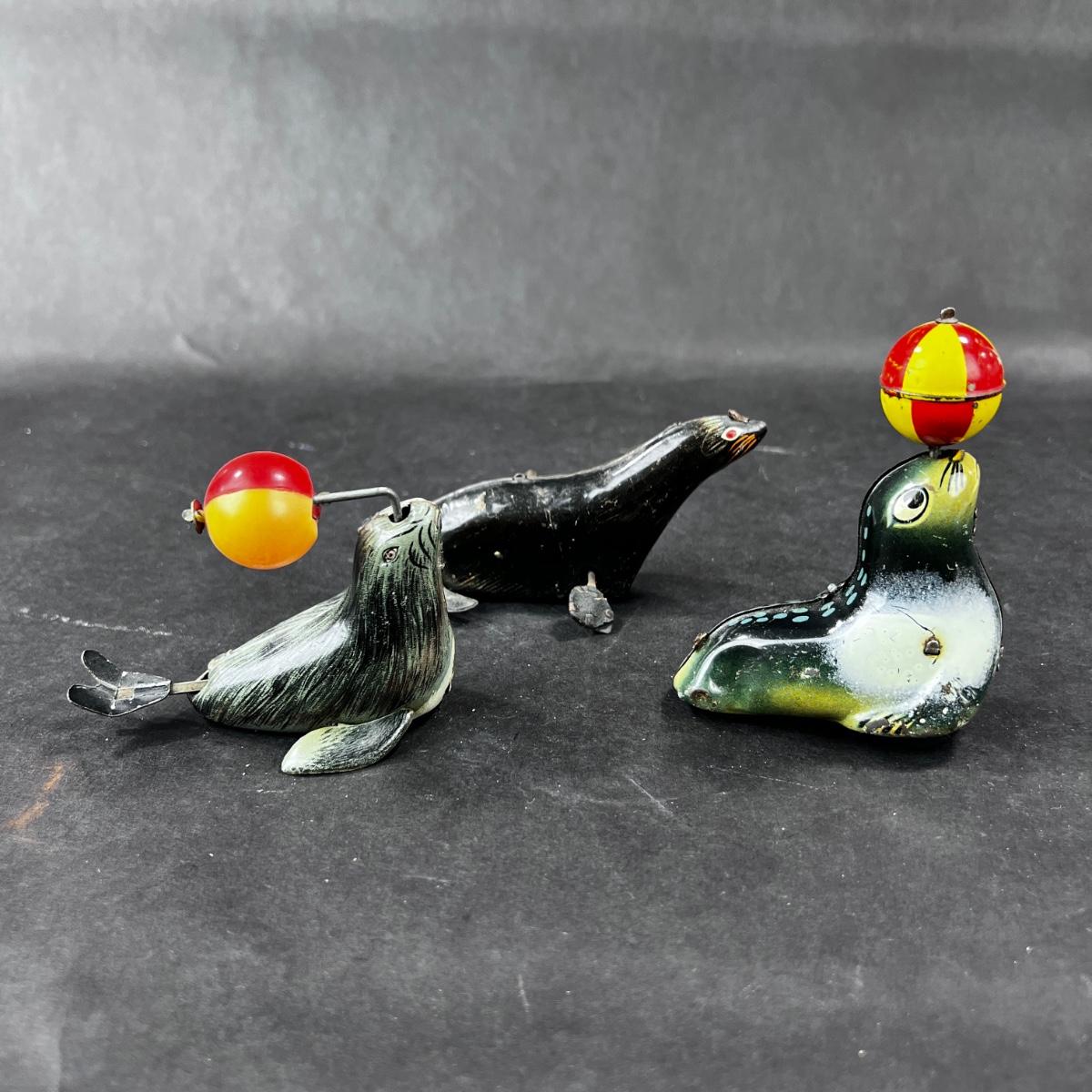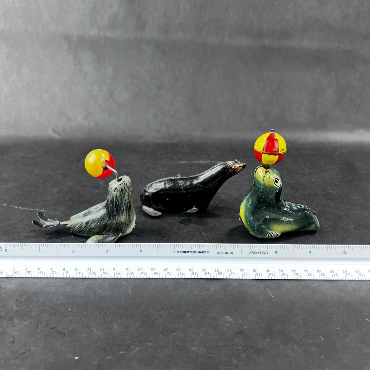 An attractive trio of seals awaits you! All three in working order. The seal with the two-tone ball is a friction toy, hard to illustrate. **Works, Video of Function on YouTube Video, Has Key** **|** Please see photos for details and condition. ::: Shipping is available on this lot. If you require shipping you must let us know at the close of the auction. We will coordinate with you after the item has been won. Shipping fees will include insurance up to or exceeding the value of all items being mailed. If you have any questions regarding this lot please contact the auctioneer either via this website, by direct email or by phone. PICK UP TIMES and other important information can be found in the TERMS and DESCRIPTION of the auction. Please take a look for pertinent information. Thanks!