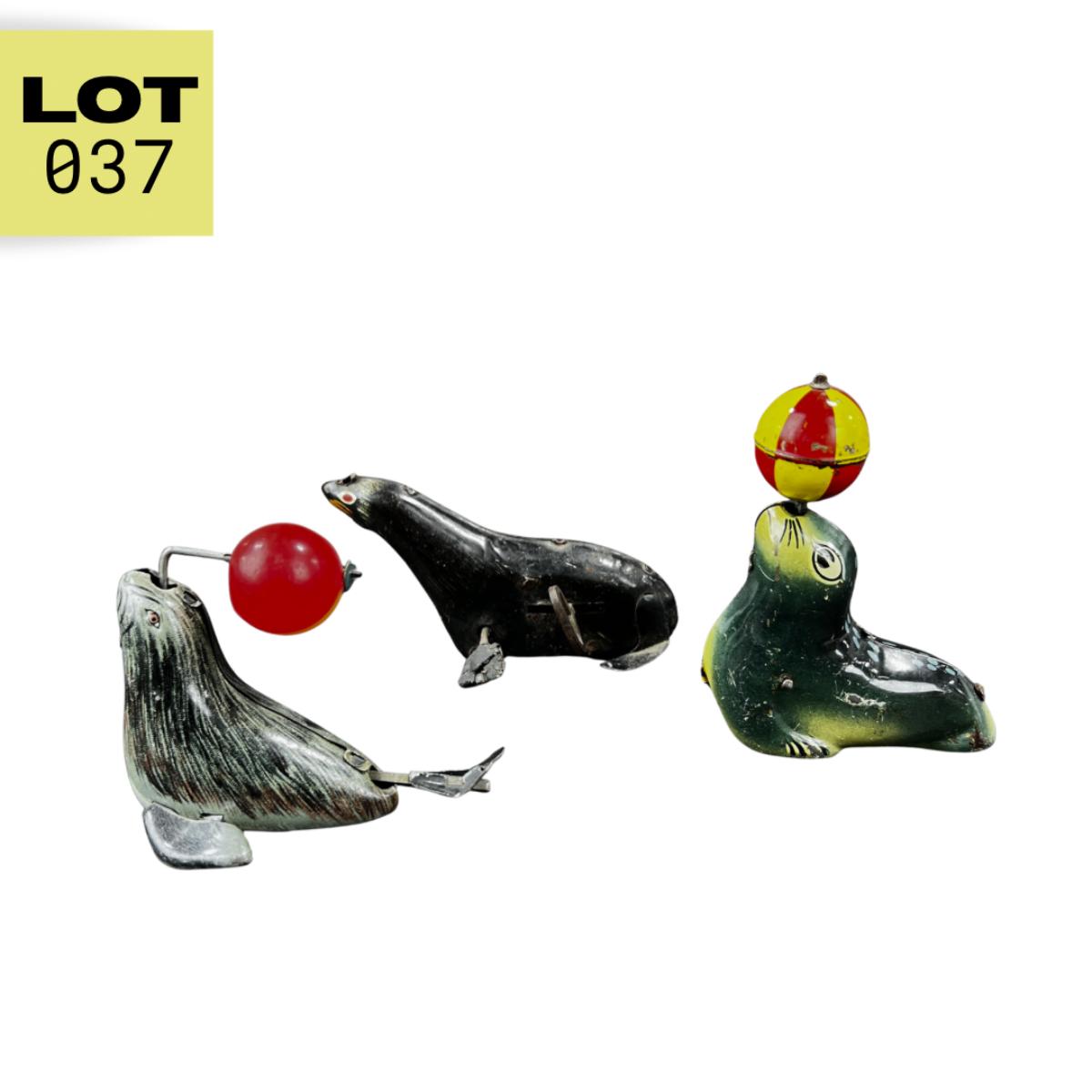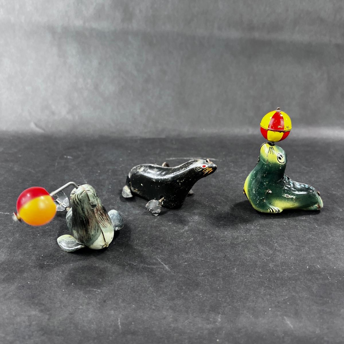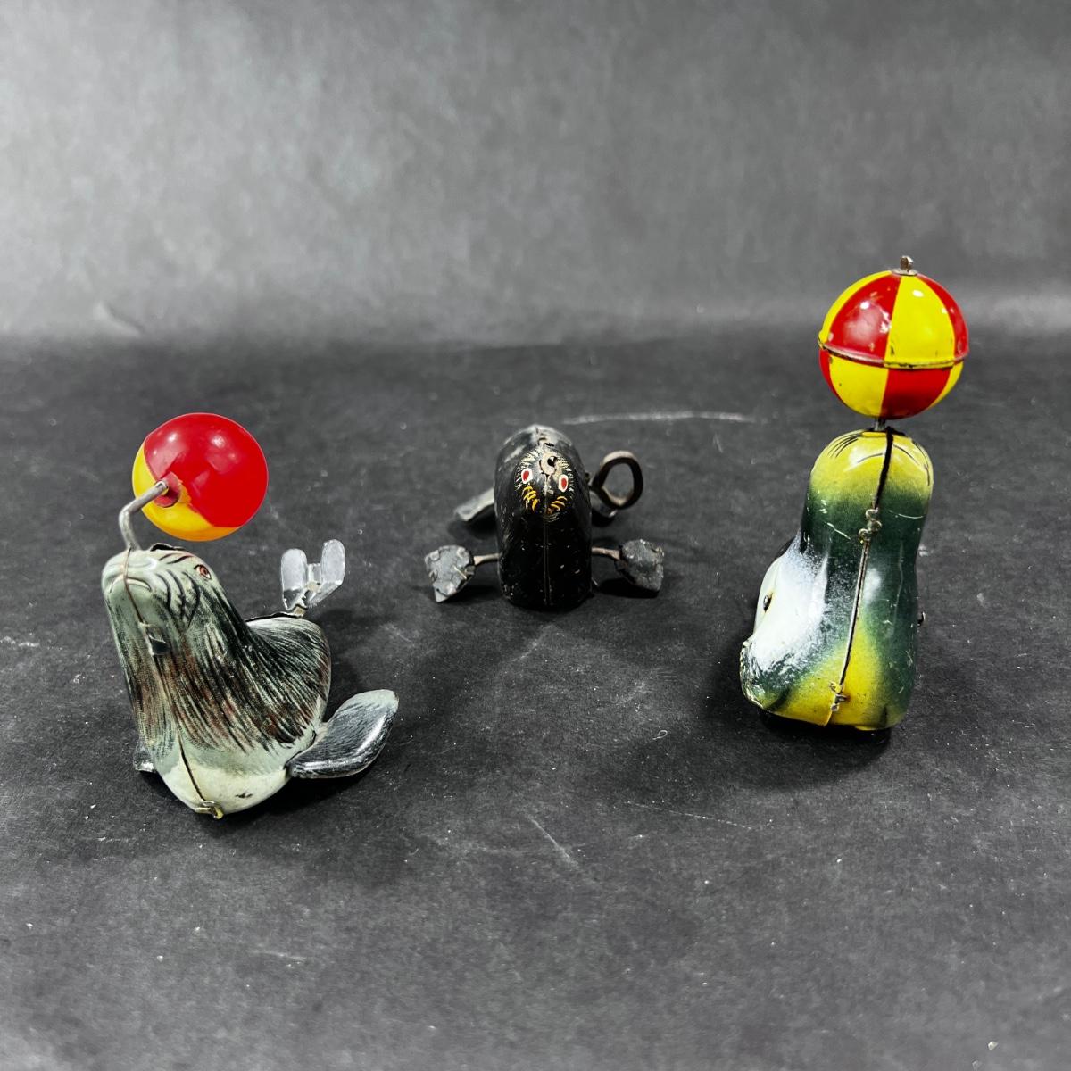 An attractive trio of seals awaits you! All three in working order. The seal with the two-tone ball is a friction toy, hard to illustrate. **Works, Video of Function on YouTube Video, Has Key** **|** Please see photos for details and condition. ::: Shipping is available on this lot. If you require shipping you must let us know at the close of the auction. We will coordinate with you after the item has been won. Shipping fees will include insurance up to or exceeding the value of all items being mailed. If you have any questions regarding this lot please contact the auctioneer either via this website, by direct email or by phone. PICK UP TIMES and other important information can be found in the TERMS and DESCRIPTION of the auction. Please take a look for pertinent information. Thanks!