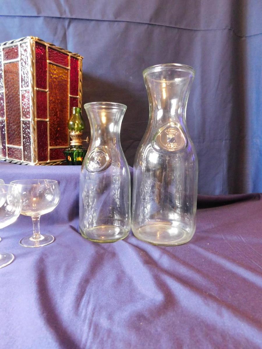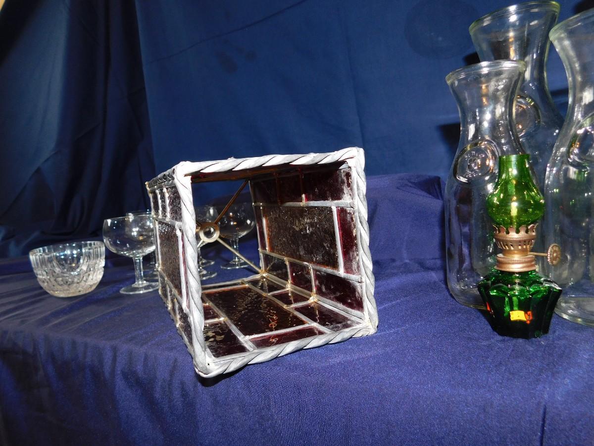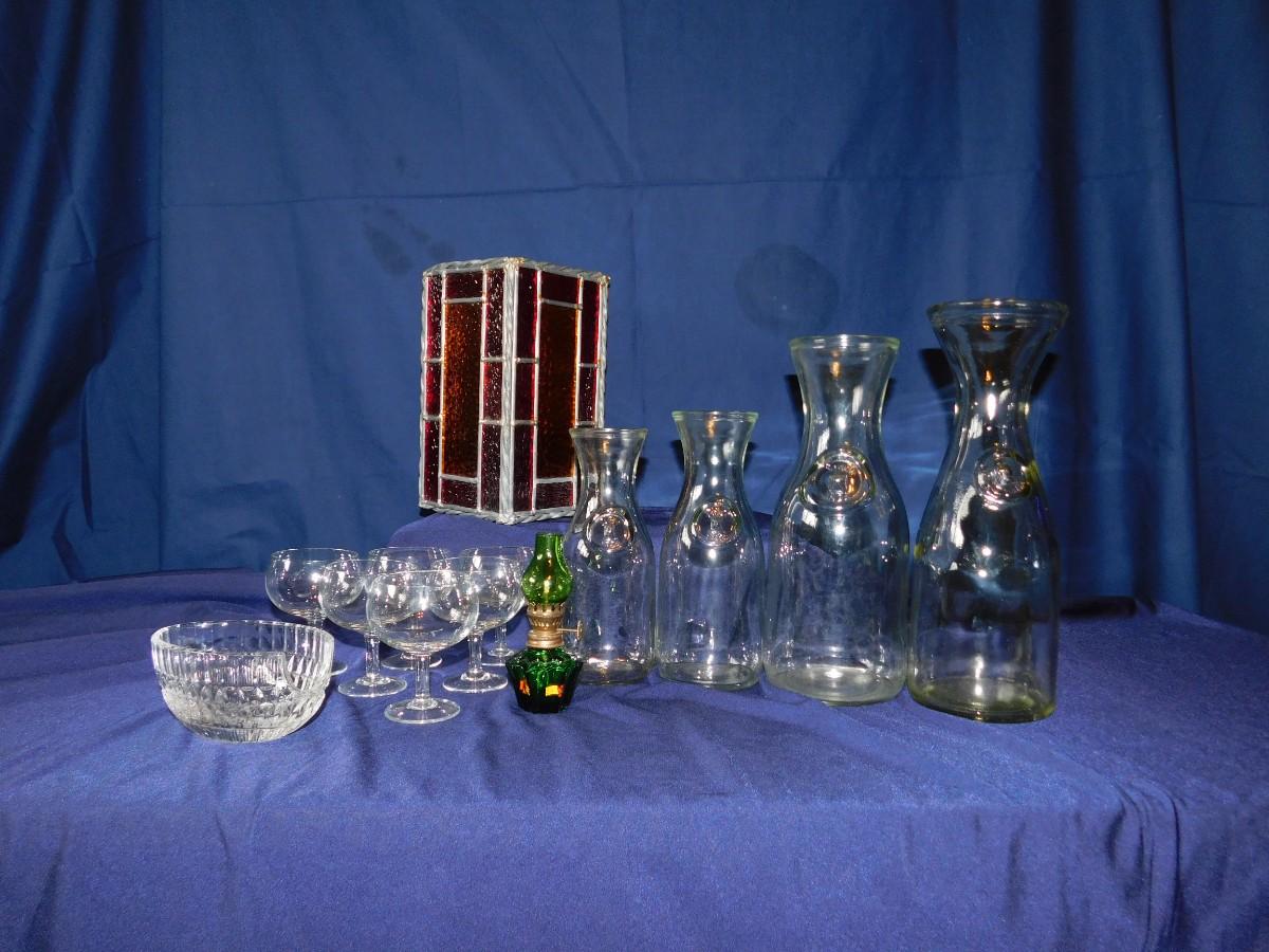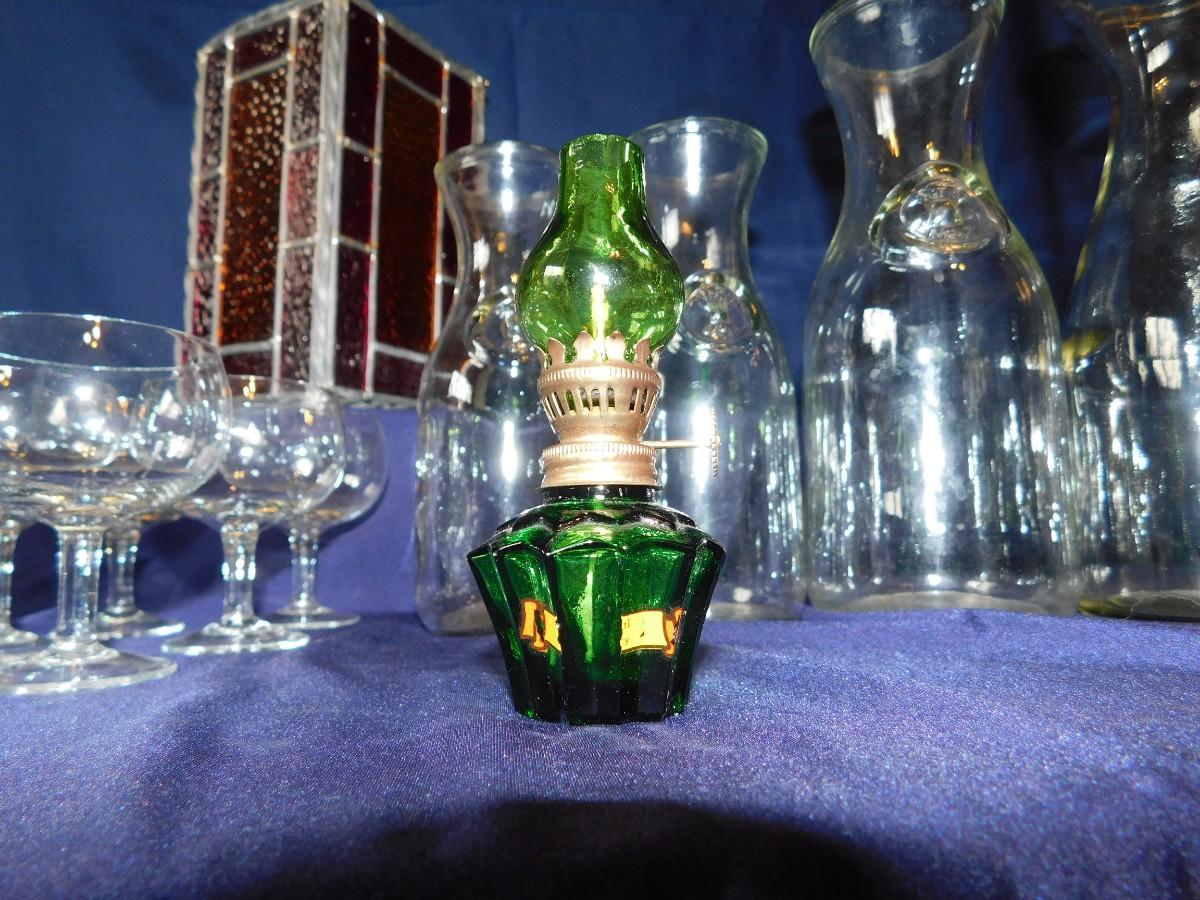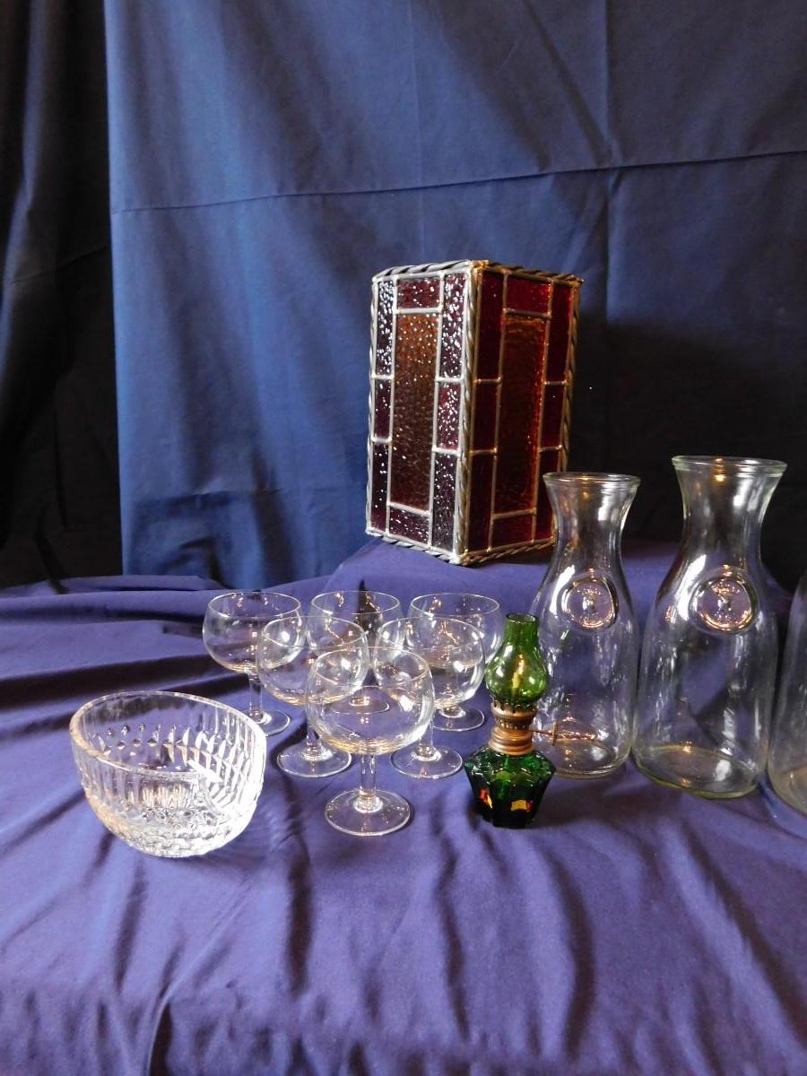 VINTAGE WINE BOTTLE'S IN 4 SIZES, CUTE LITTLE STEMWARE, A STAINED GLASS LIGHT SHADE, & BABY OIL LAMP