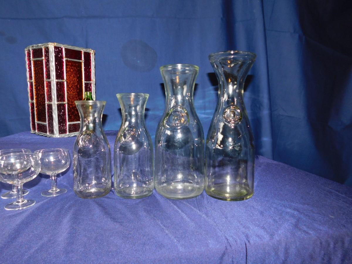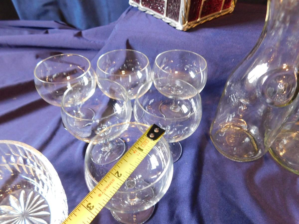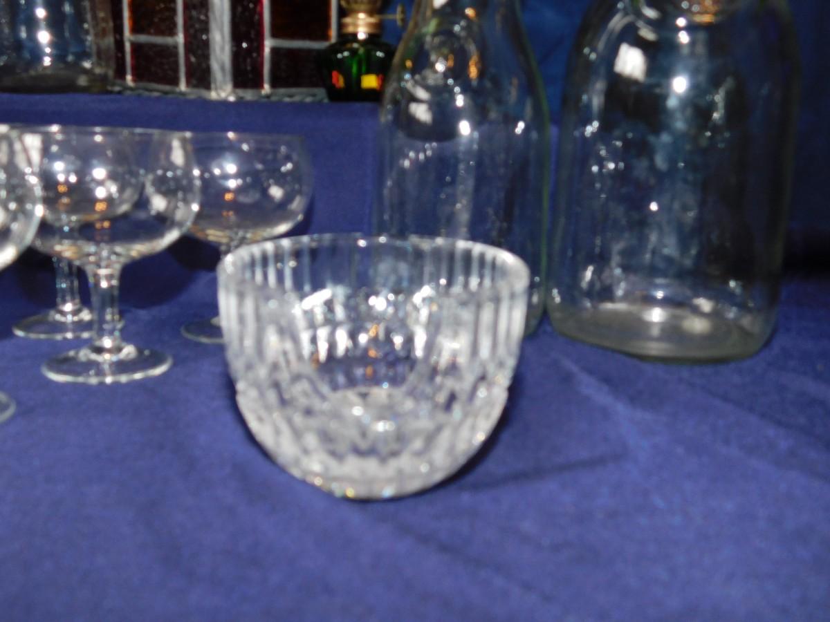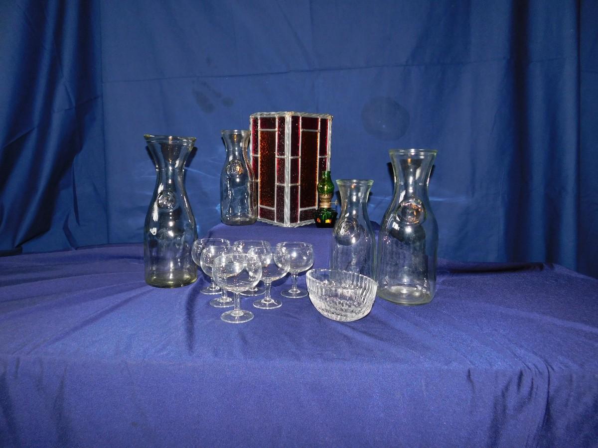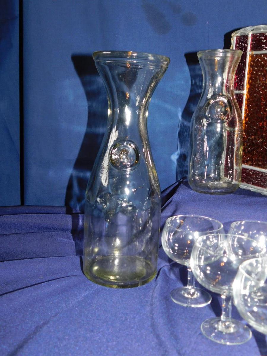 VINTAGE WINE BOTTLE'S IN 4 SIZES, CUTE LITTLE STEMWARE, A STAINED GLASS LIGHT SHADE, & BABY OIL LAMP