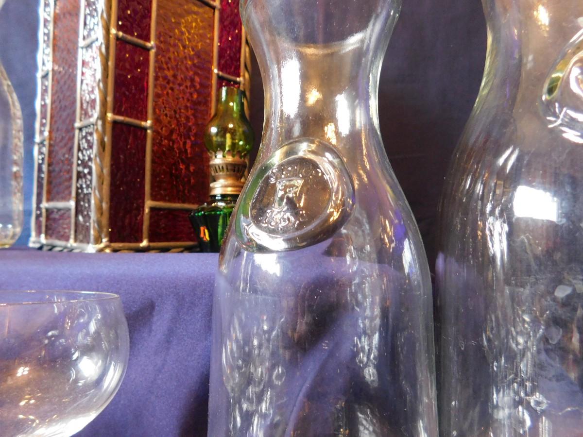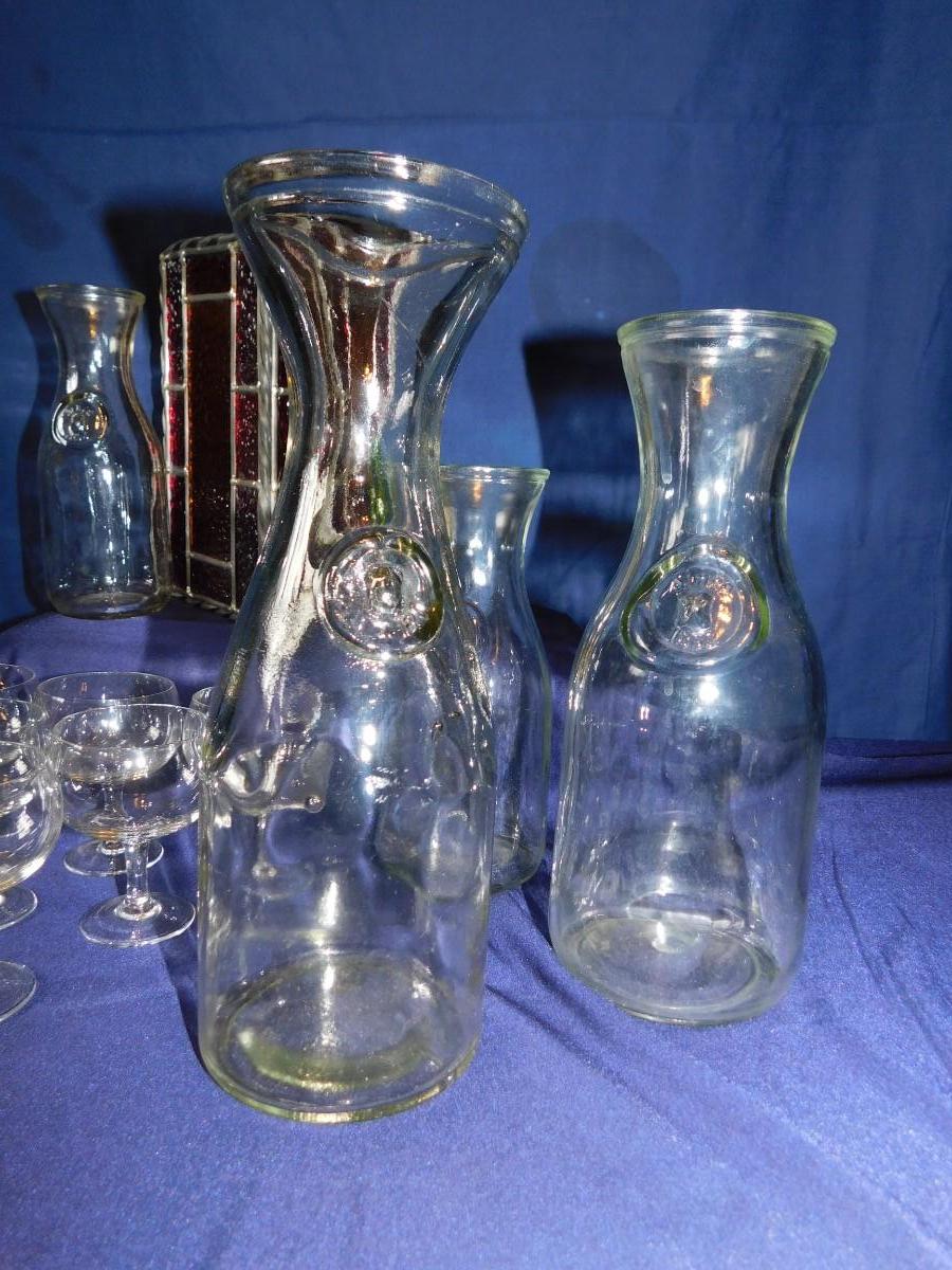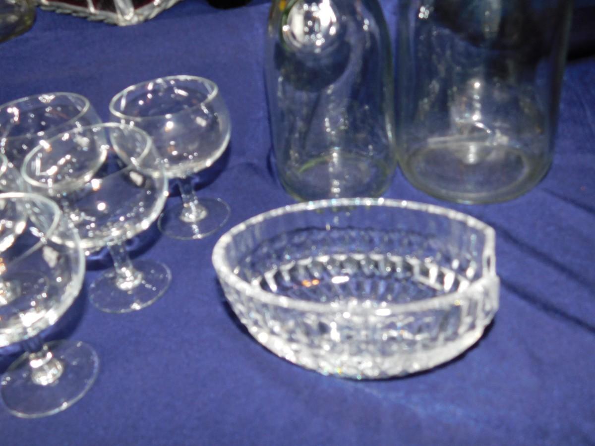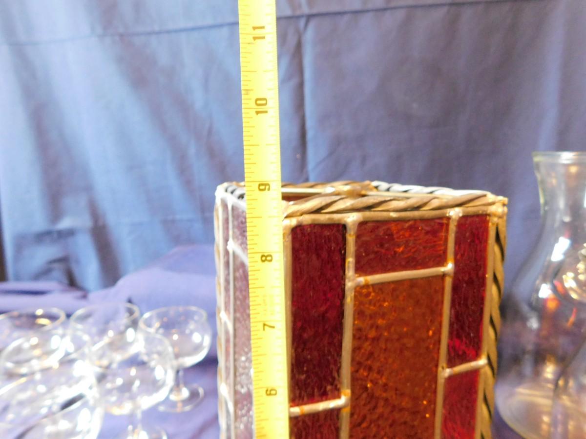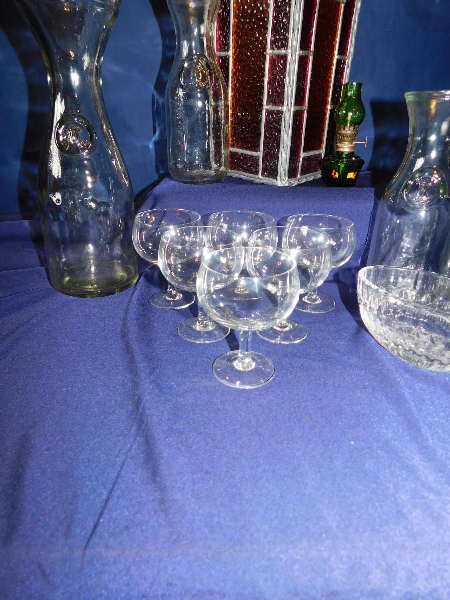 VINTAGE WINE BOTTLE'S IN 4 SIZES, CUTE LITTLE STEMWARE, A STAINED GLASS LIGHT SHADE, & BABY OIL LAMP