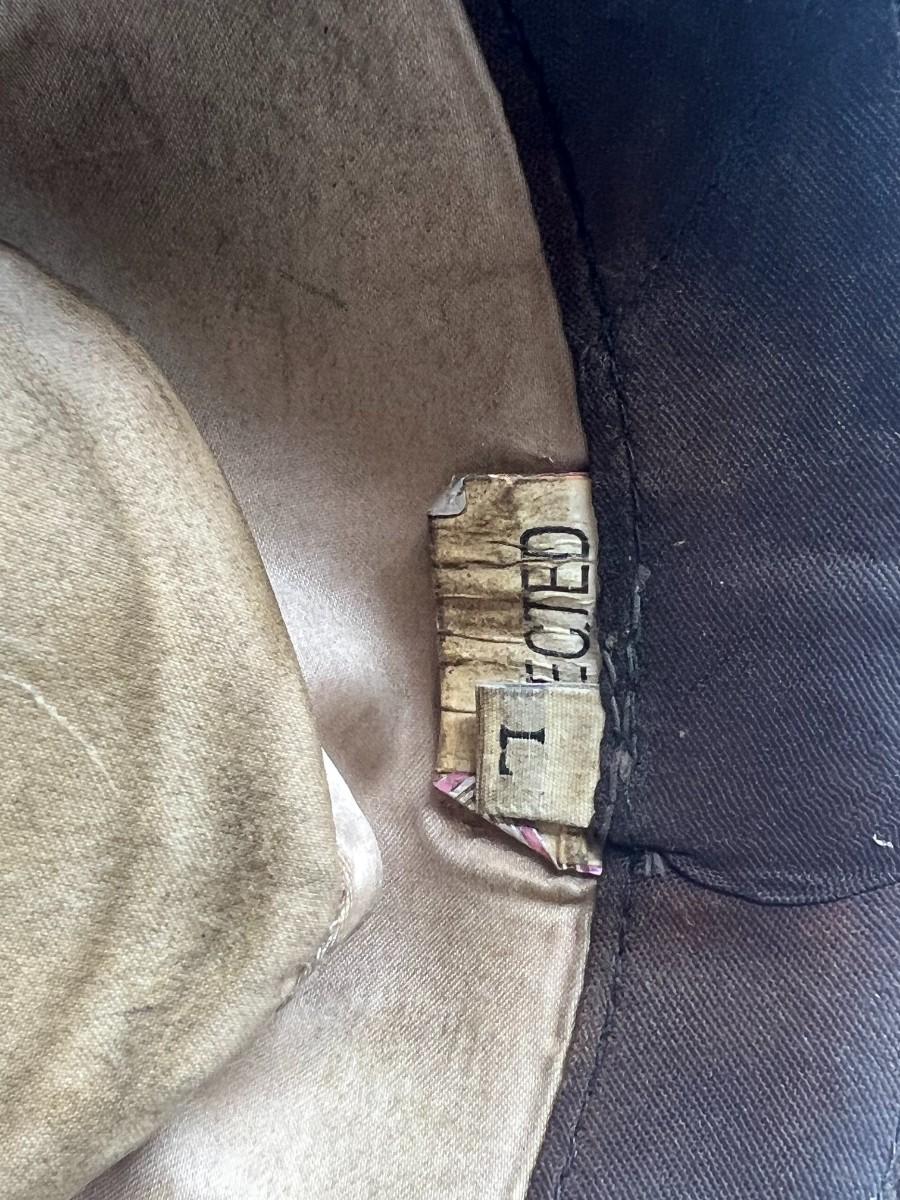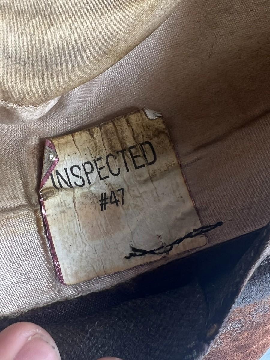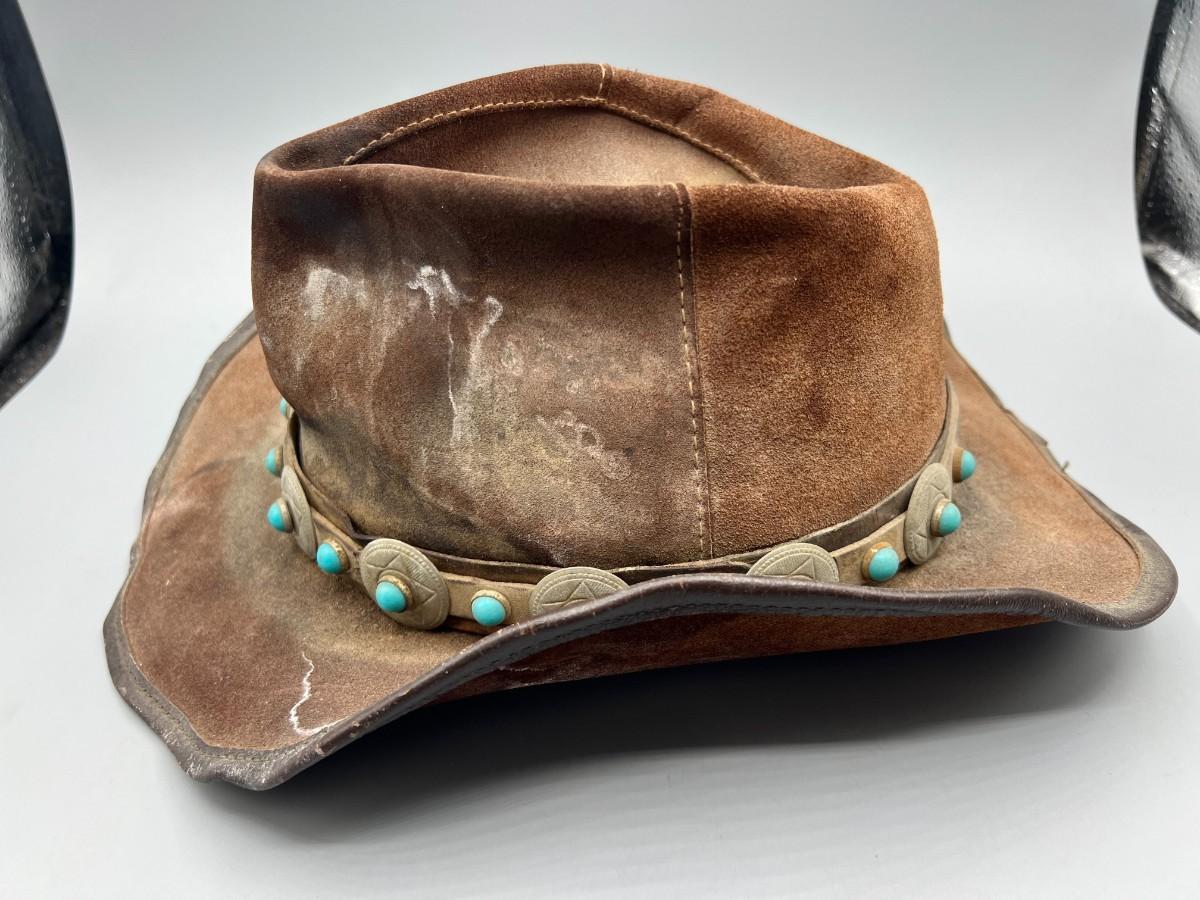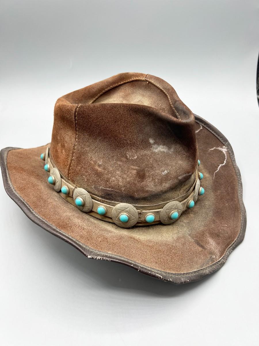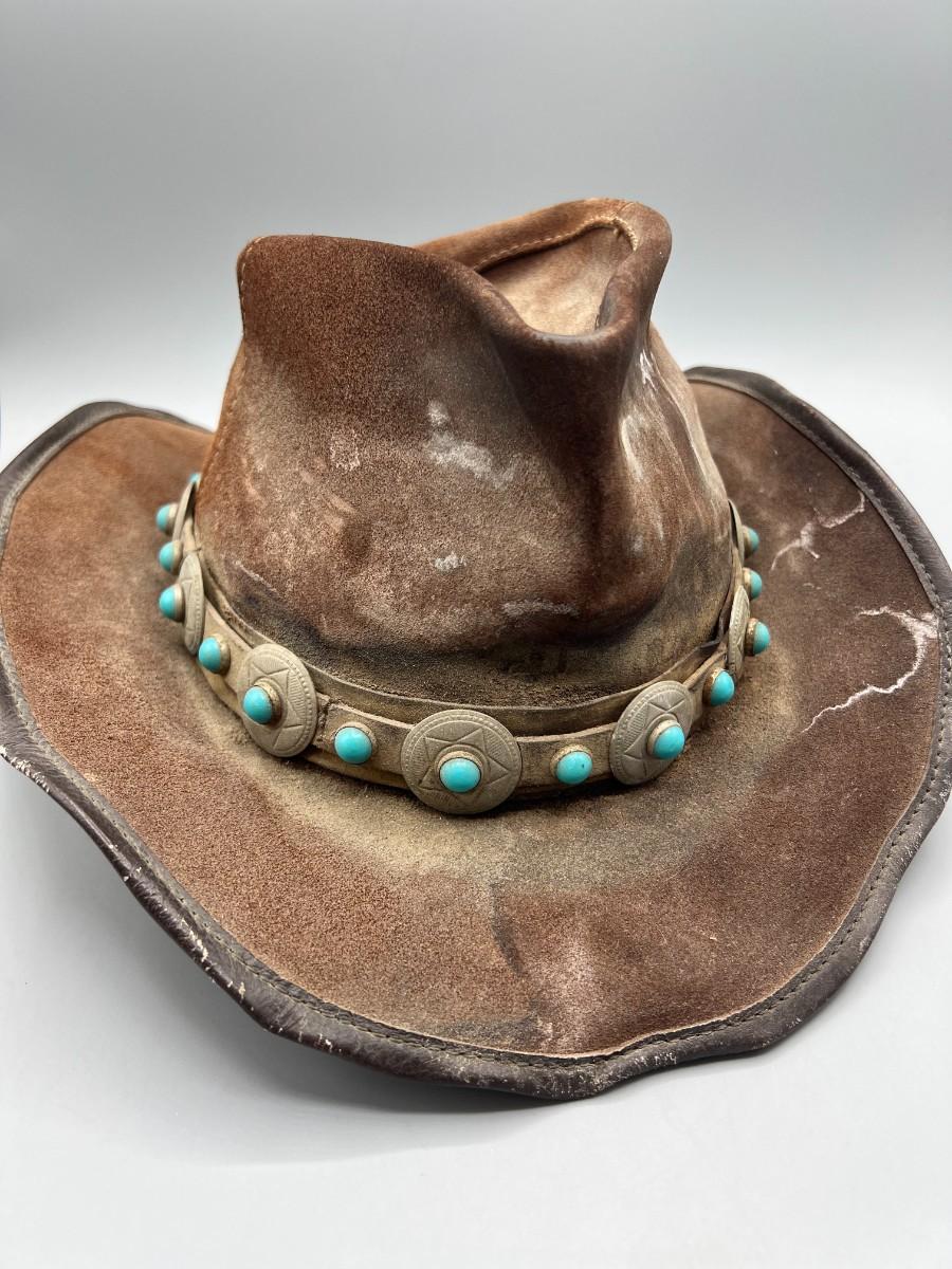 Vintage Winfield Cover Co. San Francisco Brown Leather Cowboy Hat with Southwestern Accent. Worn condition.