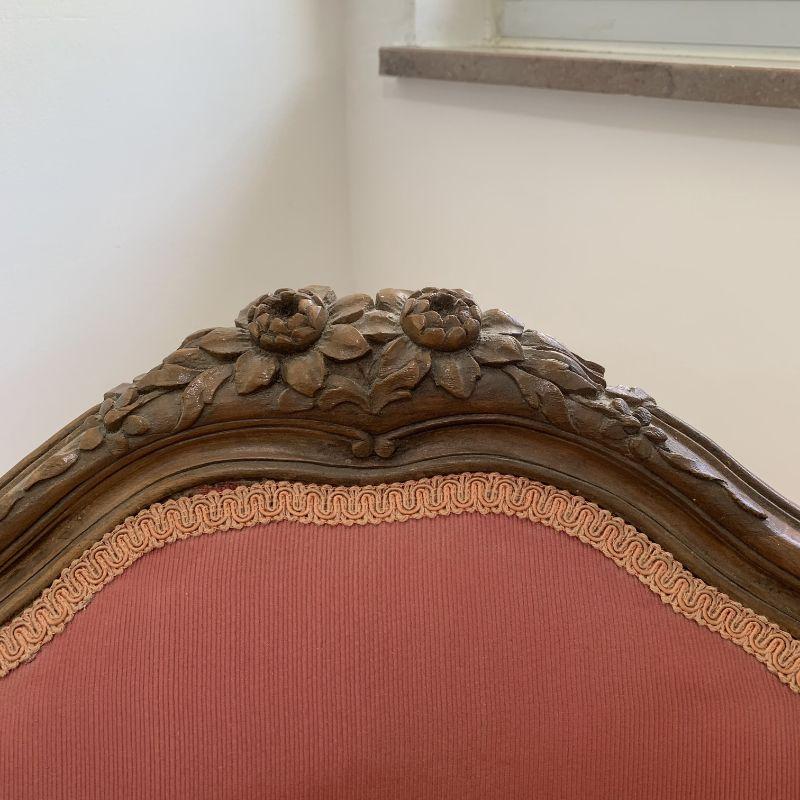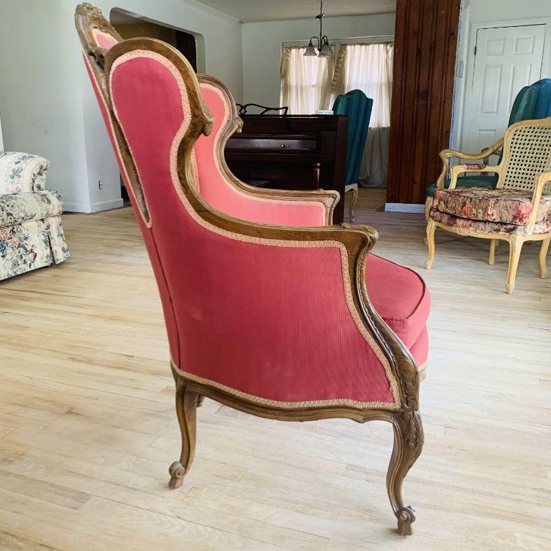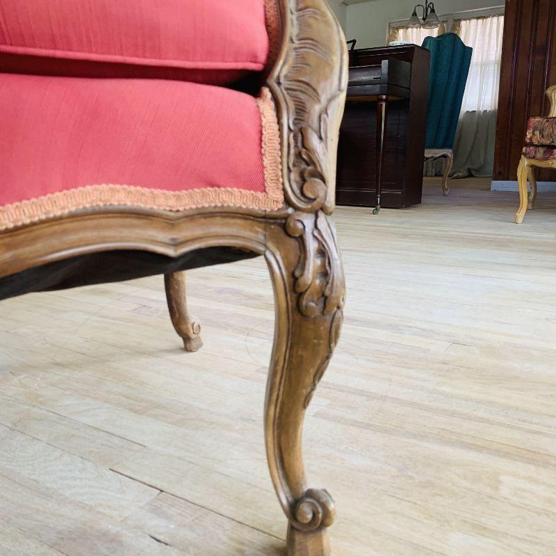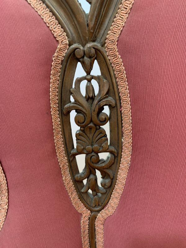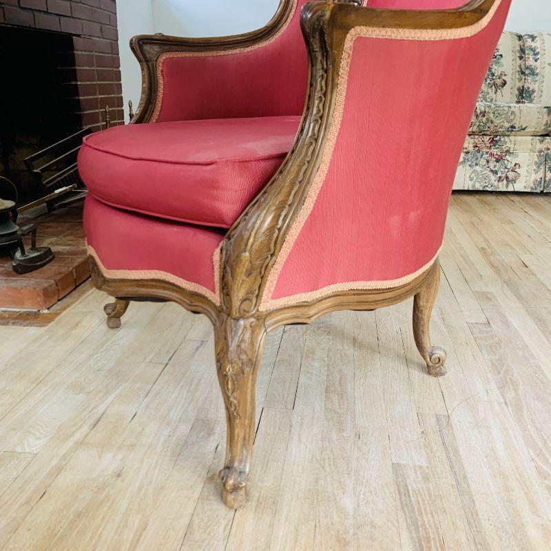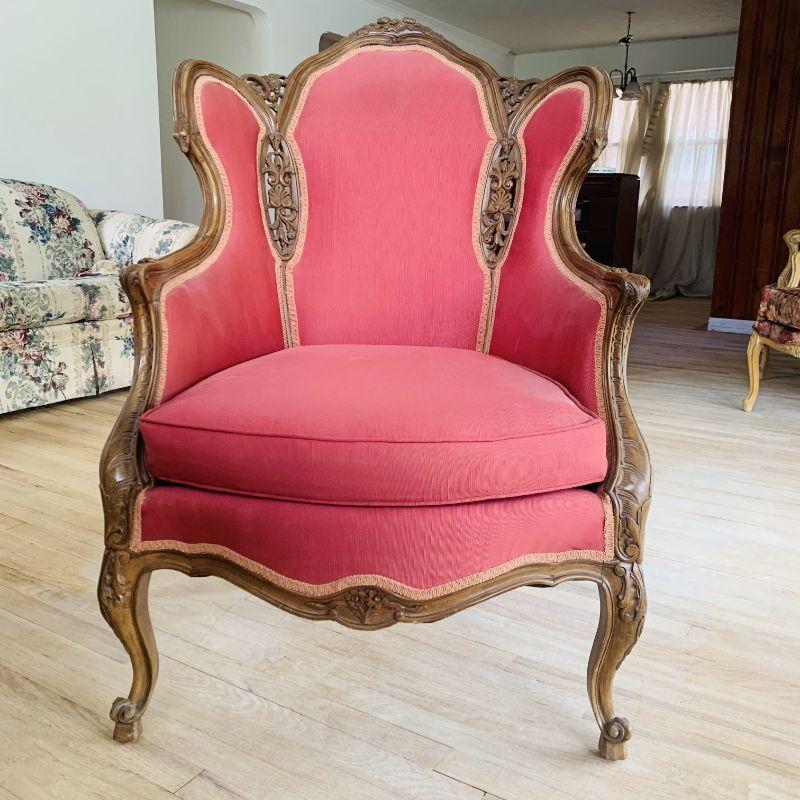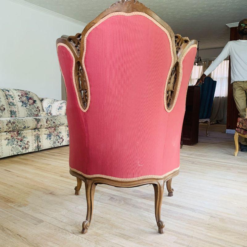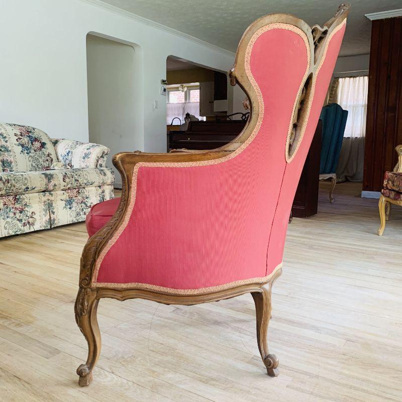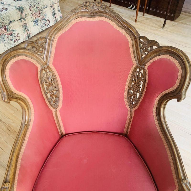 Wingchair from the 1940s was richly carved of maple and has music and figural motifs.
