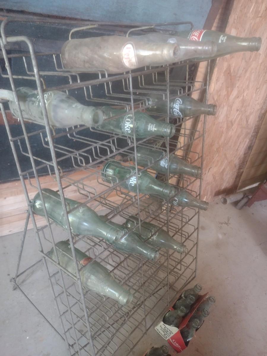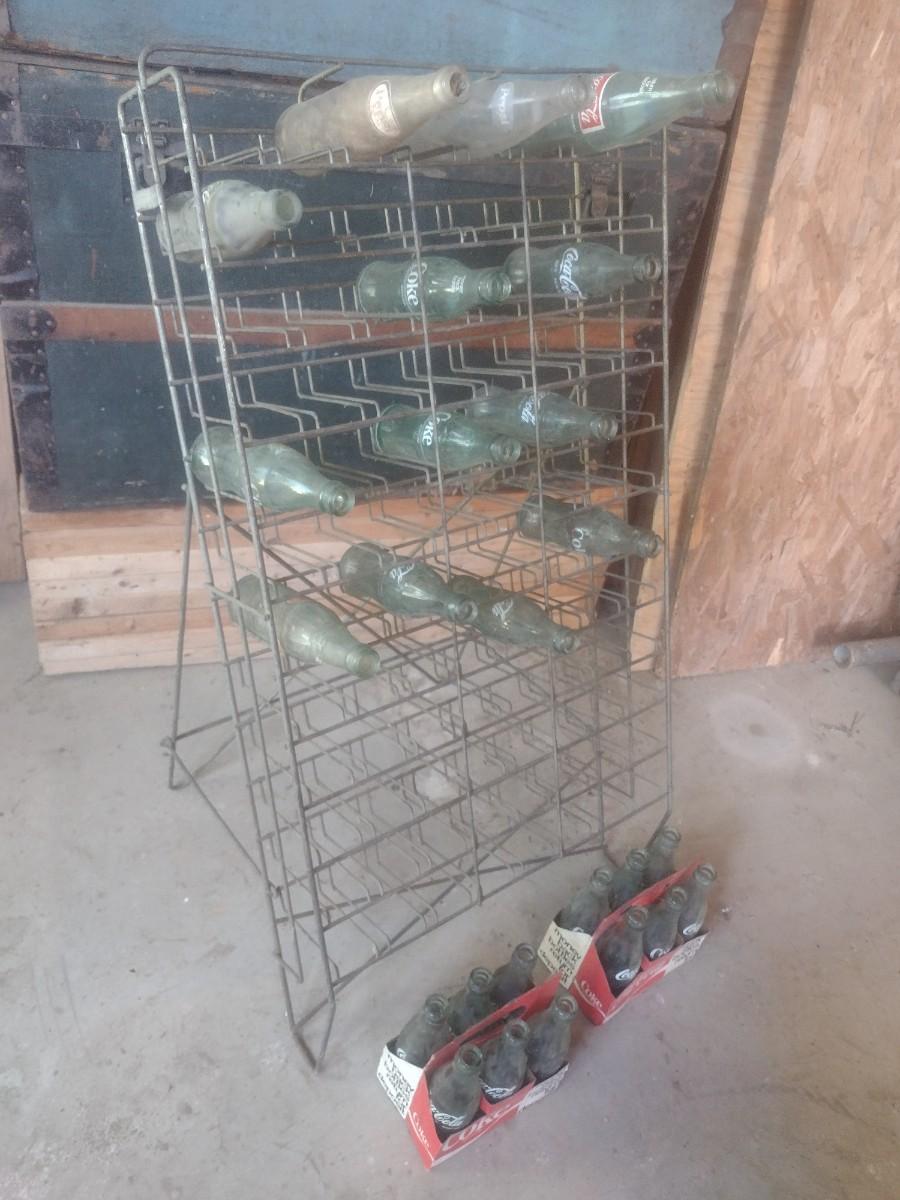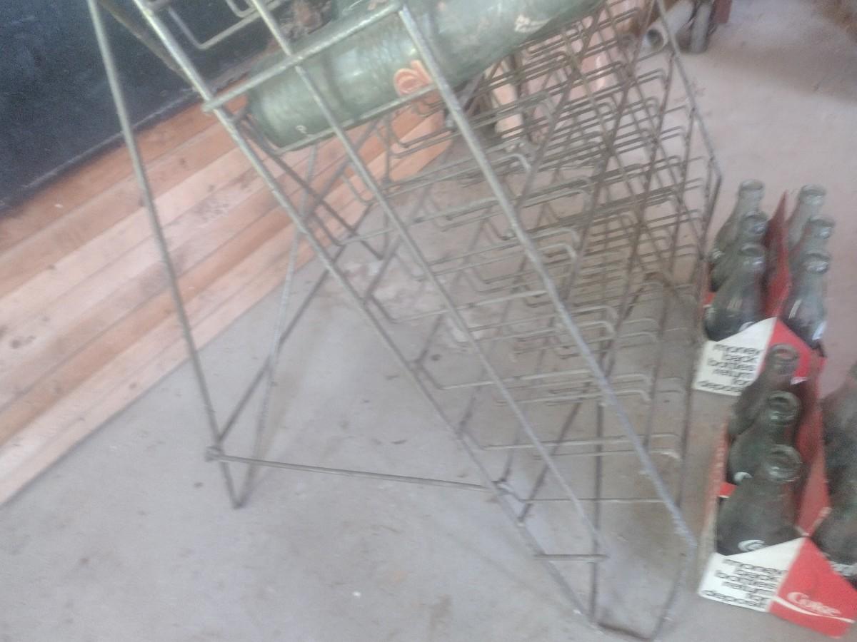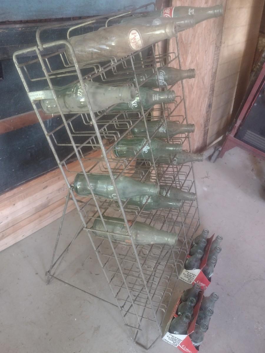 Vintage Wire Frame Soda Bottle Display Rack with Mixed Brand Bottles