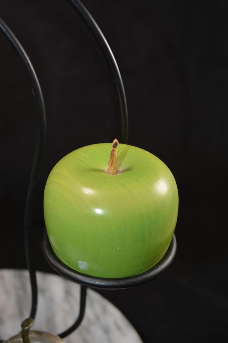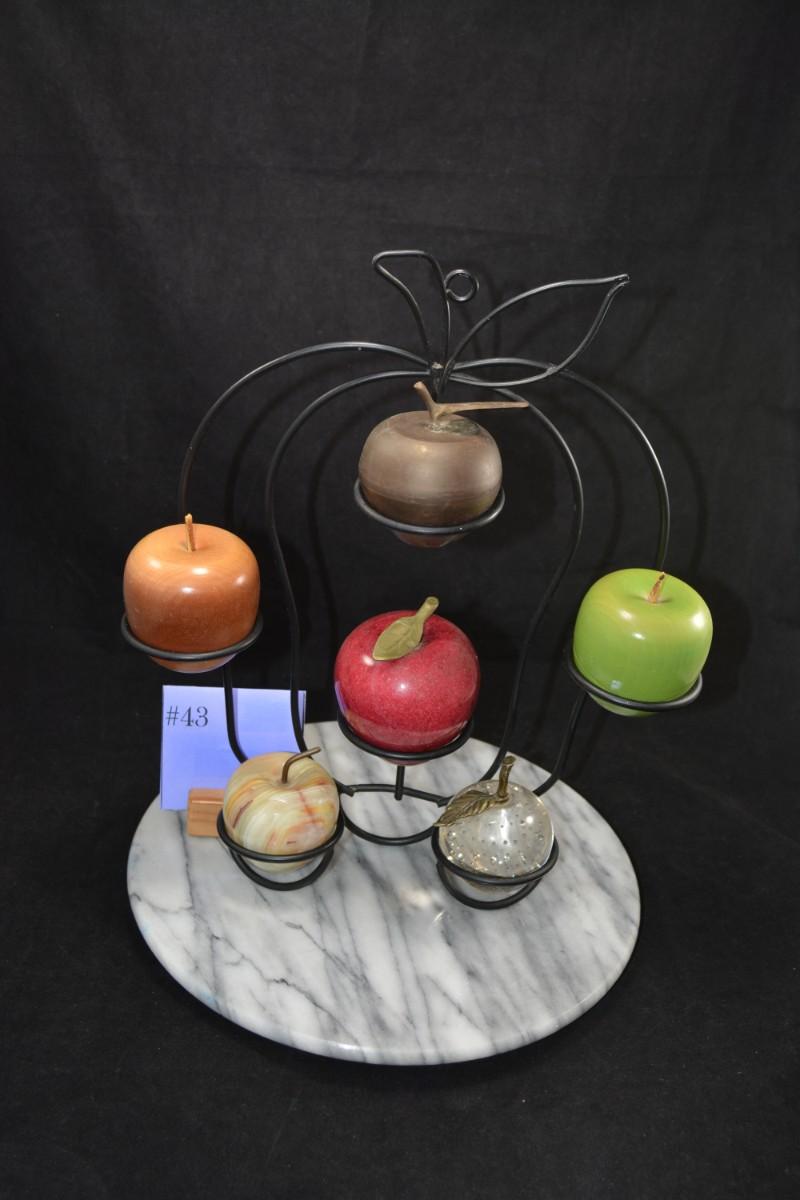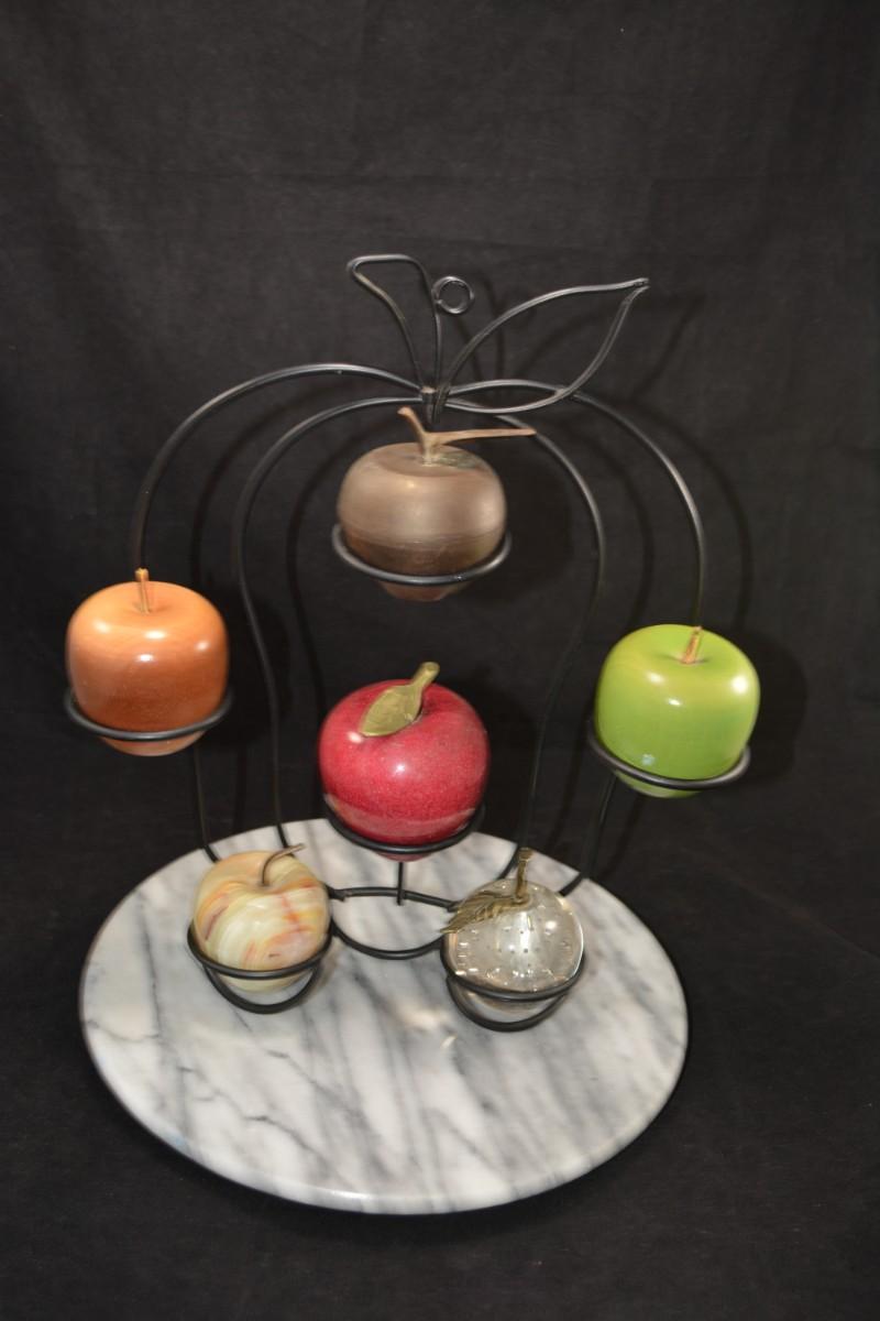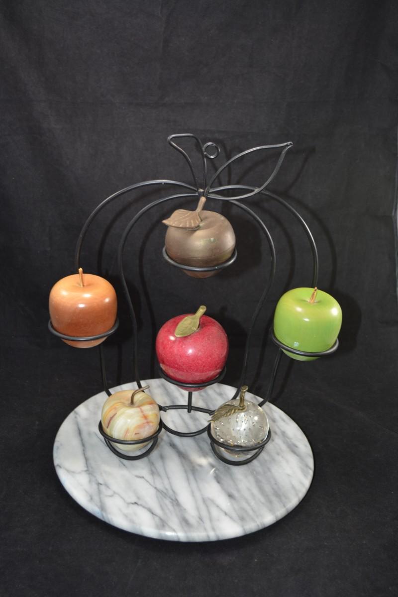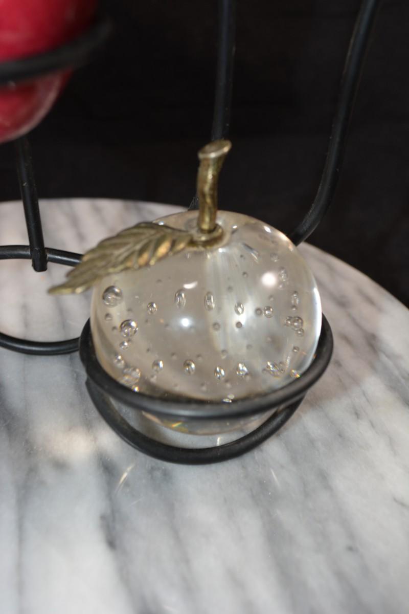 Brass, wood, glass, onyx, and marble. The brass apple unscrews for hiding goodies!